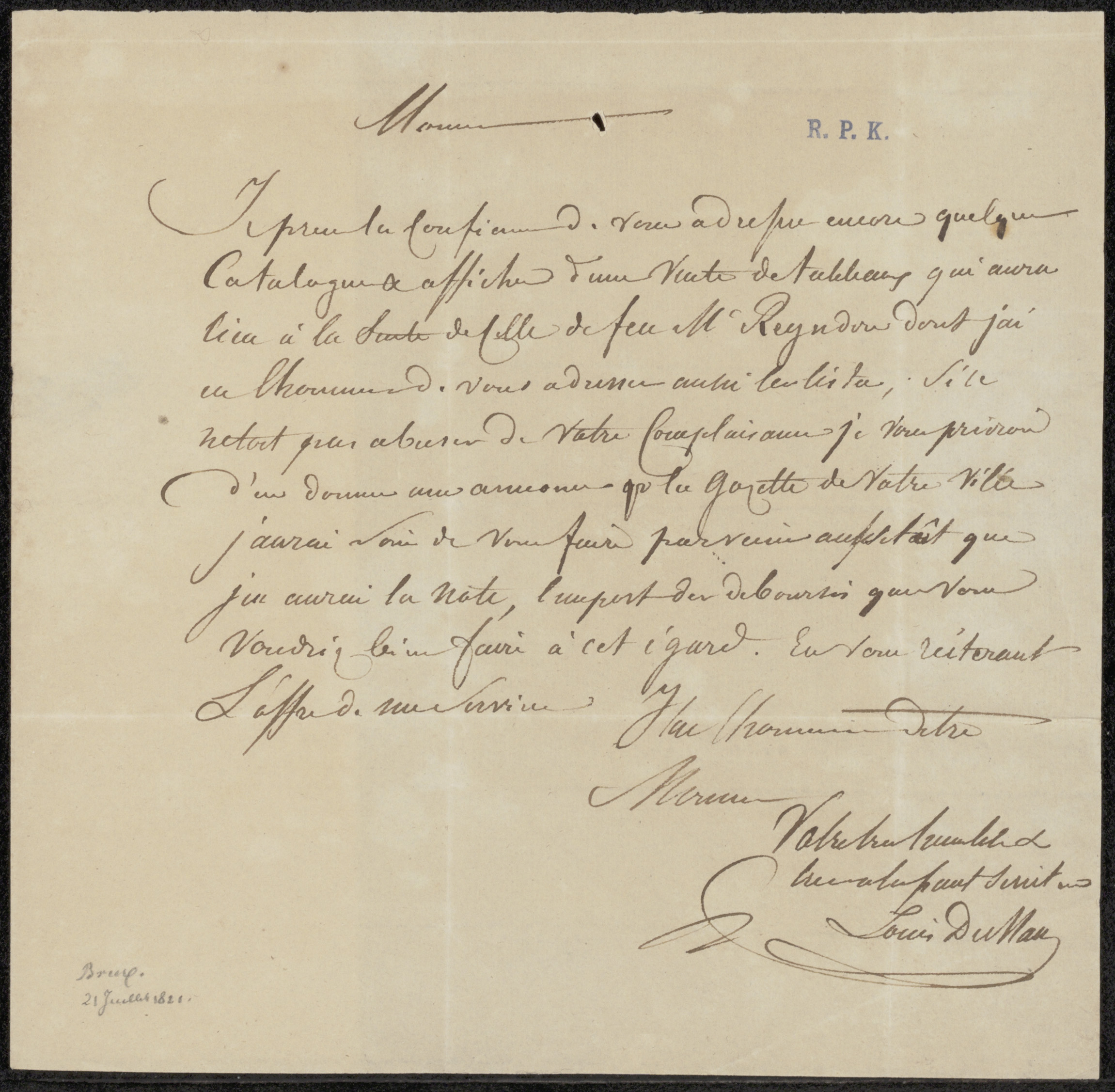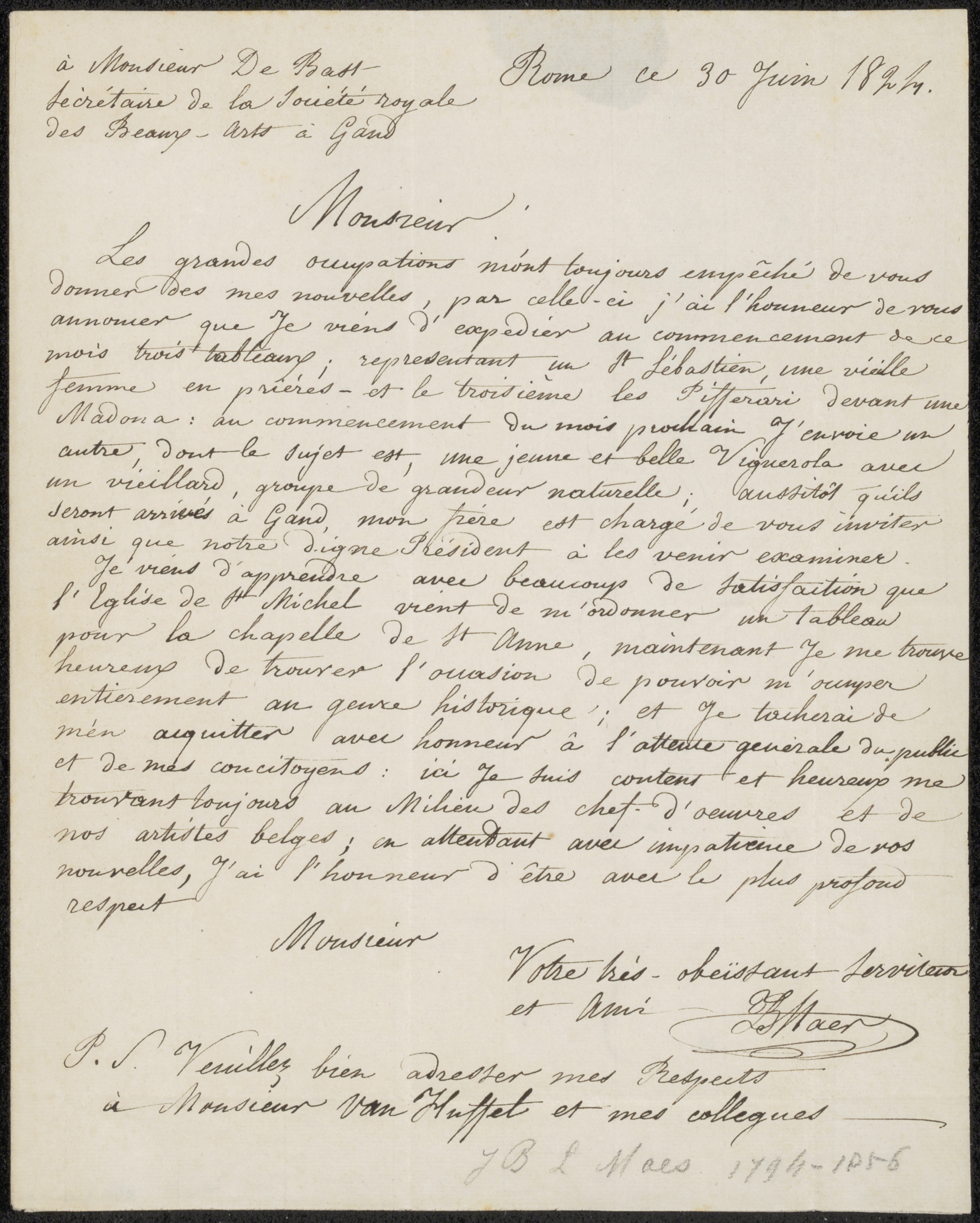 Brief aan Liévin Amand Marie De Bast, secretaris van...