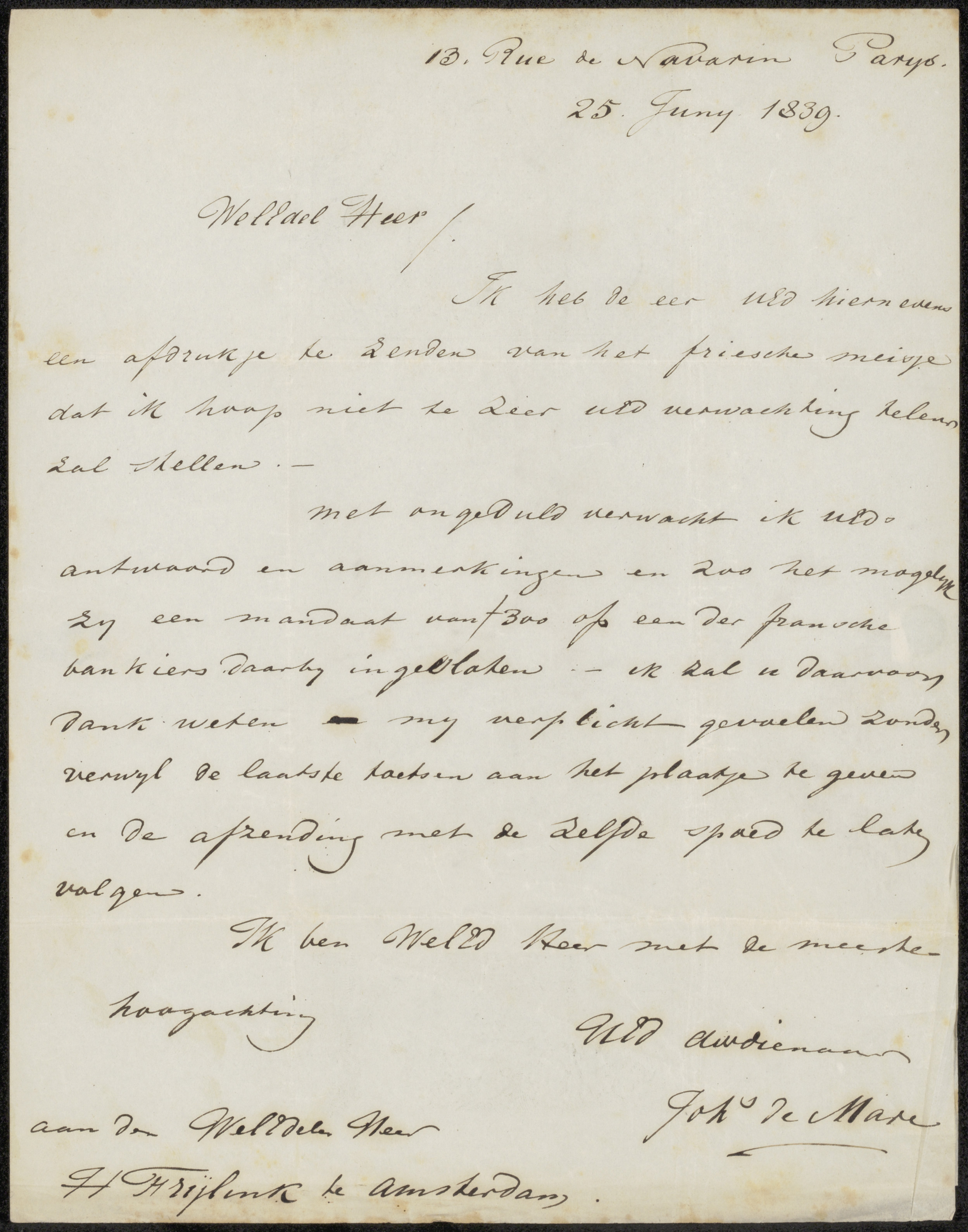 Brief aan Hendrik Frijlink