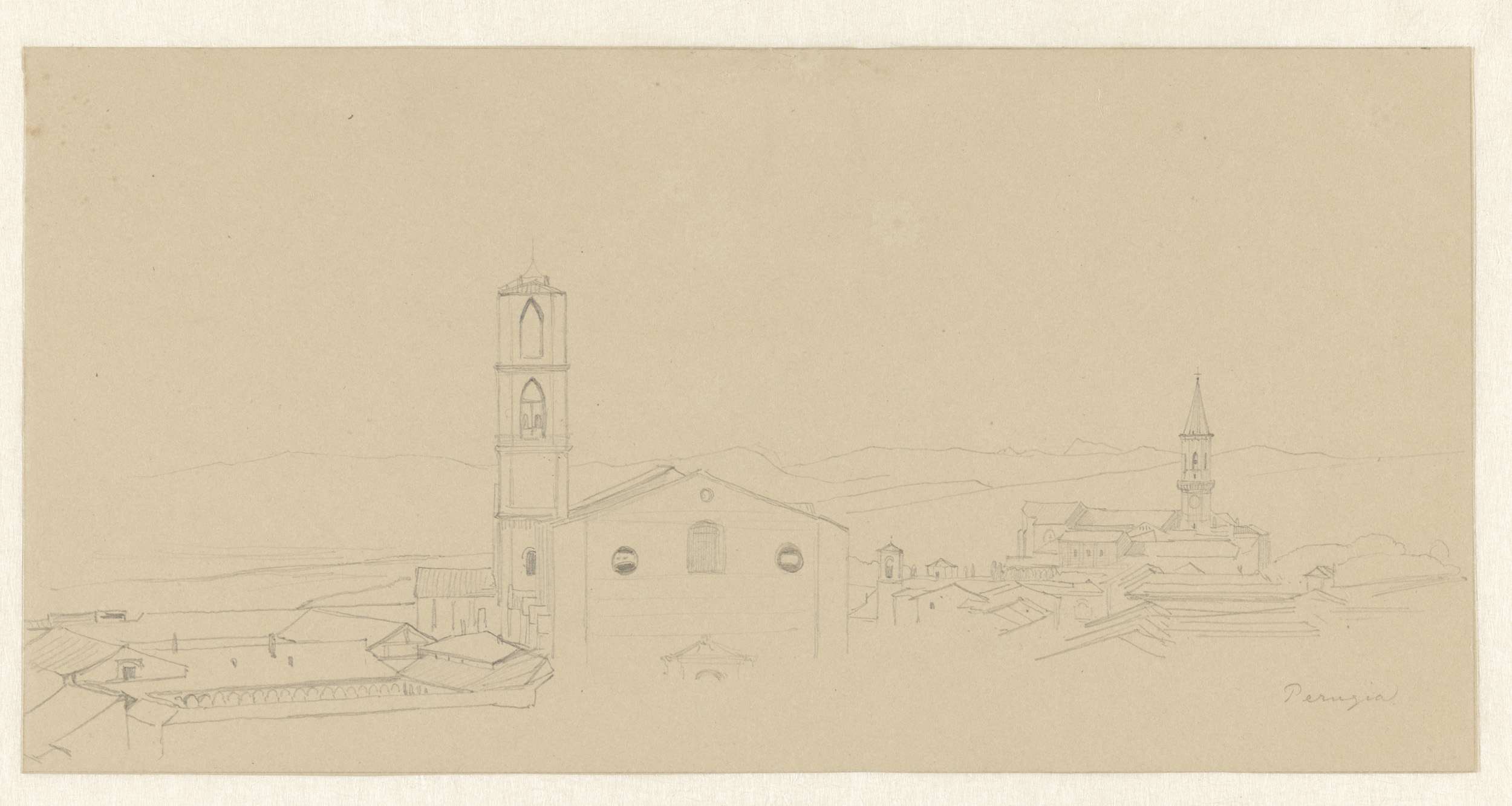 Gezicht over de daken van Perugia naar S. Pietro, li...