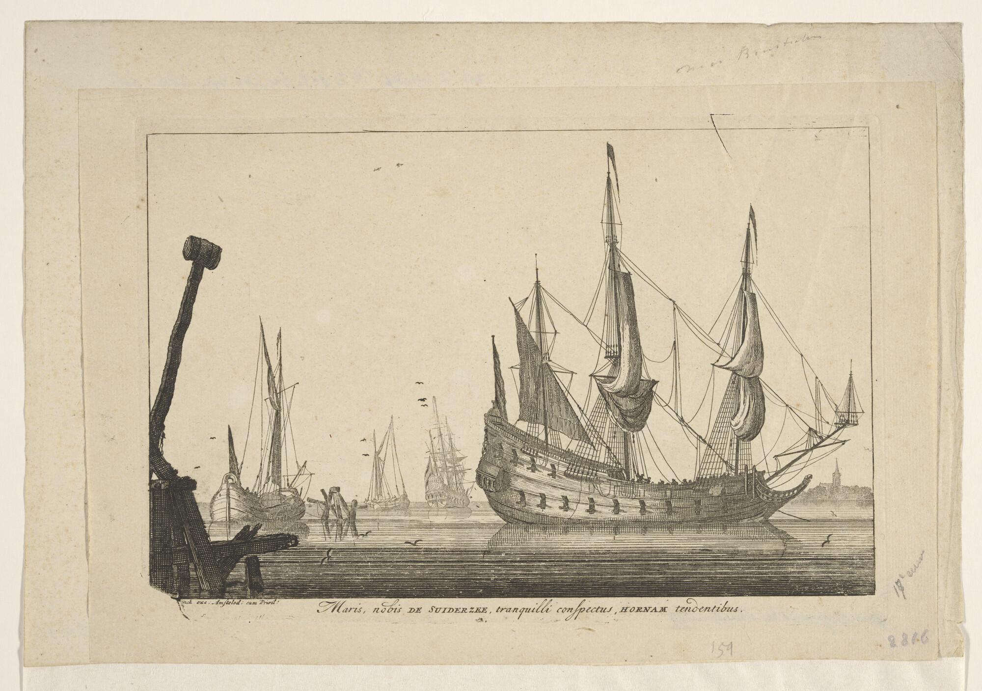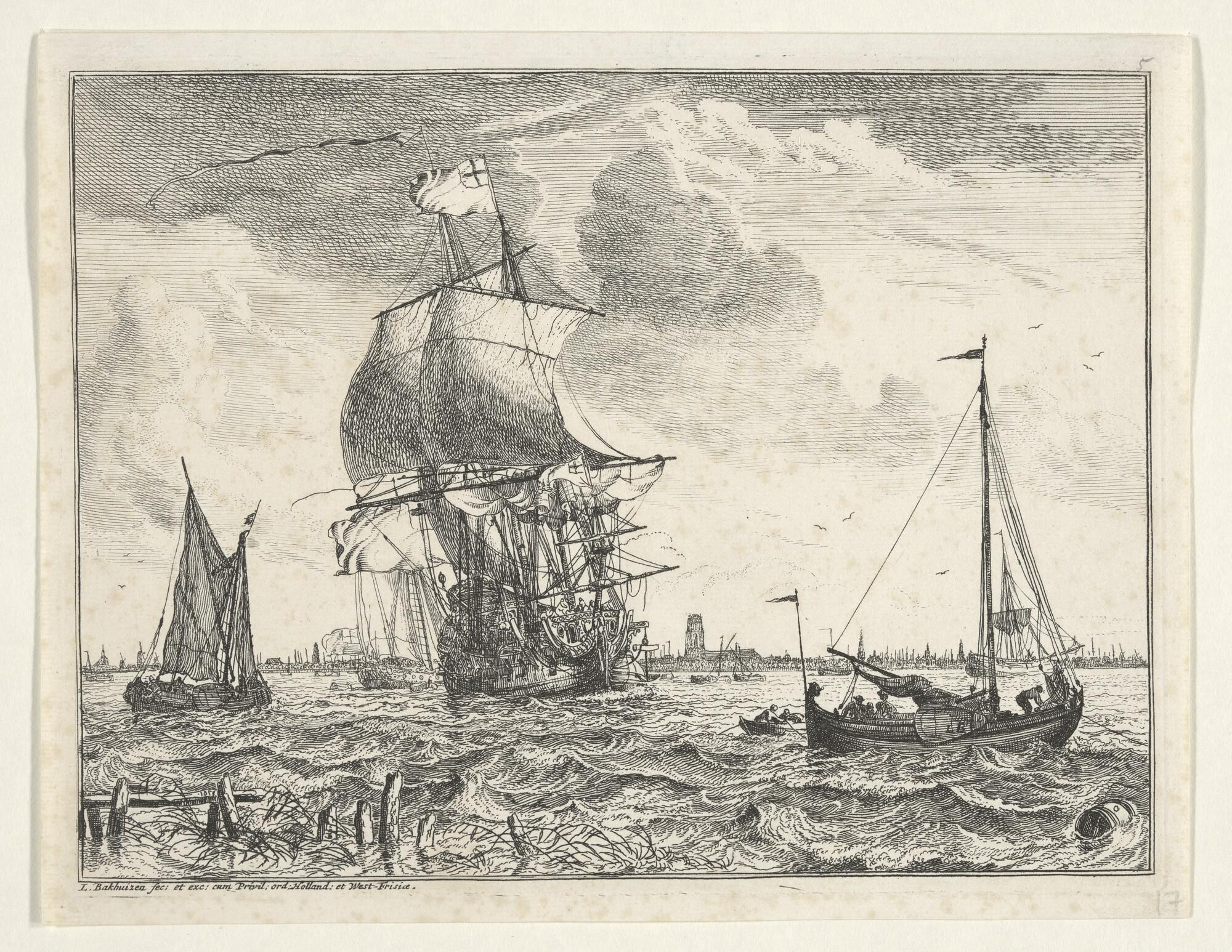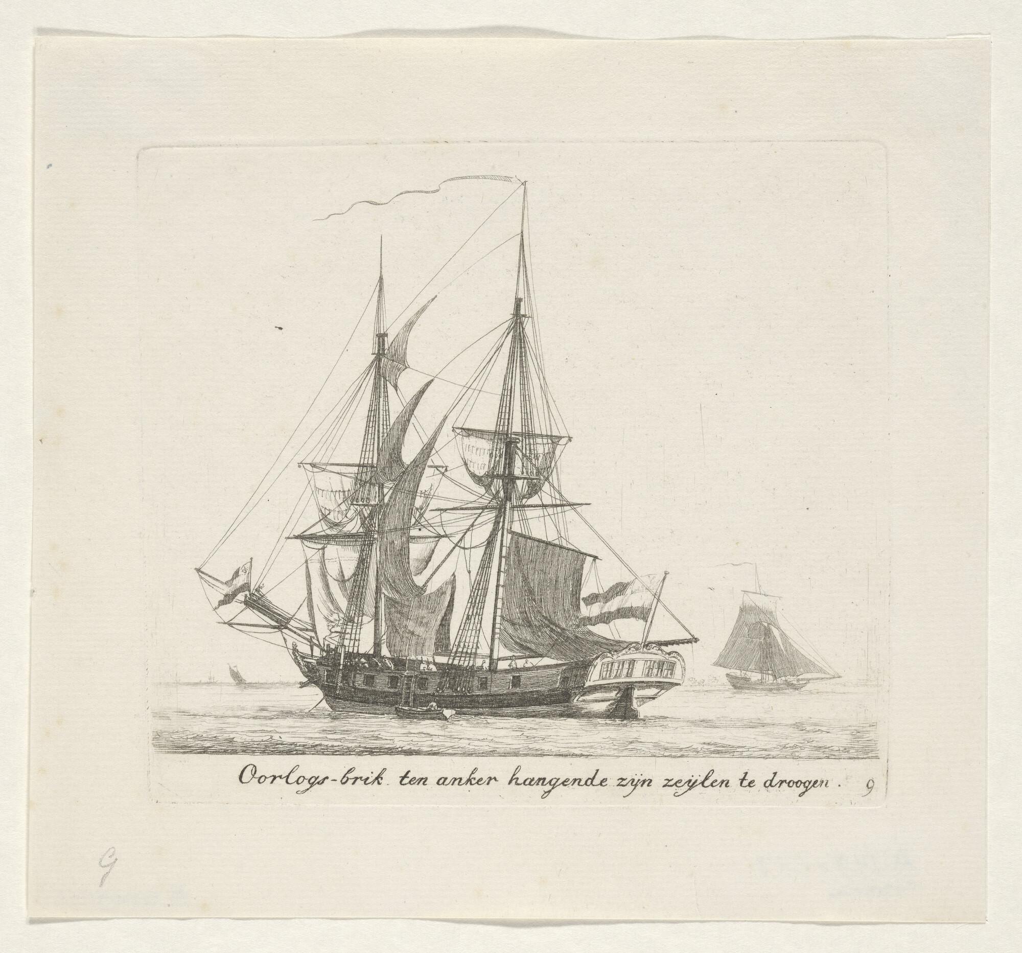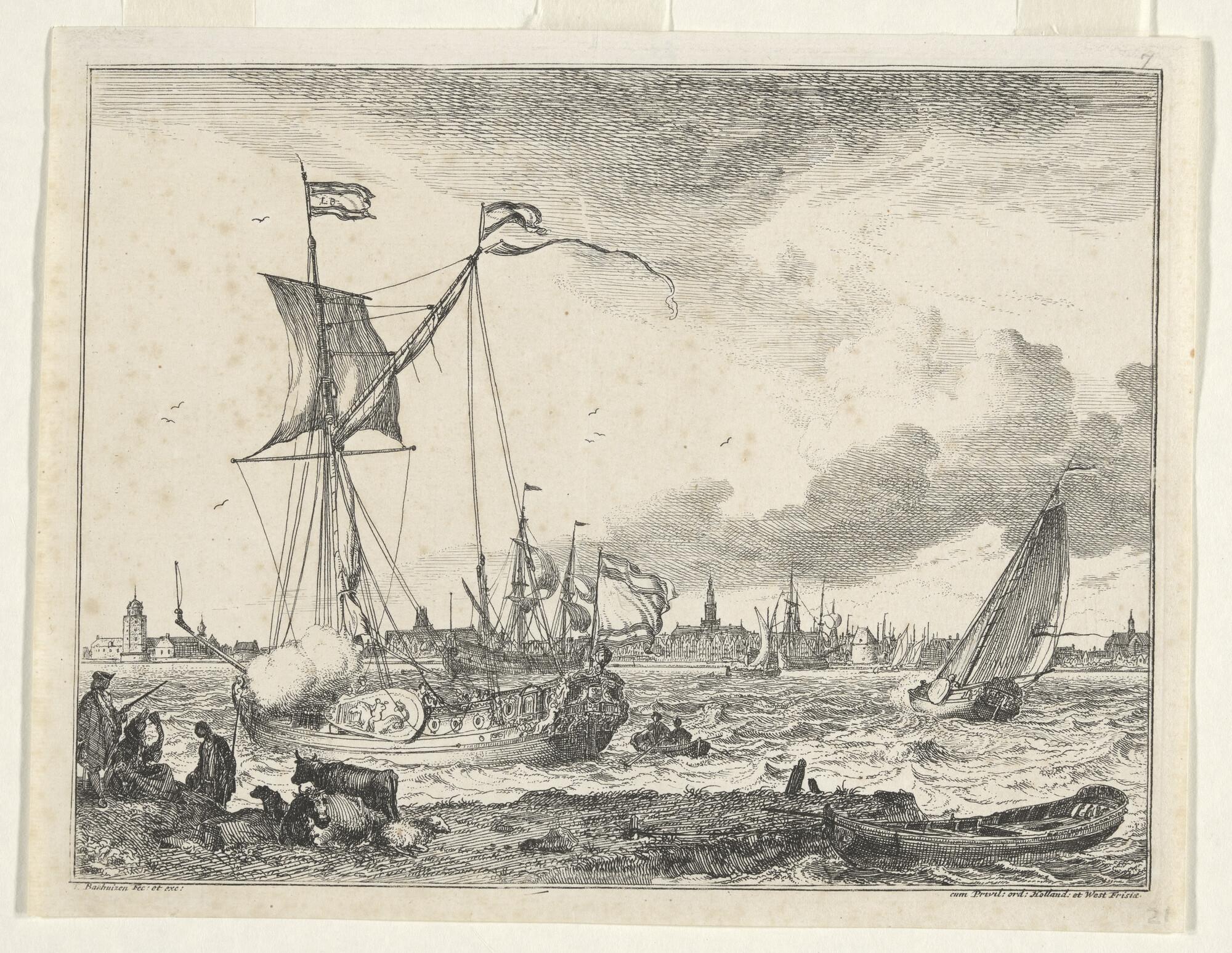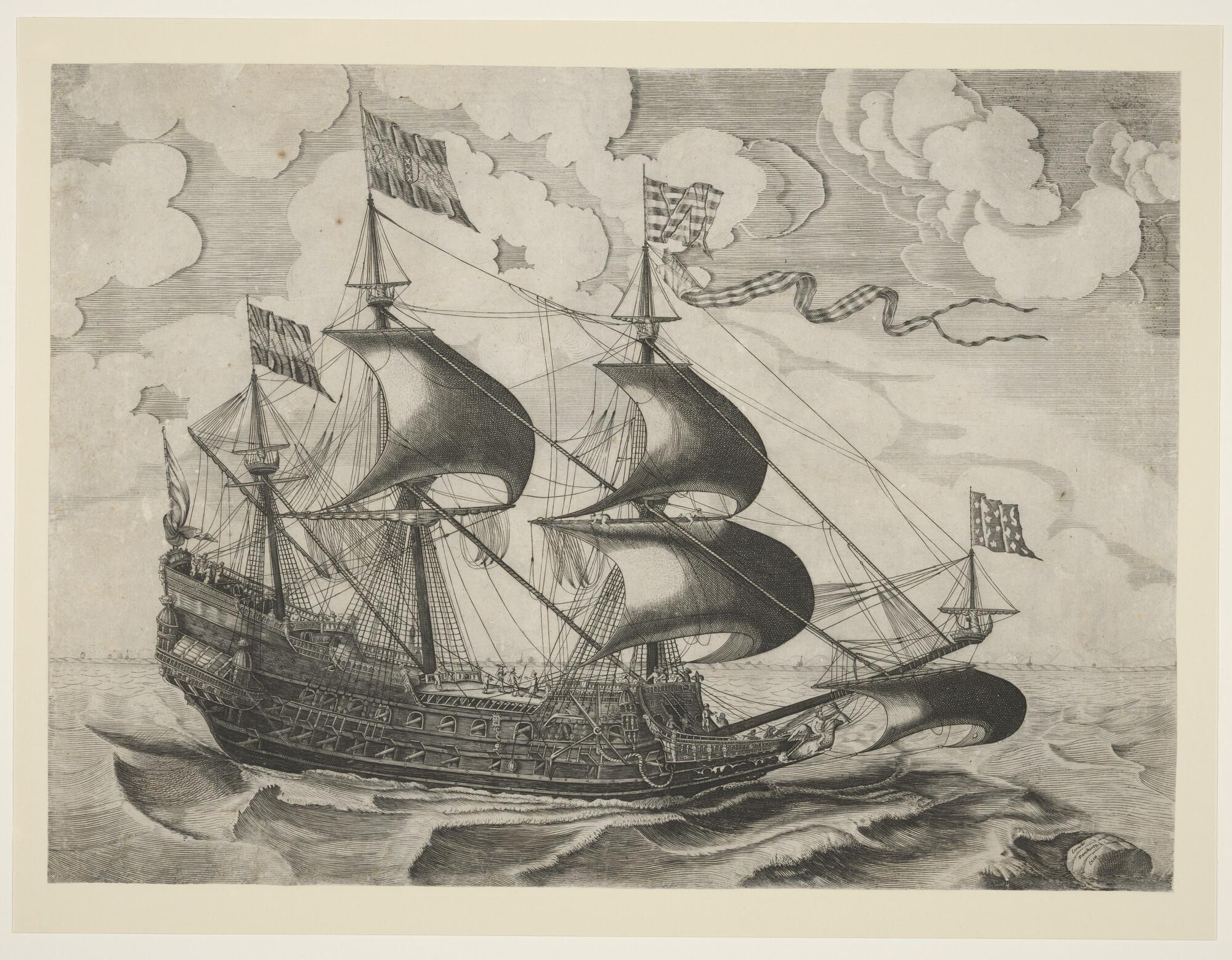 Prent oorlogsschip onder Amsterdamse vlag