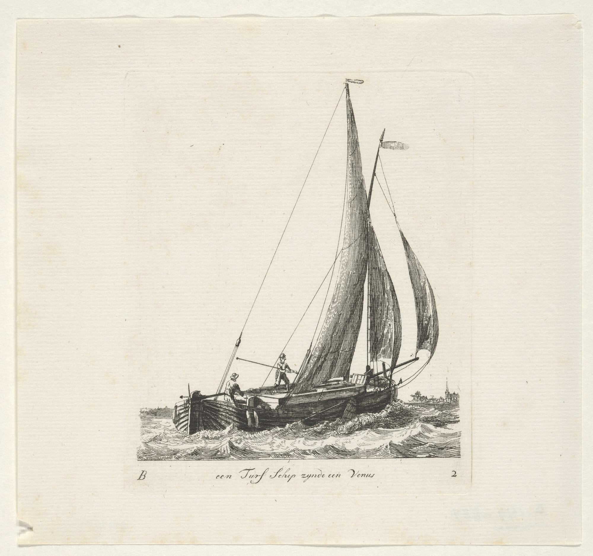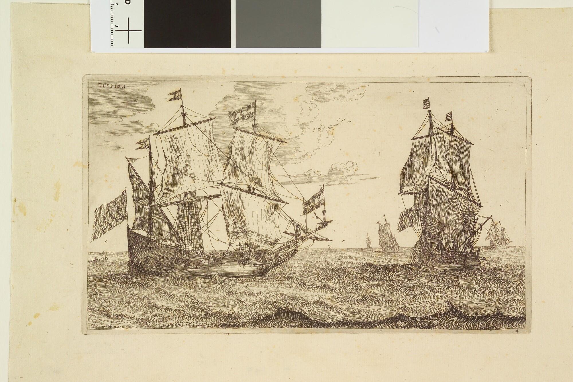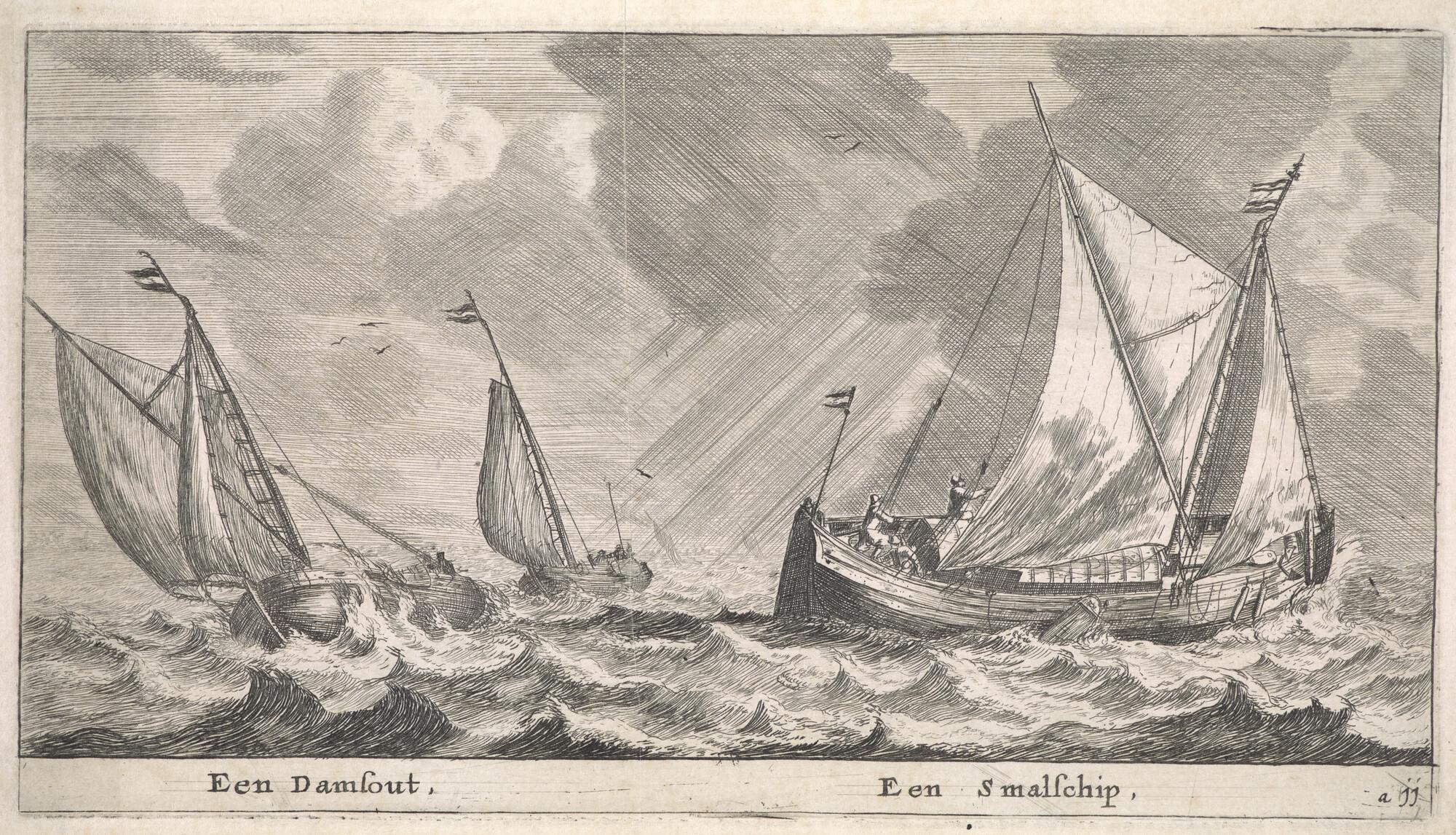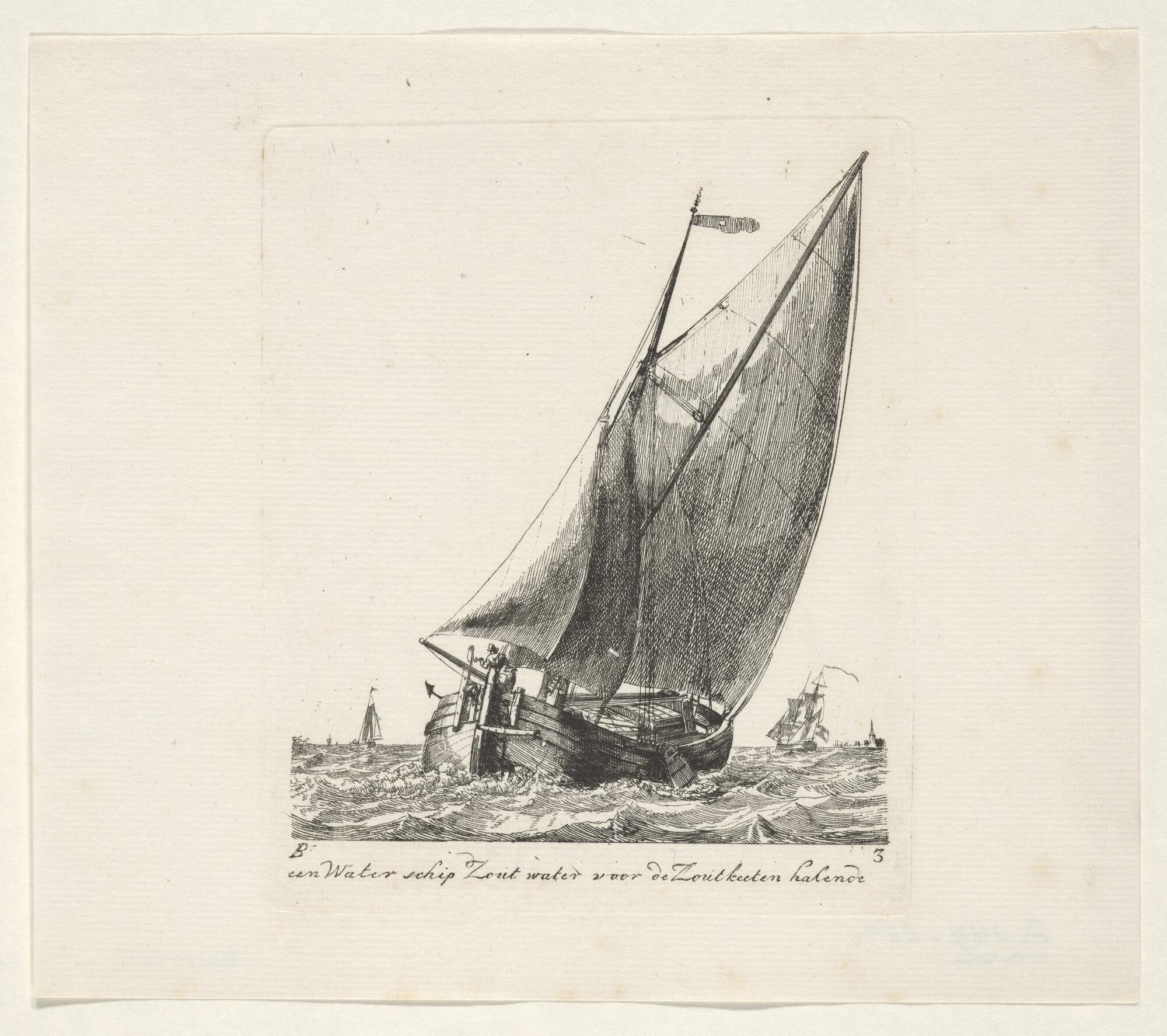 Twee fluitschepen in open water, waarvan een oversta...