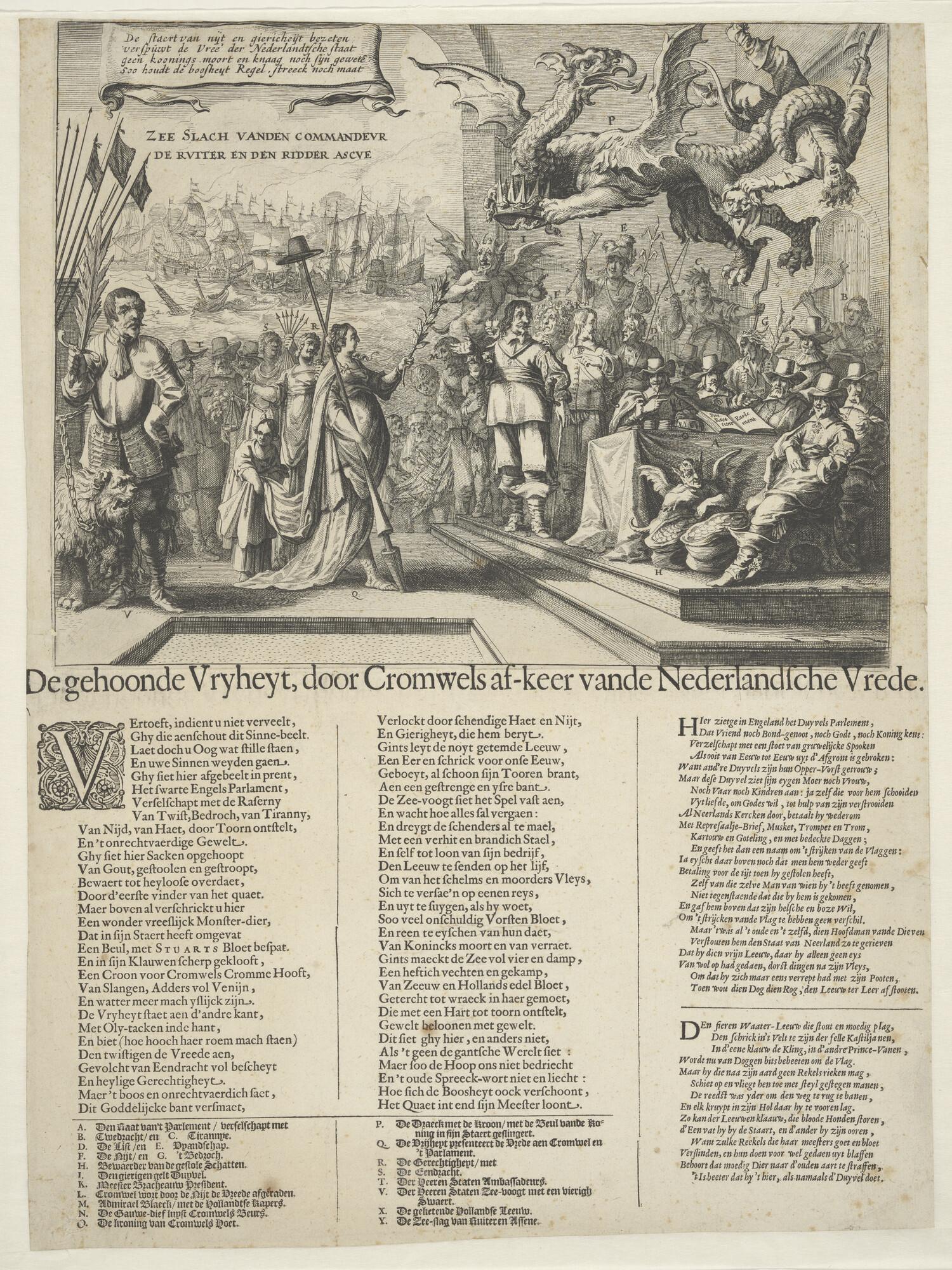 Spotprent met uitgebreid onderschrift op Cromwell en...