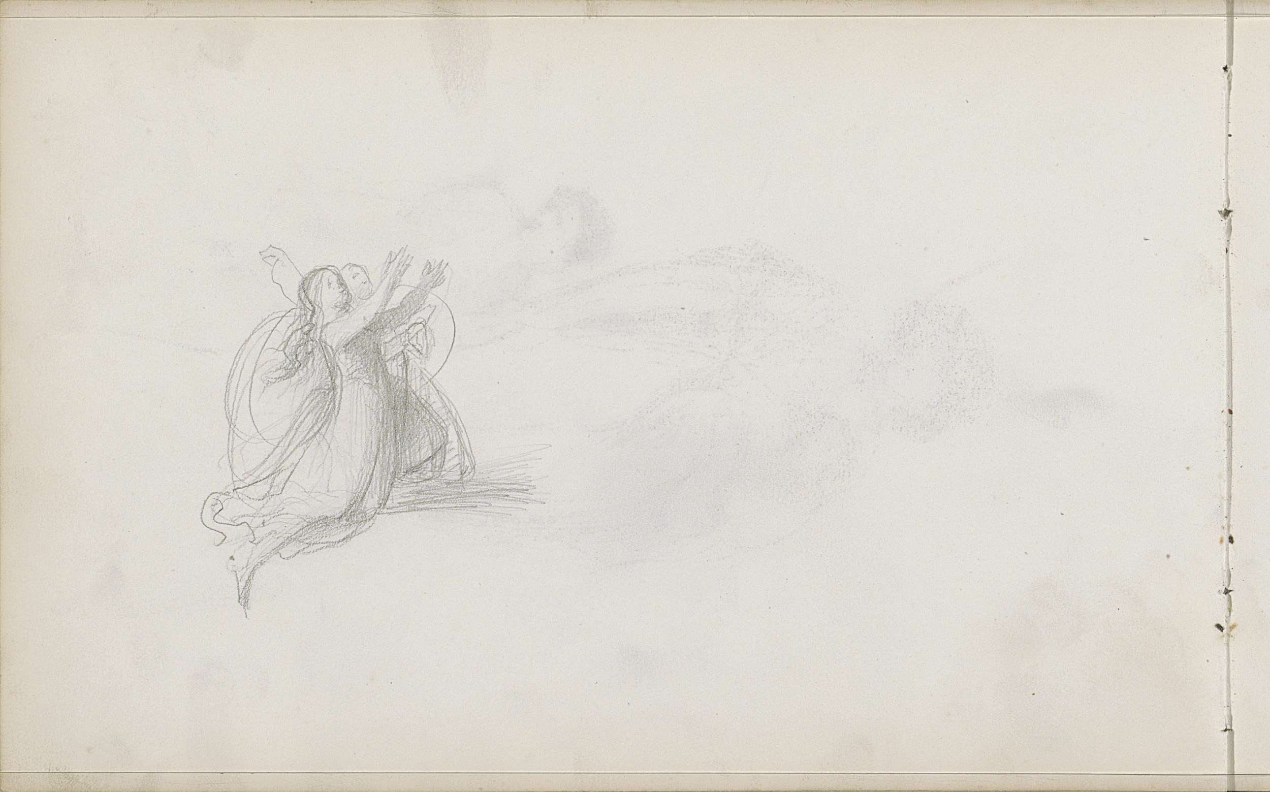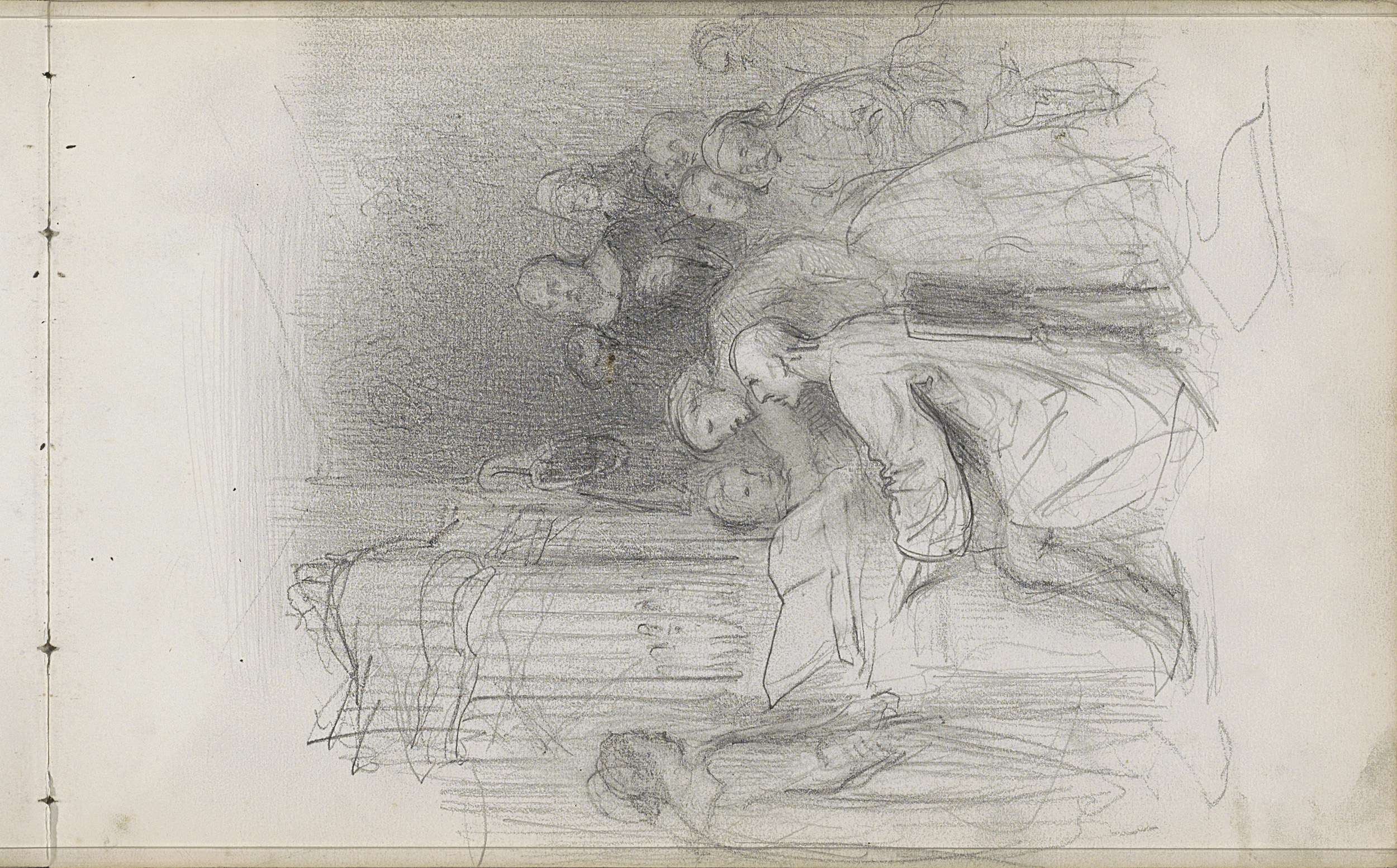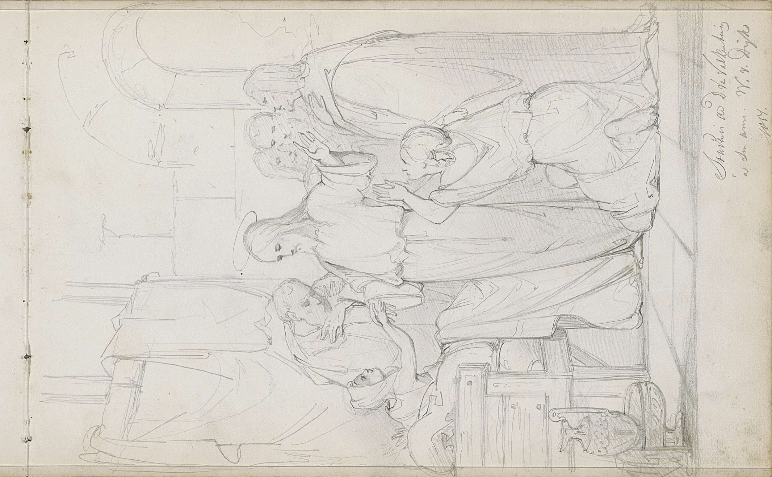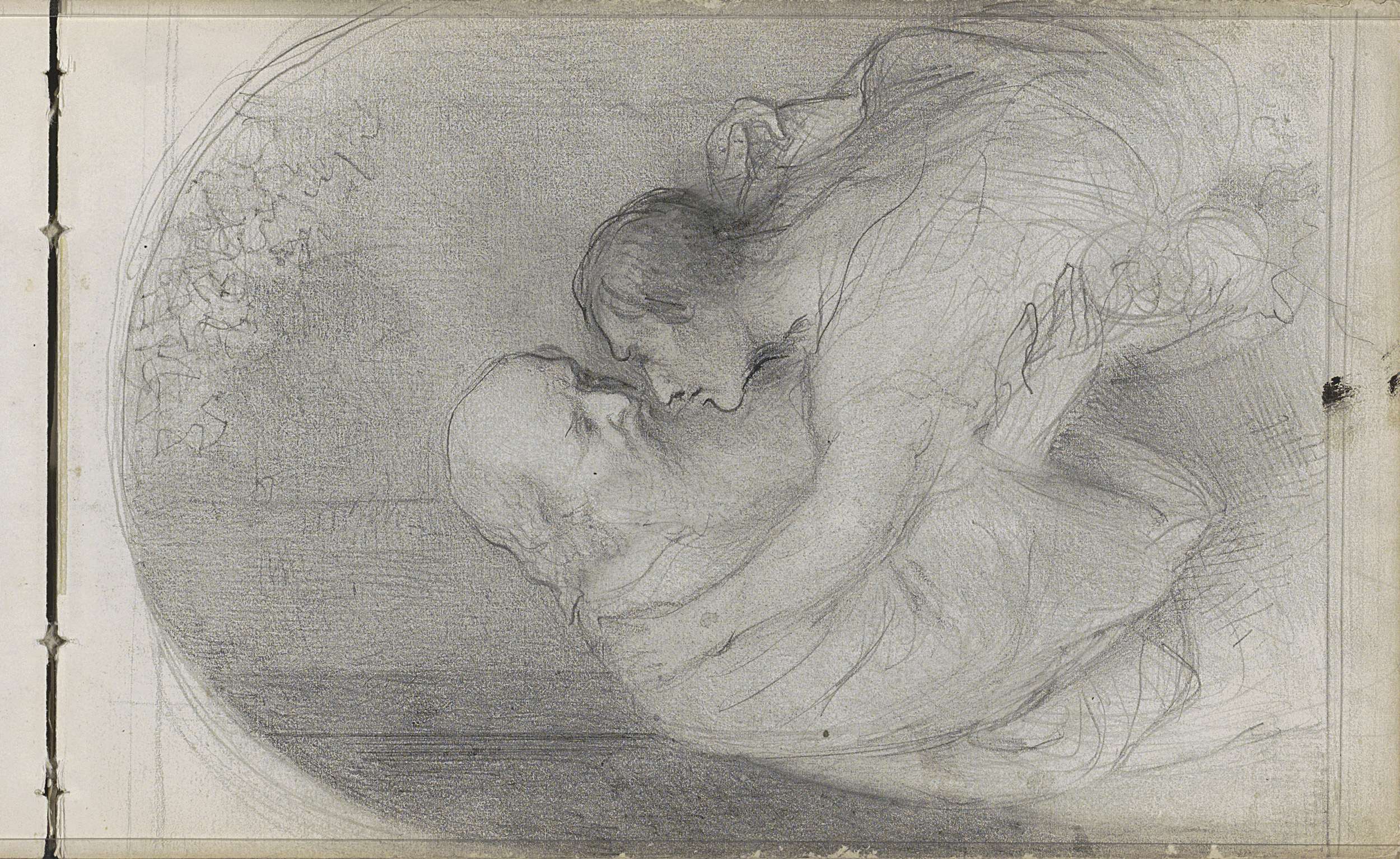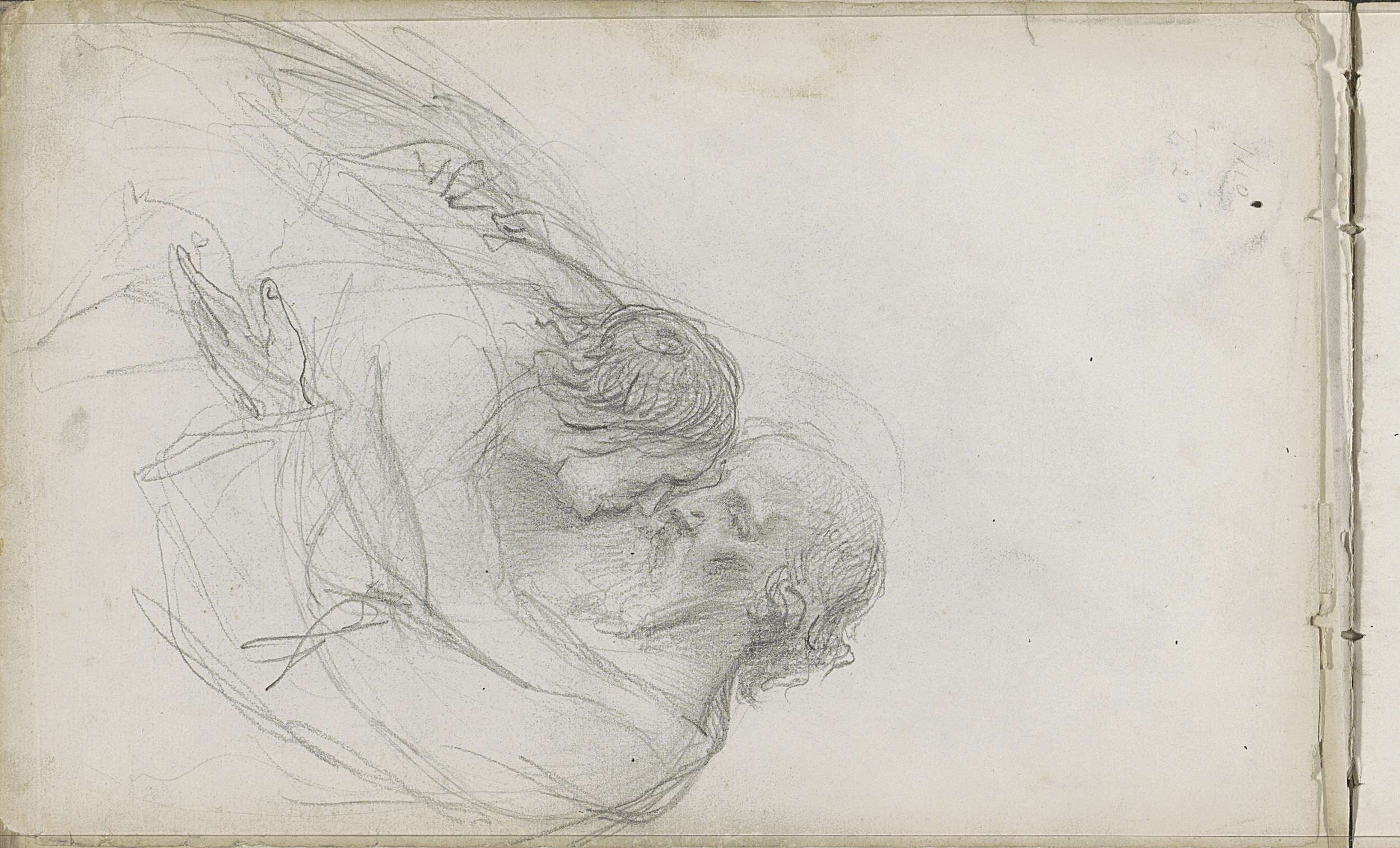 Vrouw, mogelijk een engel, buigend over twee ineenge...