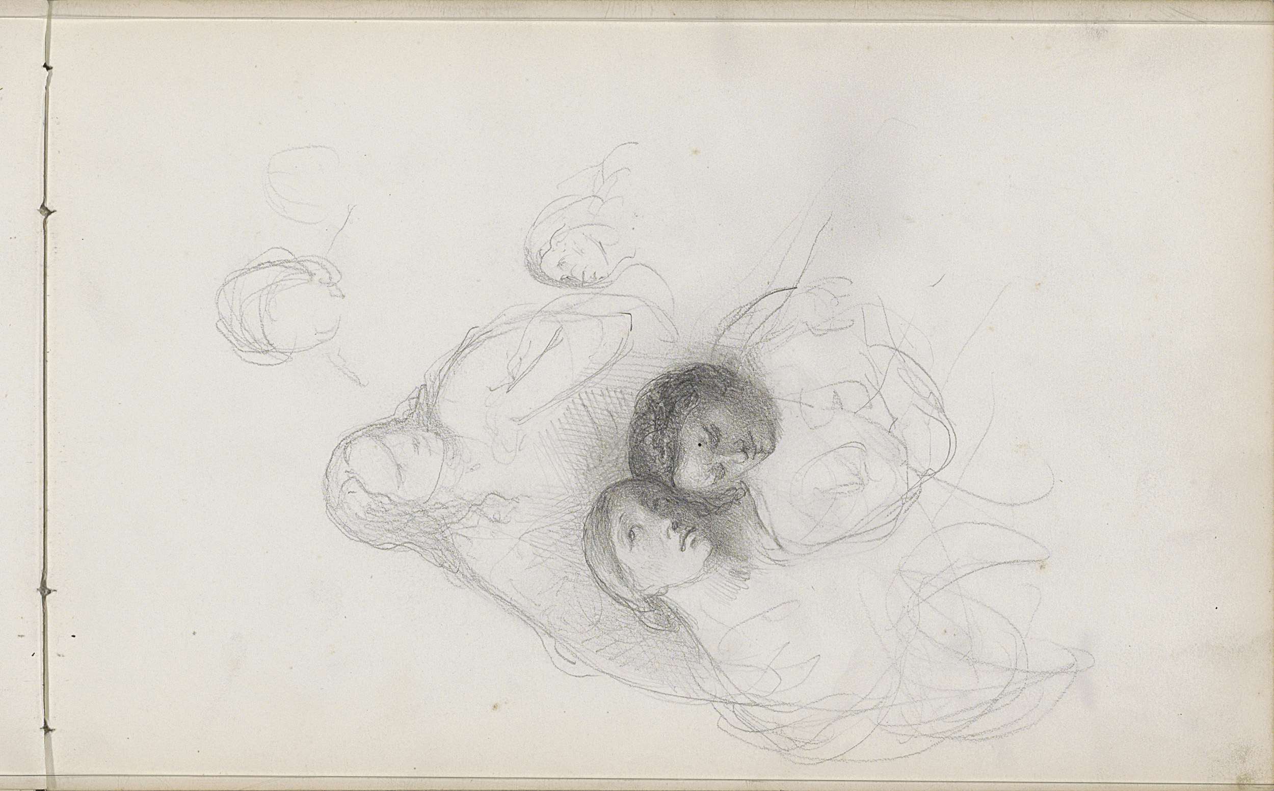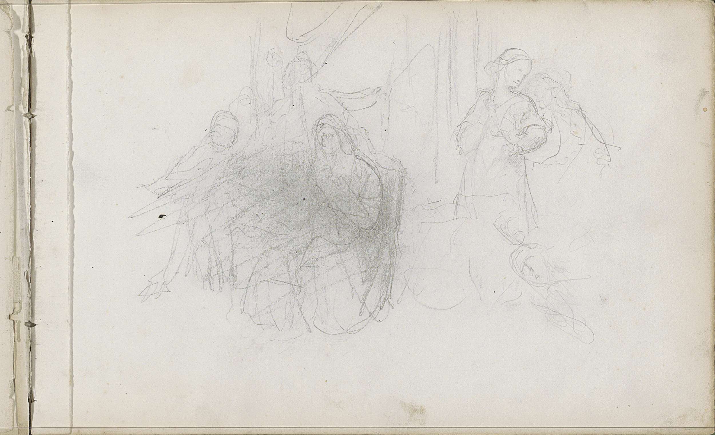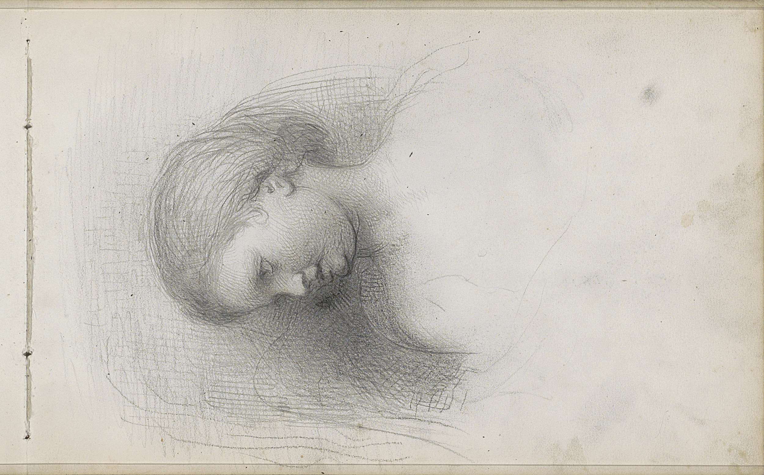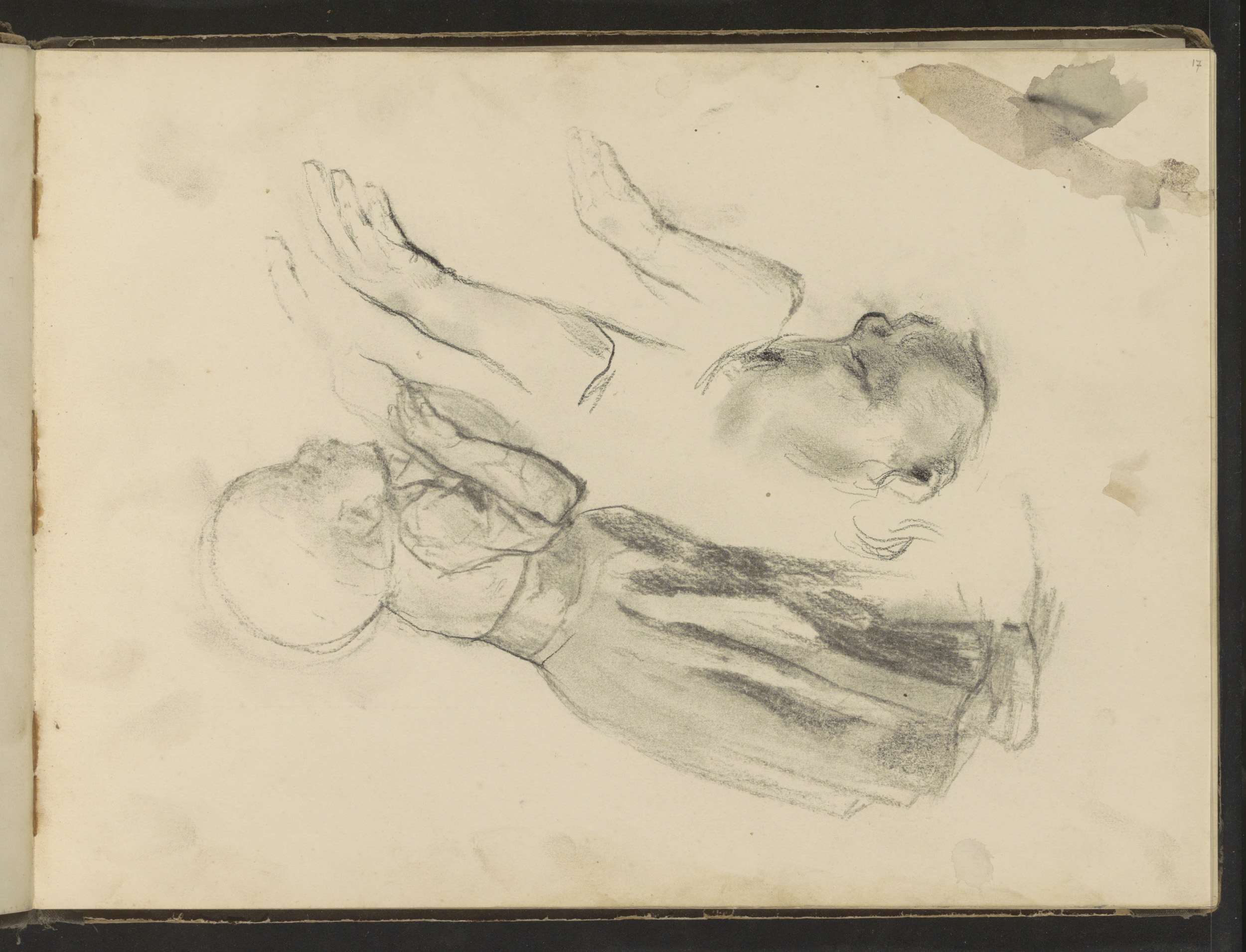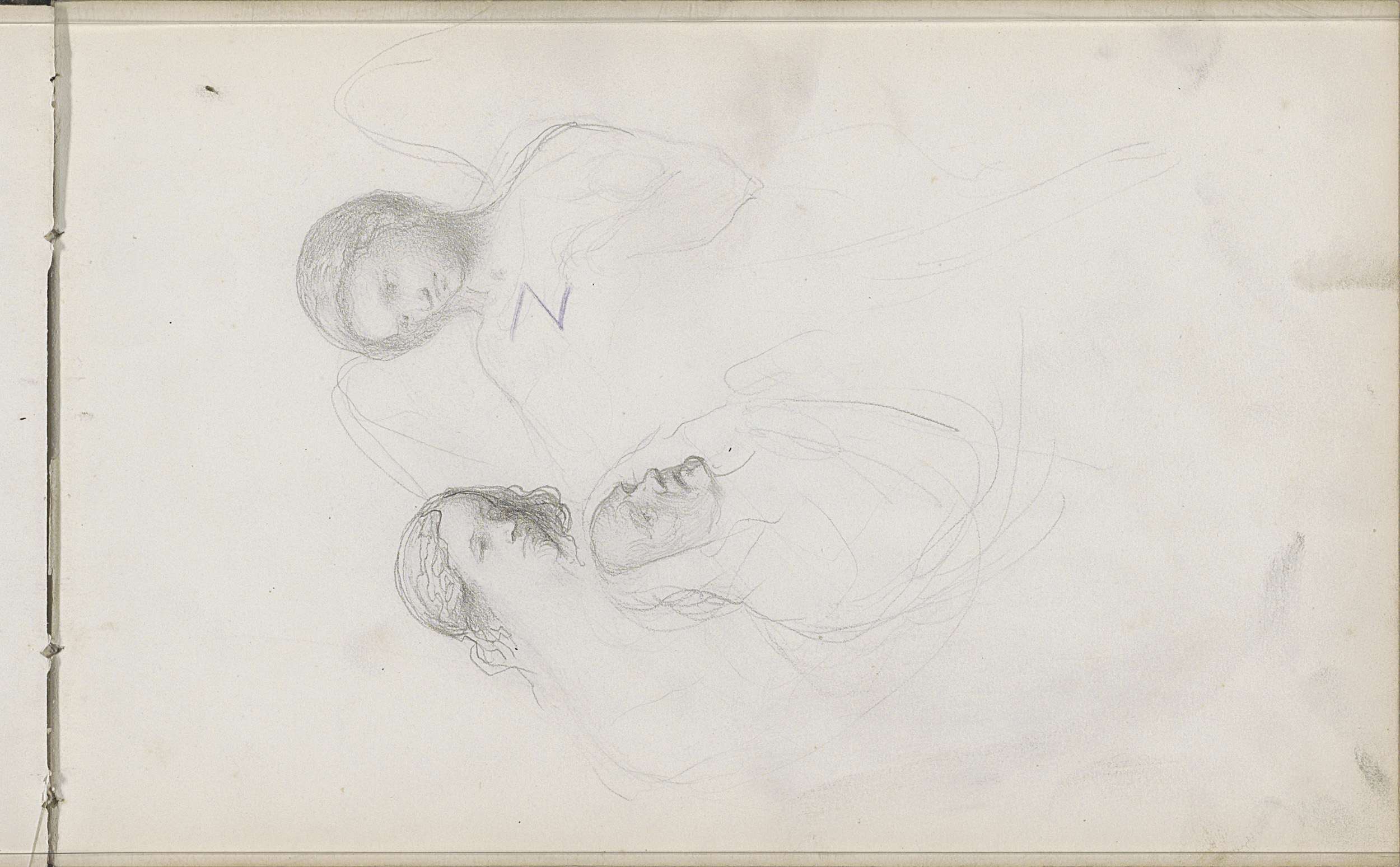 Vrouw, mogelijk een engel, buigend over twee ineenge...