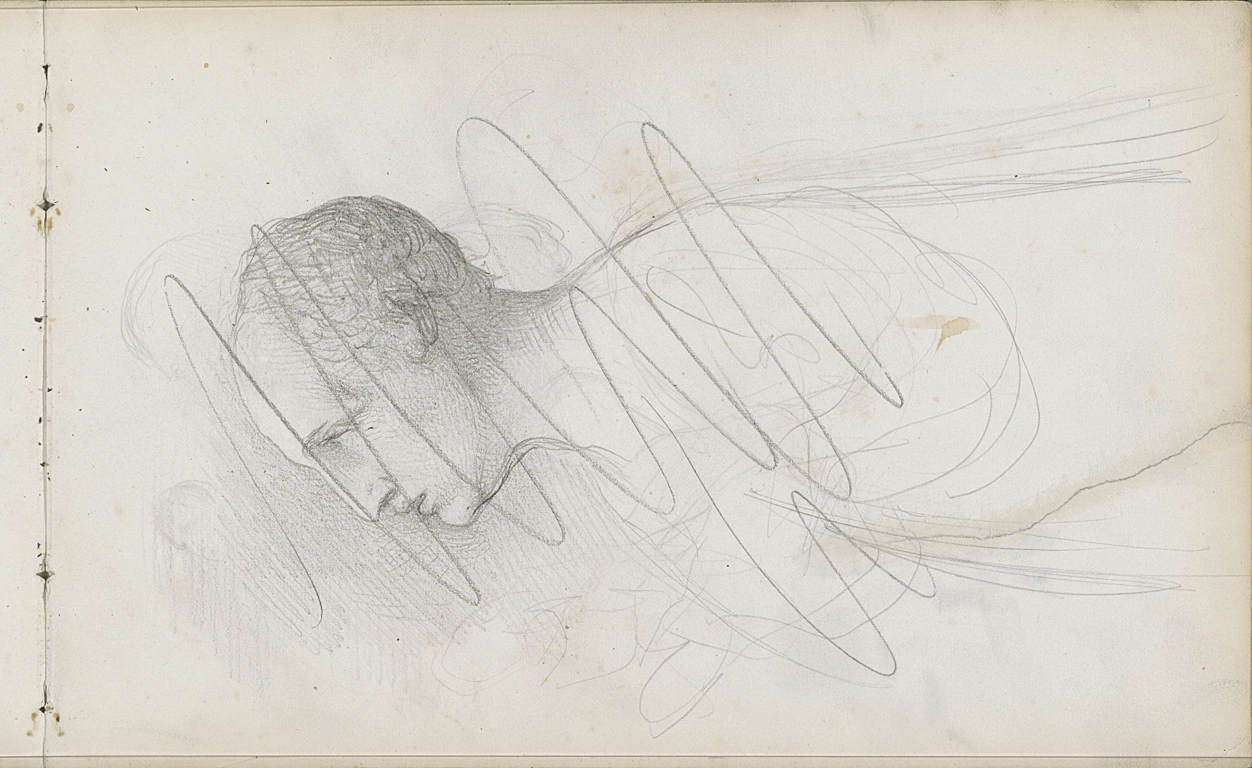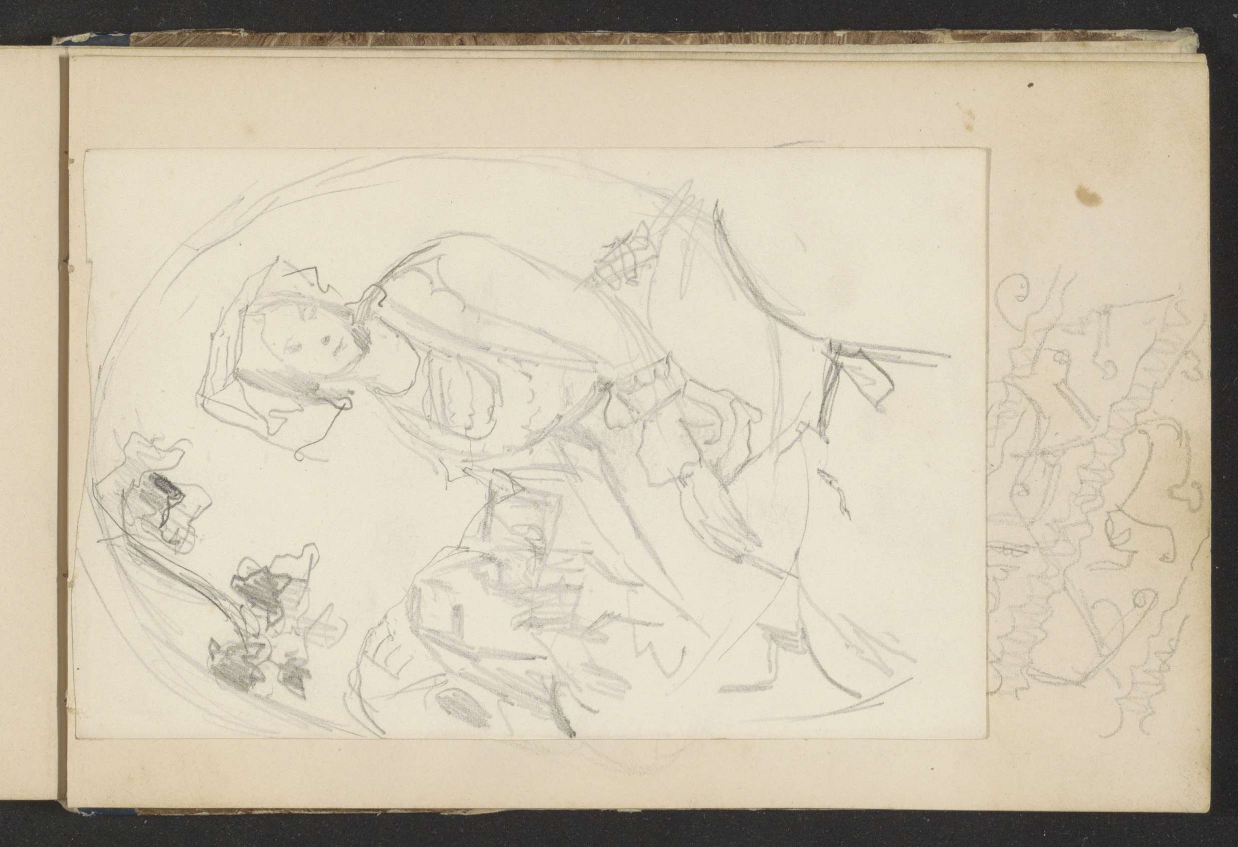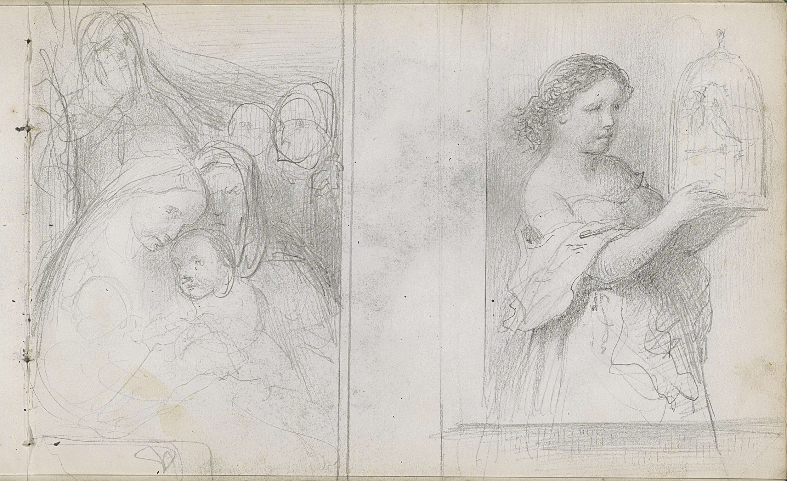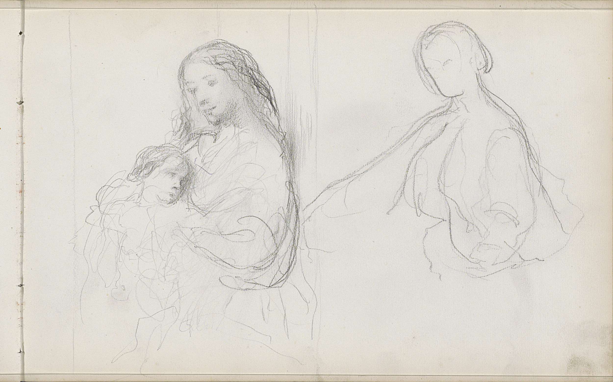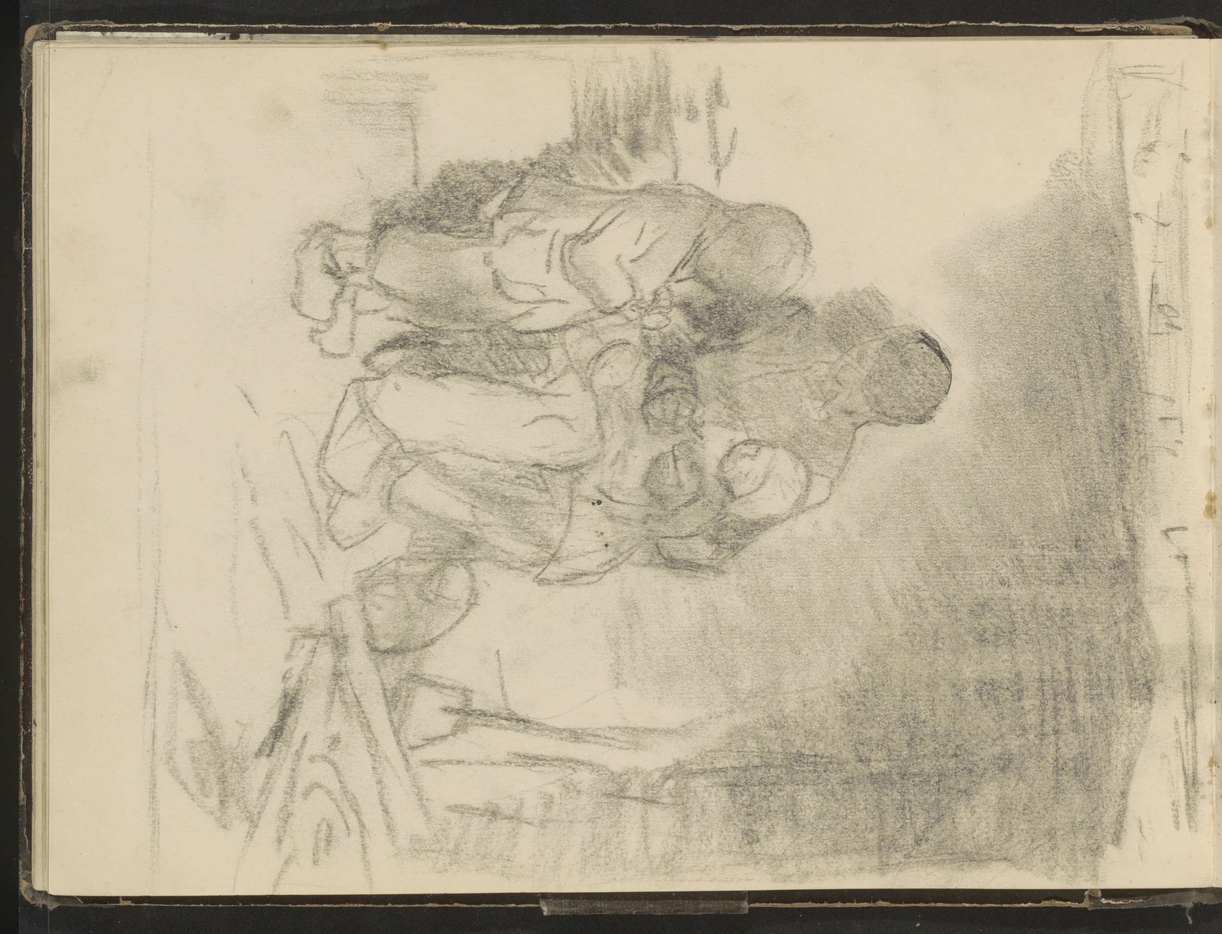 Vrouw, mogelijk een engel, buigend over twee ineenge...
