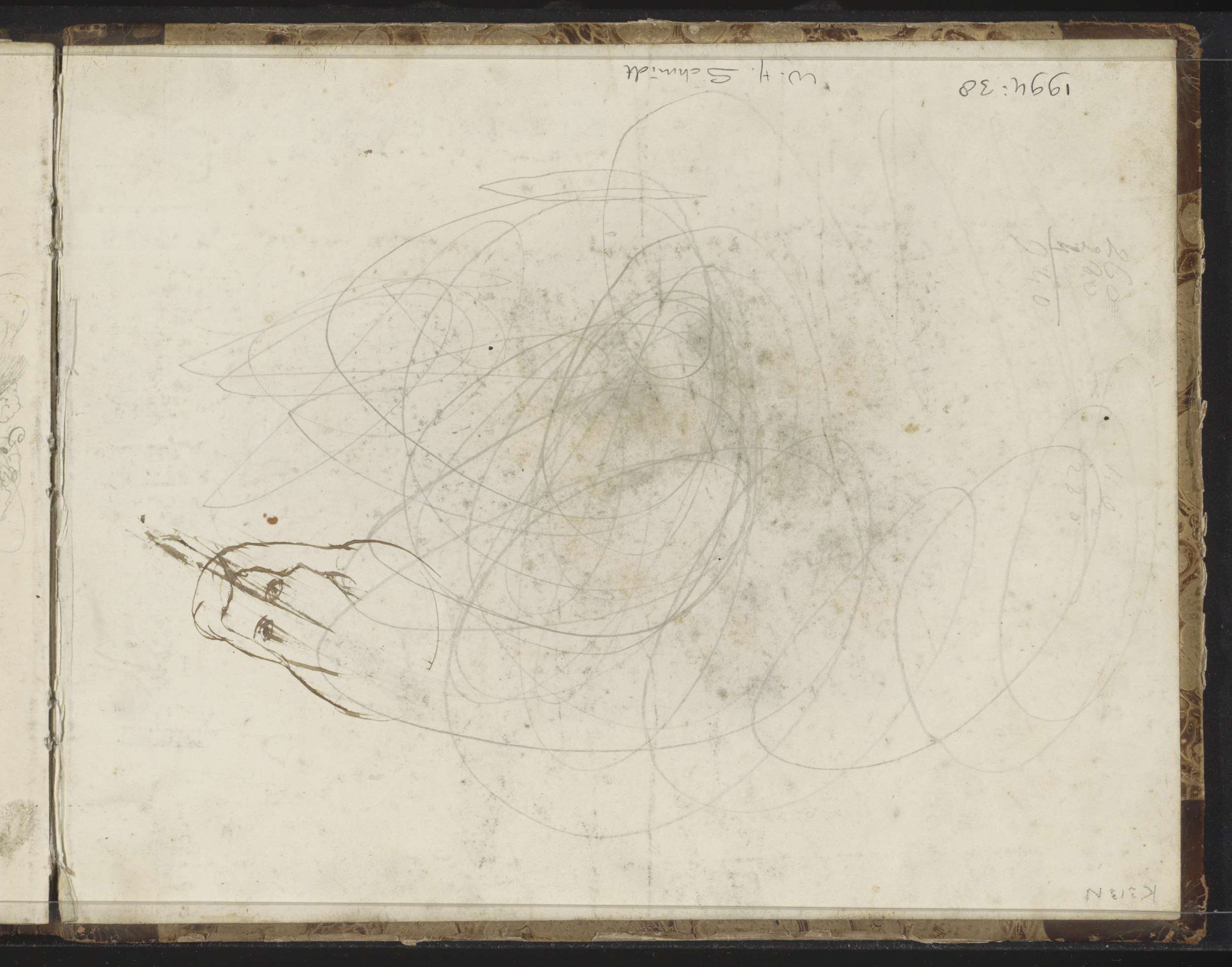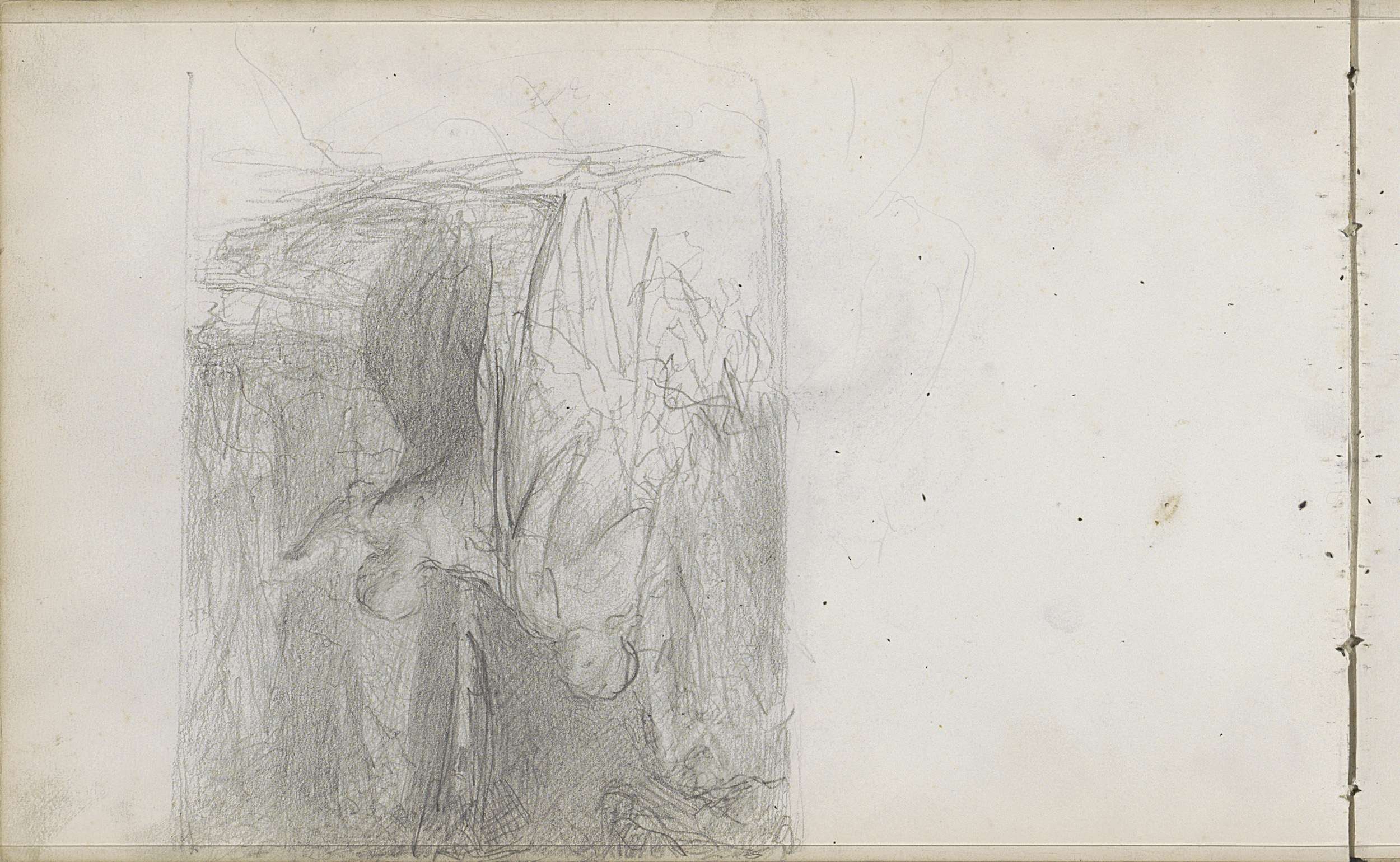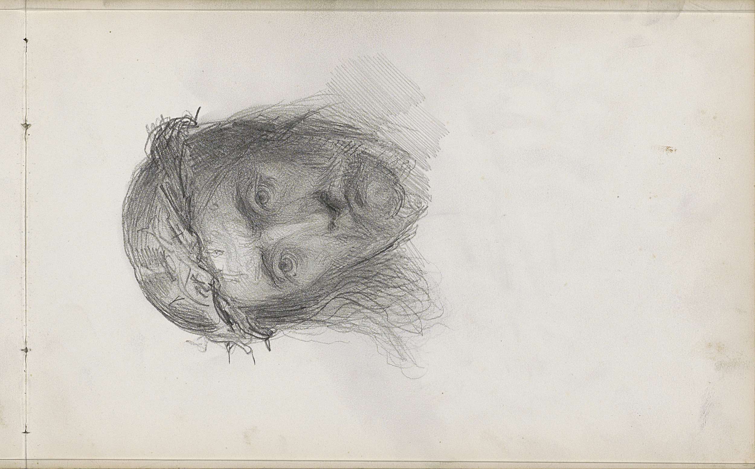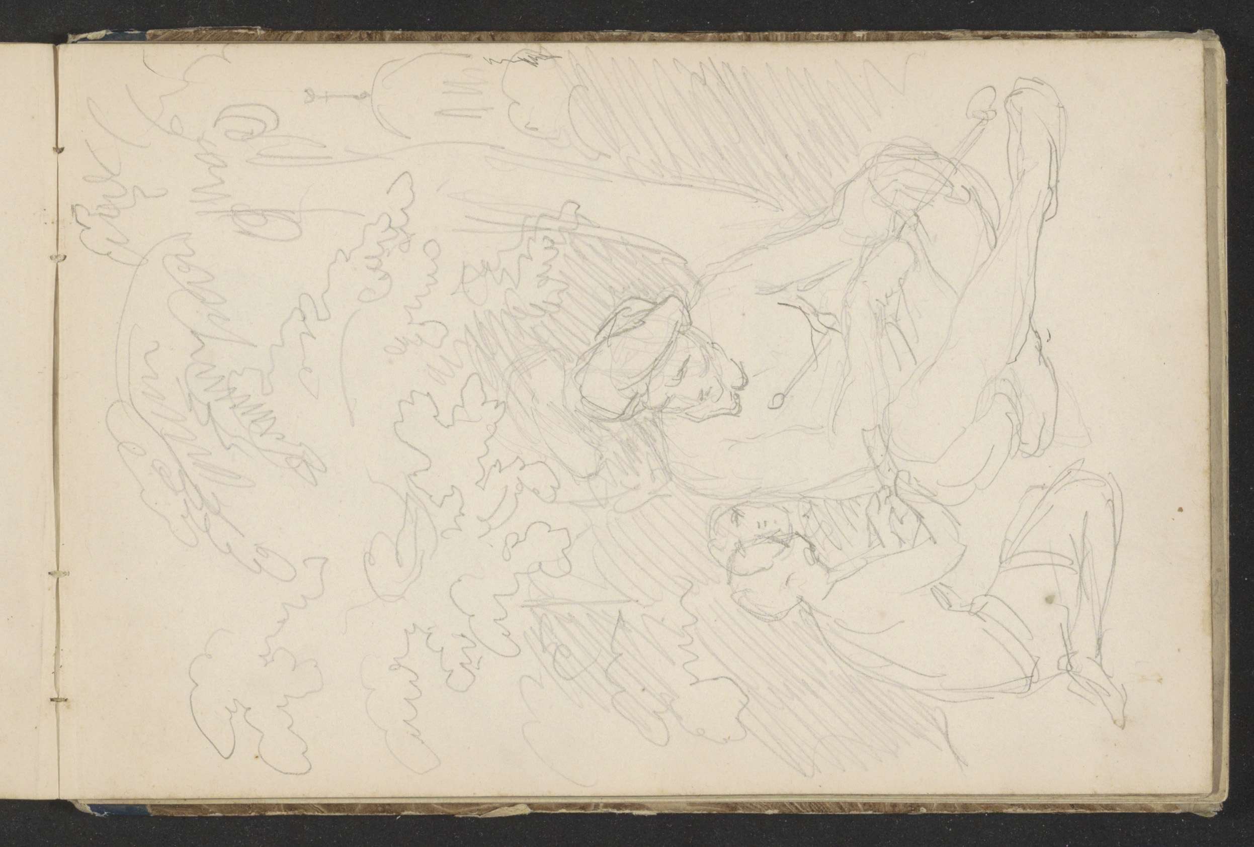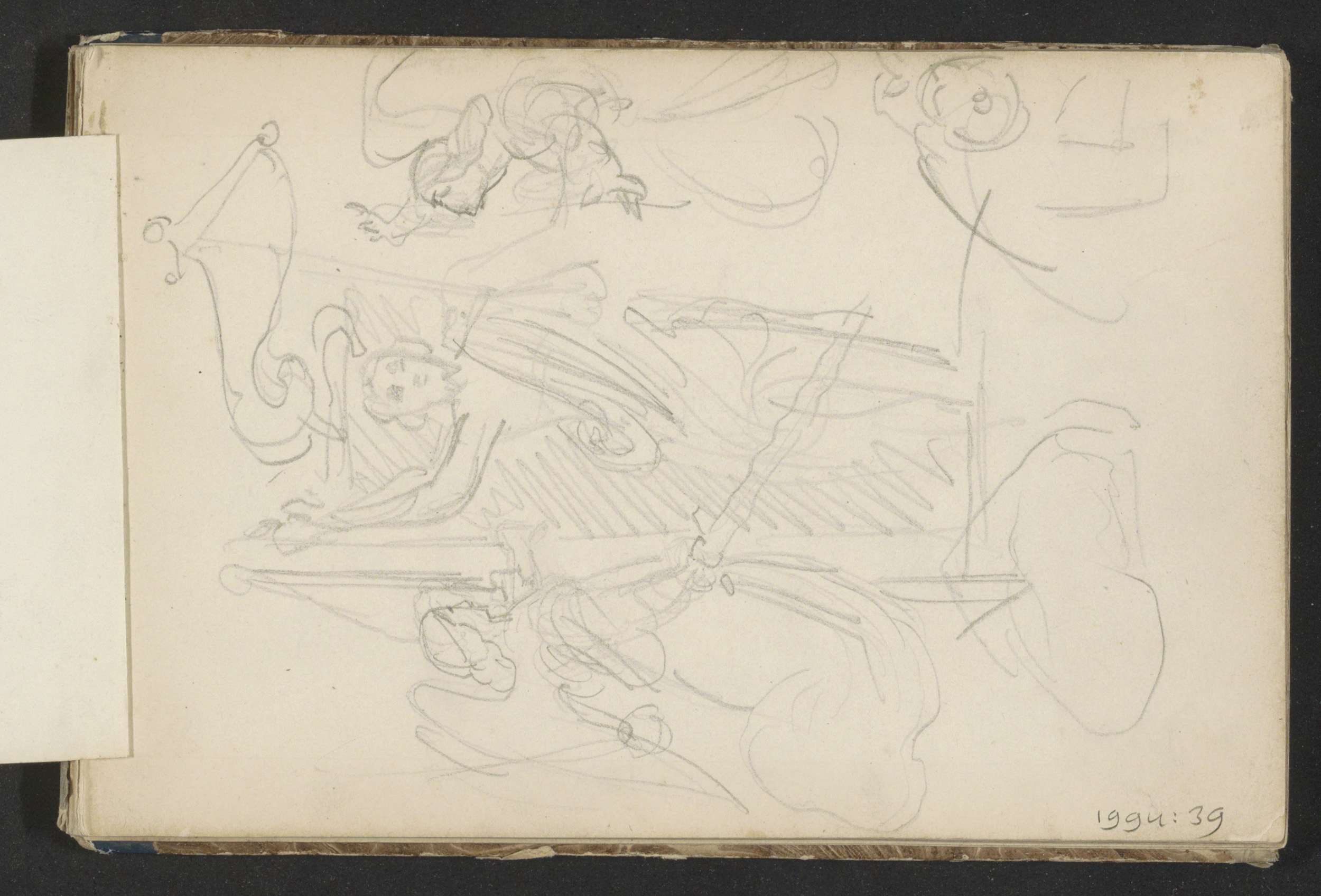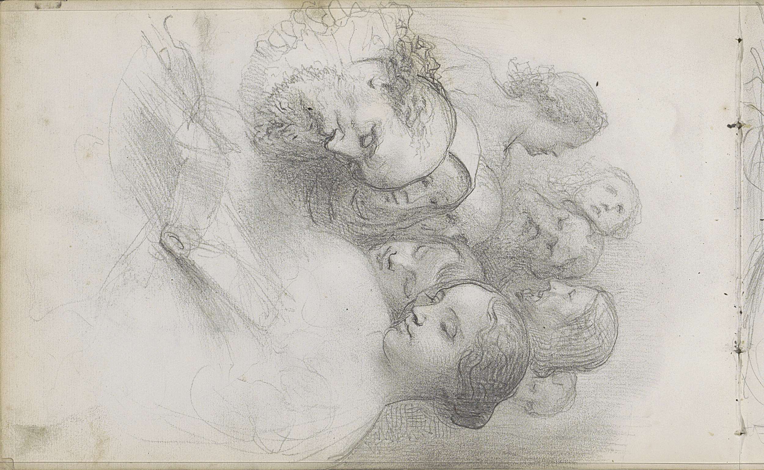 Vrouw, mogelijk een engel, buigend over twee ineenge...