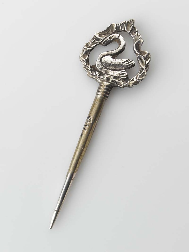 Priem met als bekroning een zwemmende zwaan, omlijst...