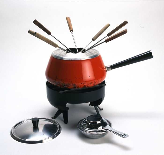 Oranje fonduestel met spiritusbrander, deksel, roost...