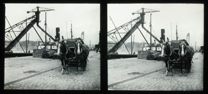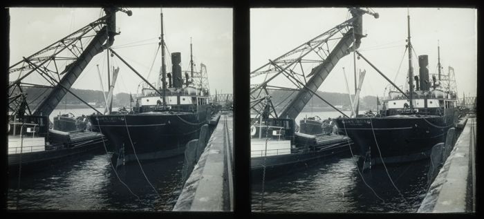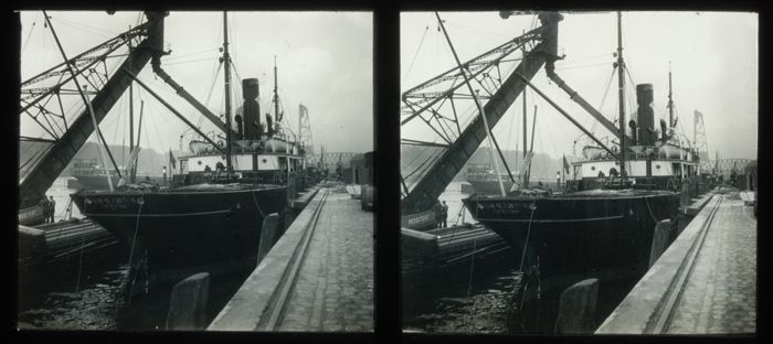 Stereo glasdia van lossen in de Koningshaven te Rott...