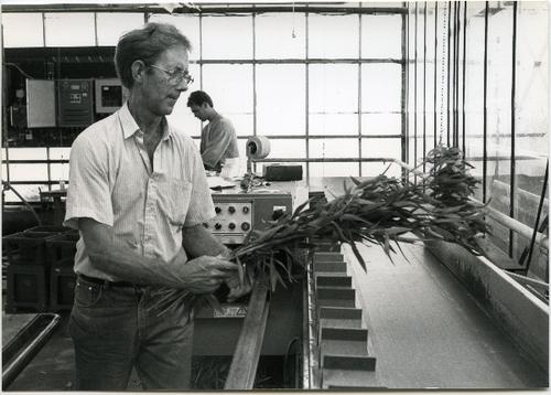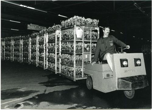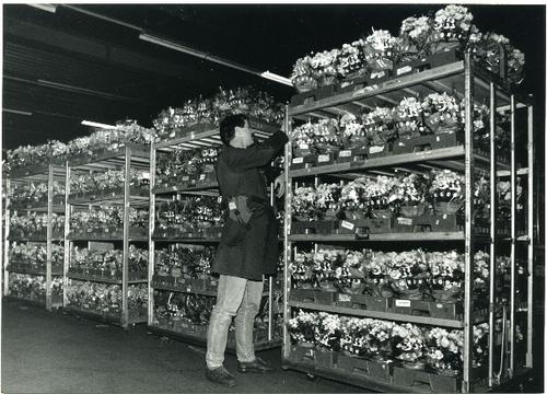 Foto in zwart-wit van de bloemenveiling te Eelde doo...