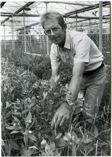 Foto in zwart-wit van een kas met alstroemeria's doo...