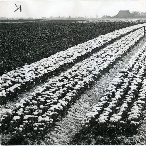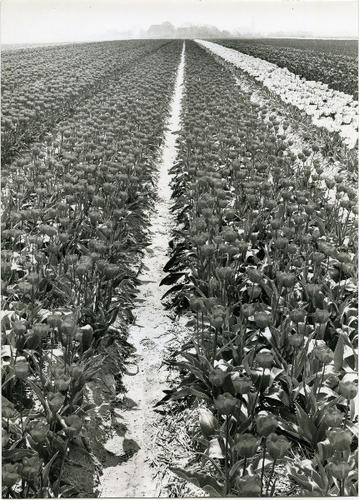 Foto in zwart-wit van een veld met tulpen door J.D. ...