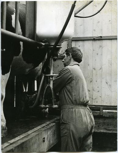 Foto in zwart-wit van een boer in de melkput, 1976