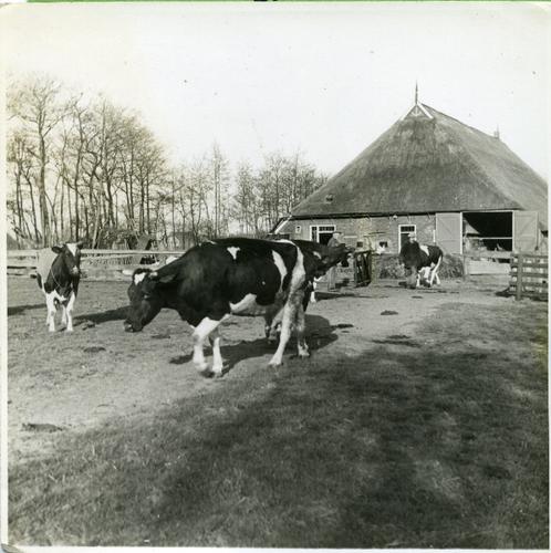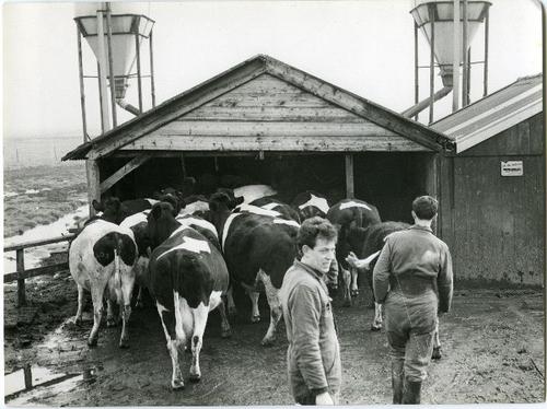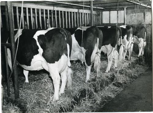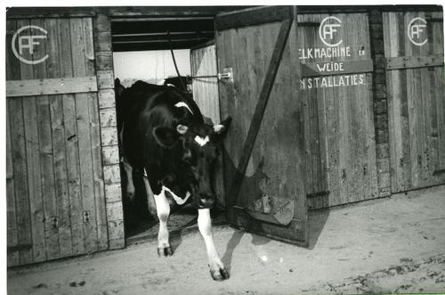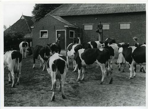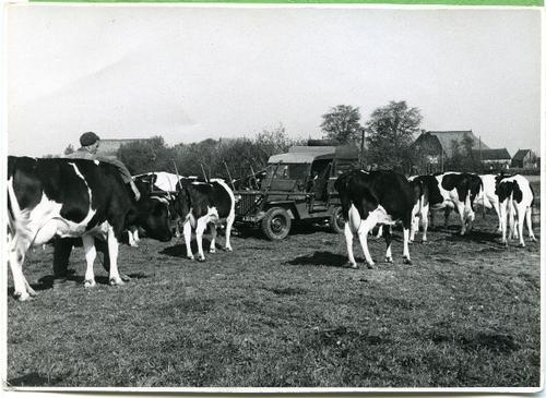 Foto in zwart-wit van het uitlaten van de koeien, 1949