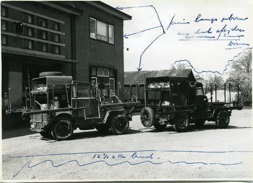 Foto in zwart-wit van Jeeps voor het jeepmelken door...