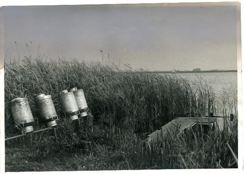 Foto in zwart-wit van melkbussen bij een aanlegsteig...