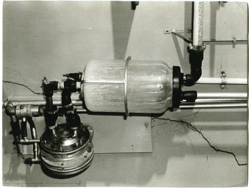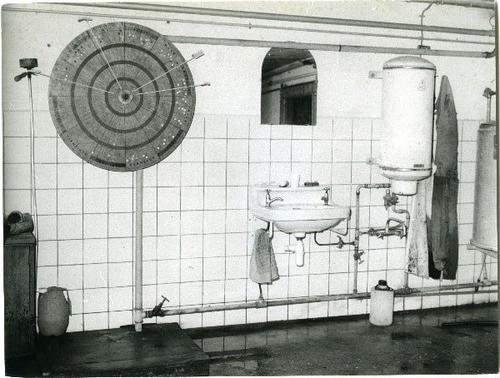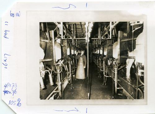 Foto in zwart-wit van het melklokaal met de koekalen...