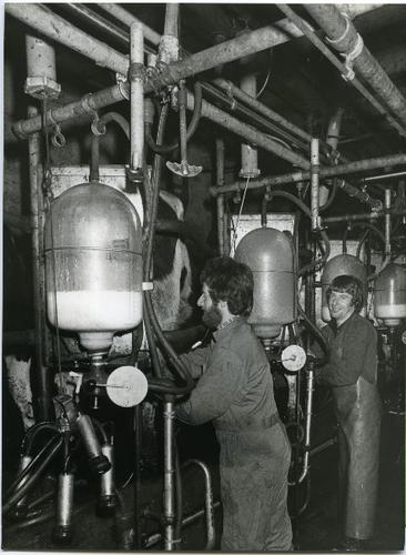 Foto in zwart-wit van een melkstal in bedrijf, 1980
