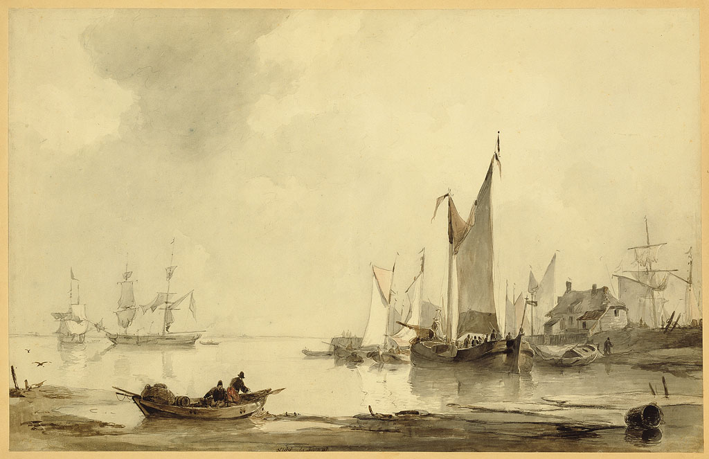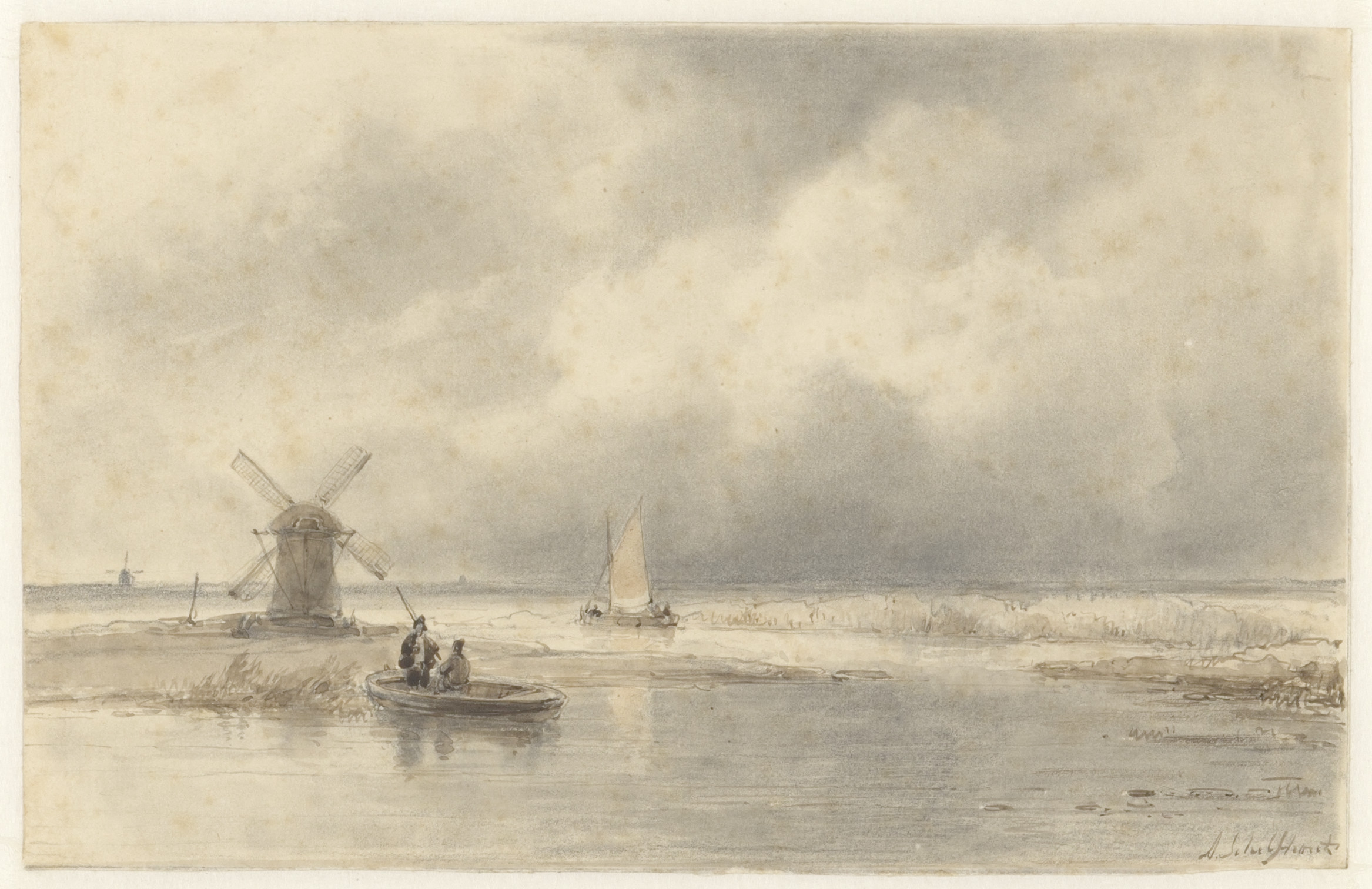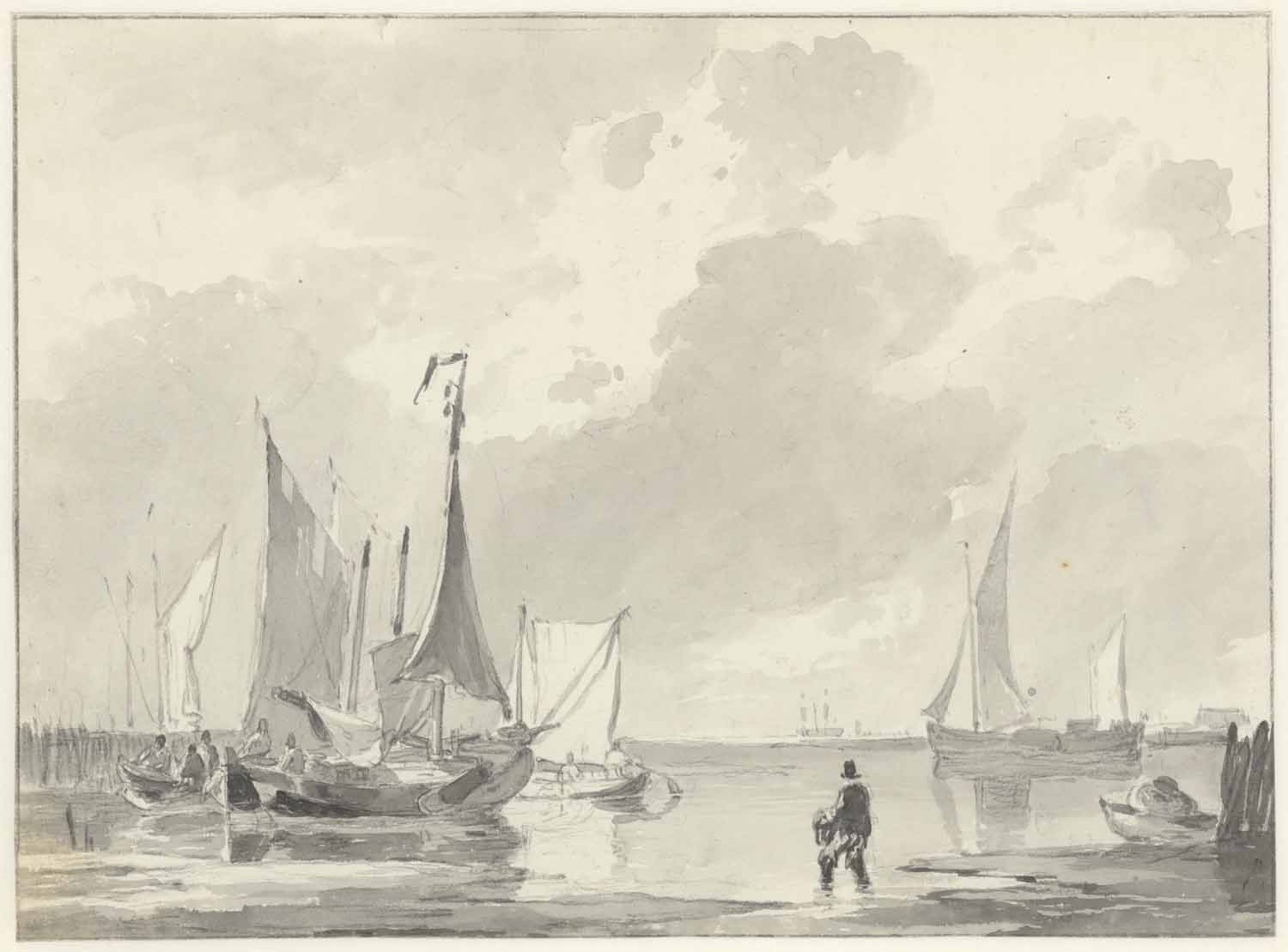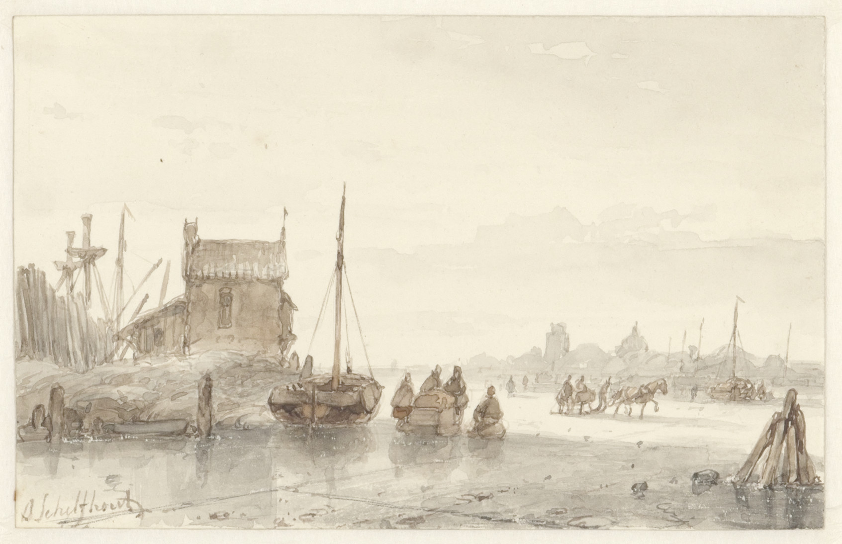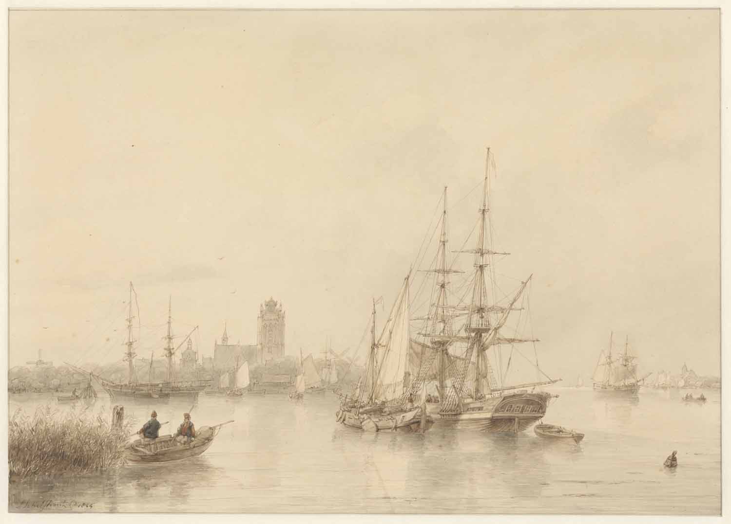 Gezicht op de Maas voor de stad Dordrecht bij winter