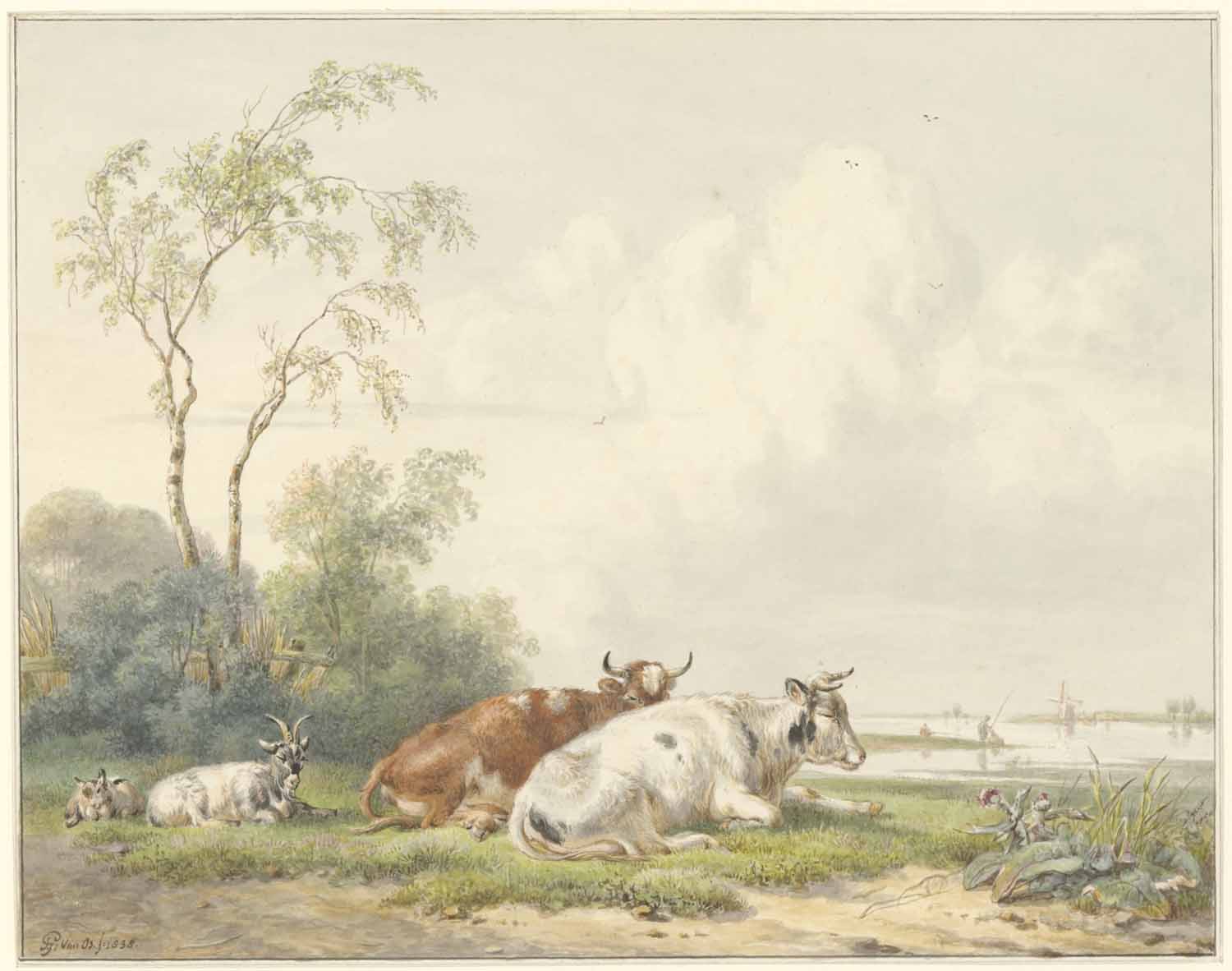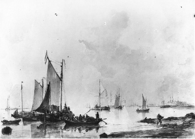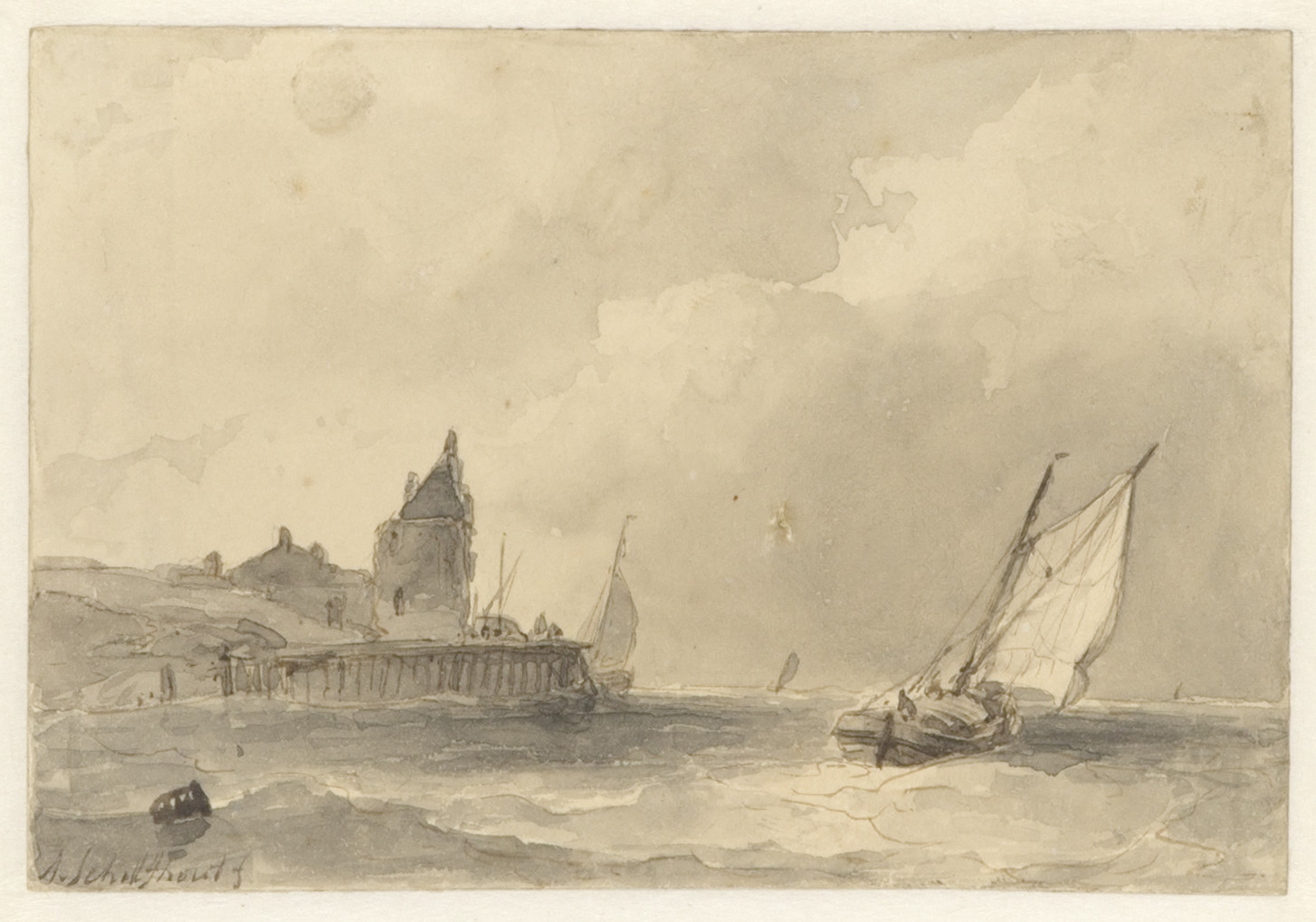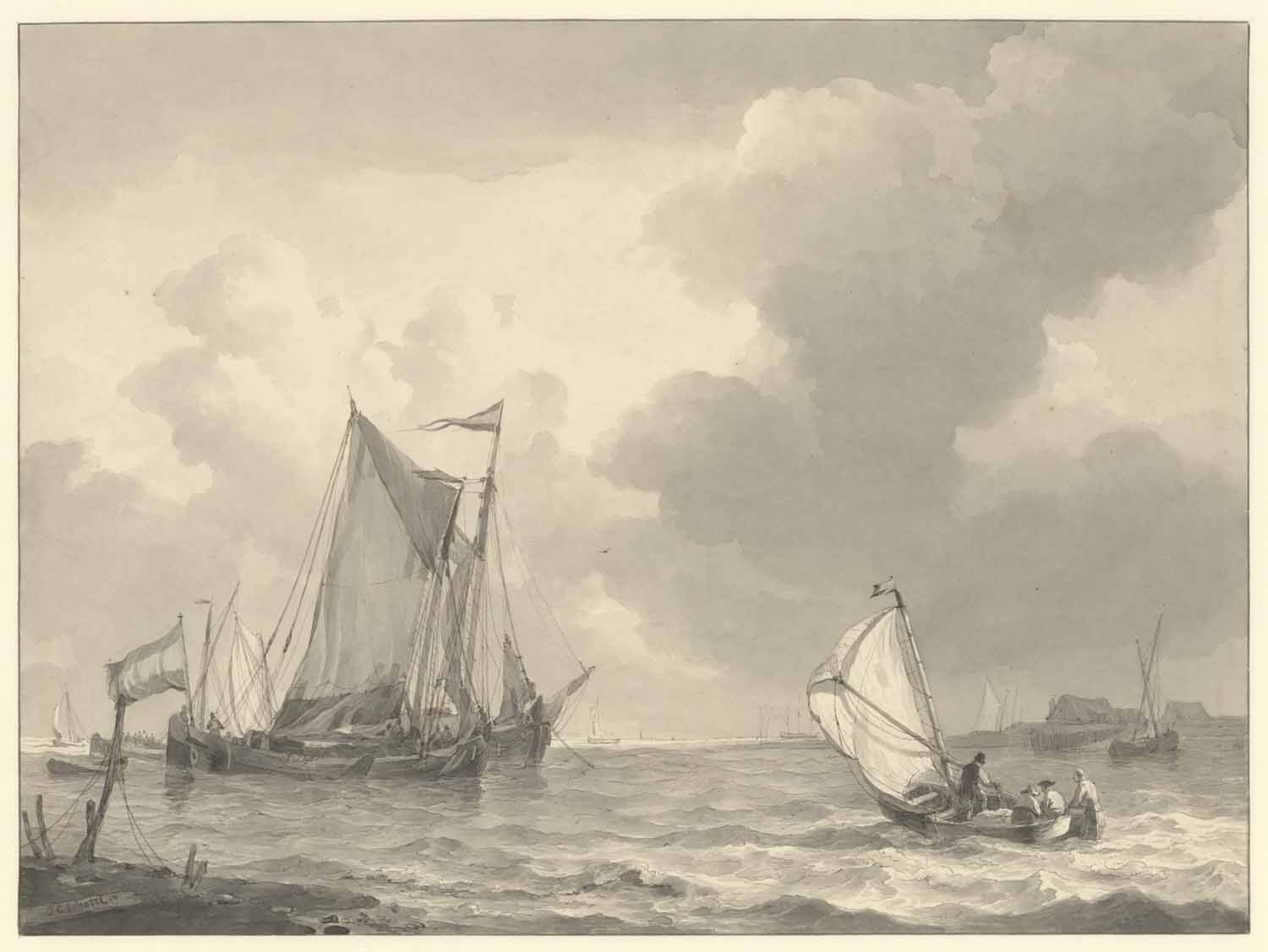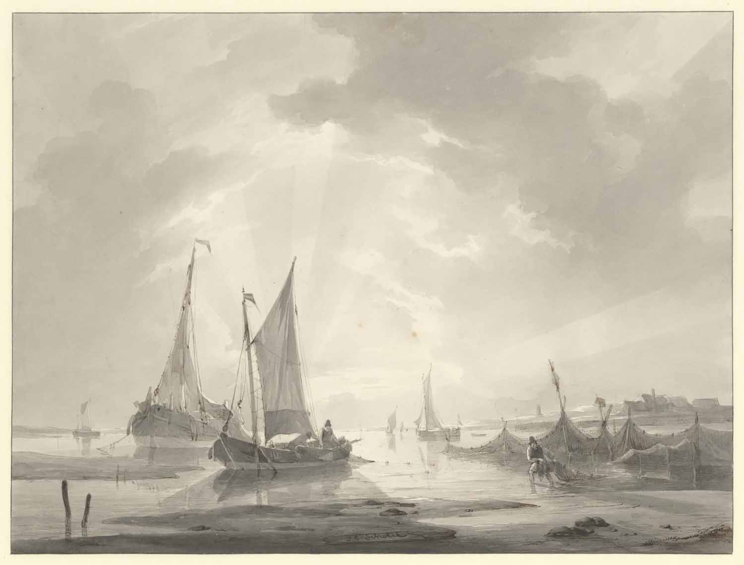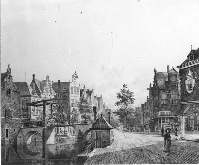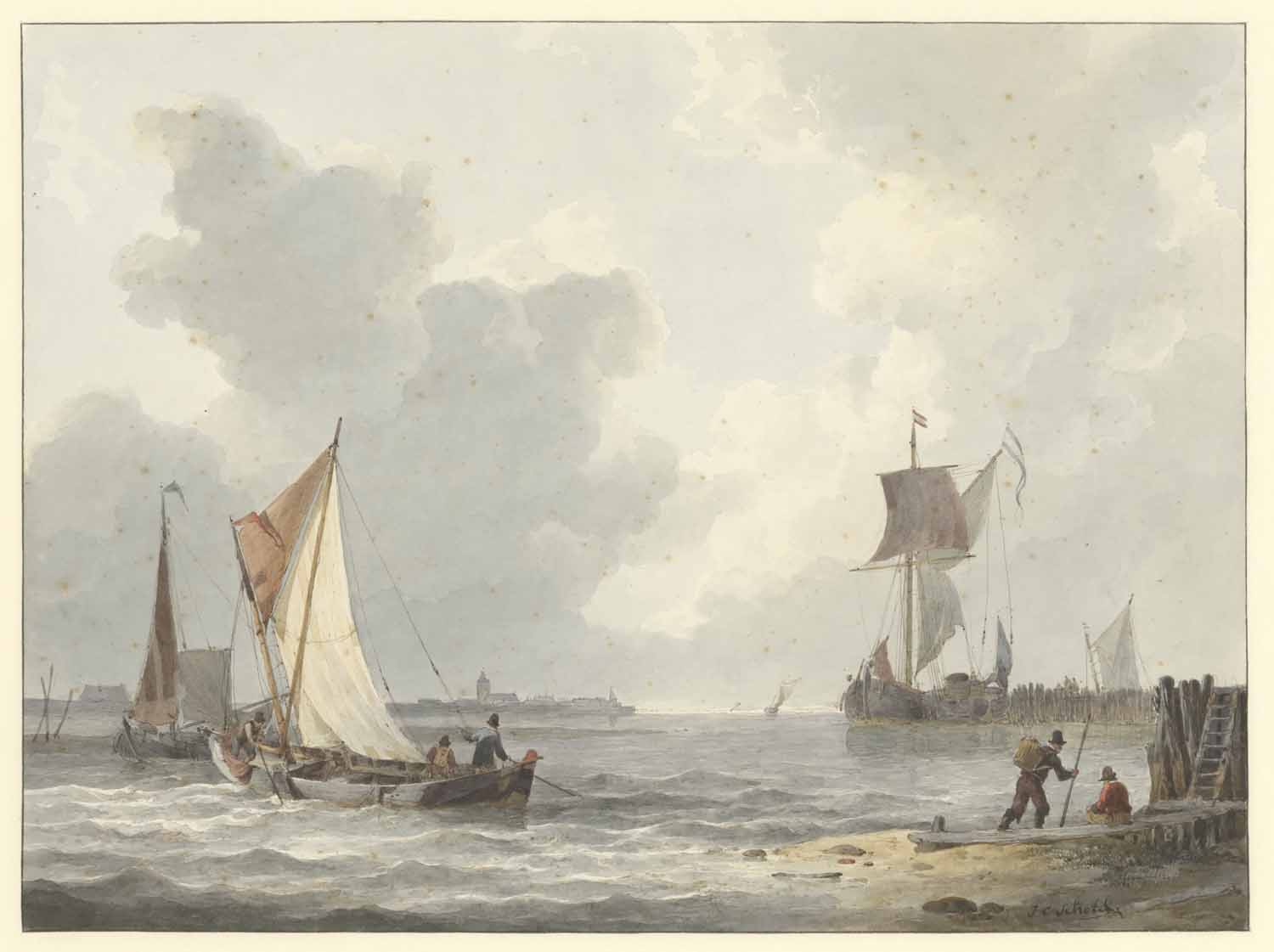 Gezicht op de Maas voor de stad Dordrecht bij winter