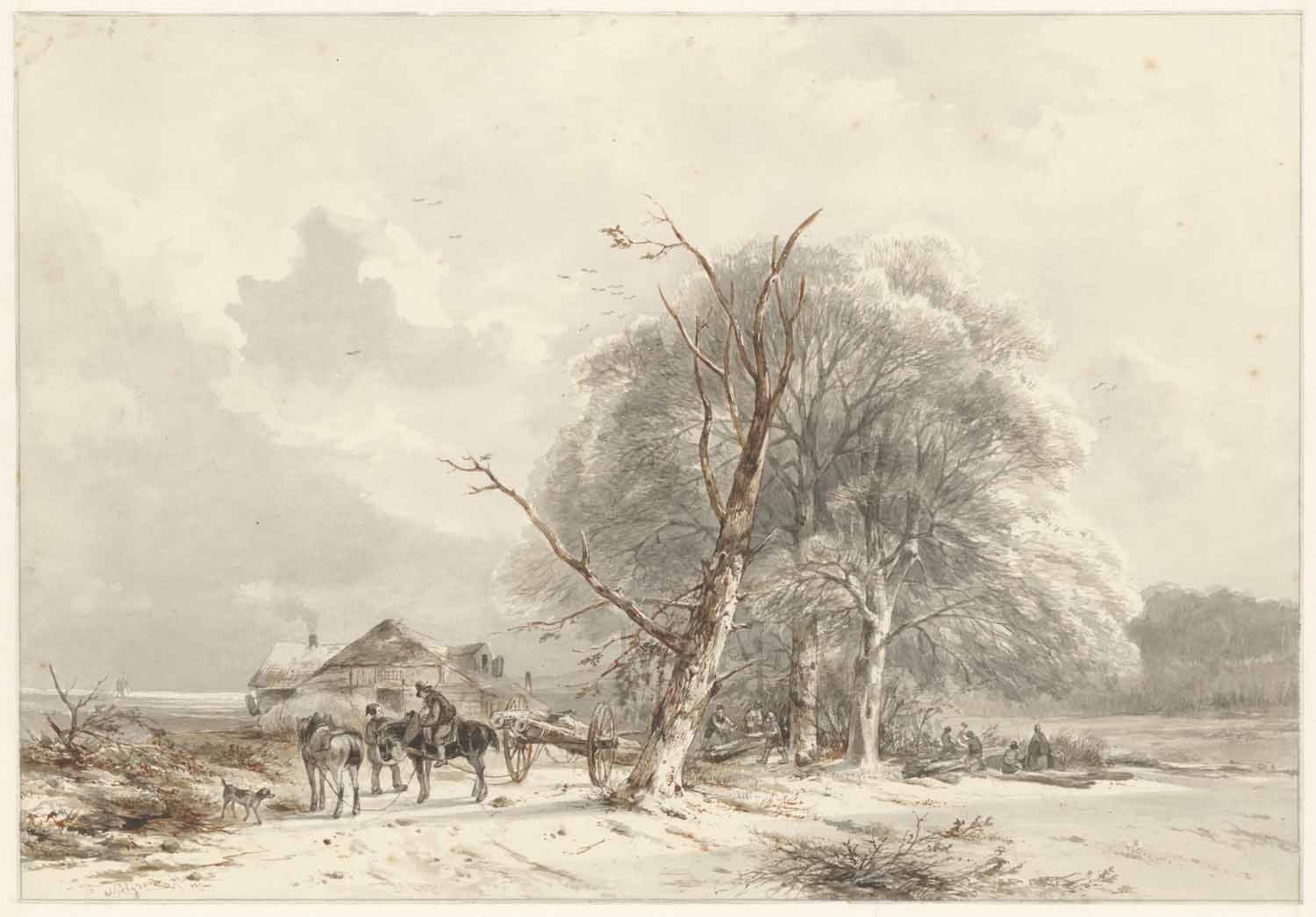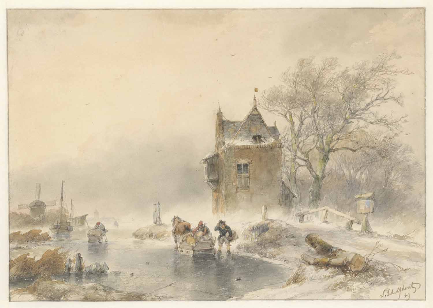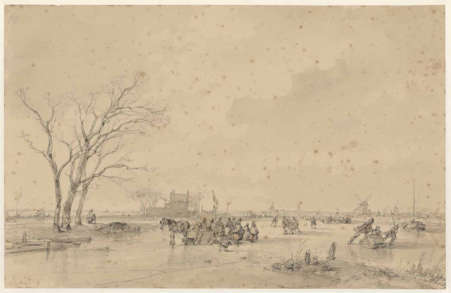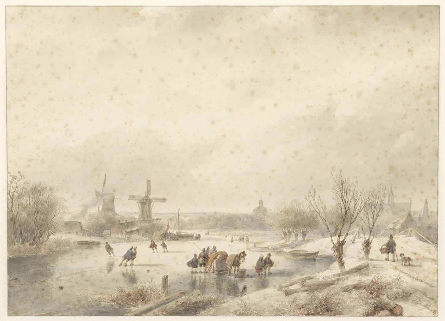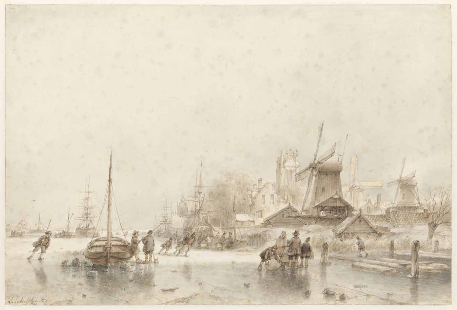 Een jongeling op schaatsen achter eene ijsslede waar...