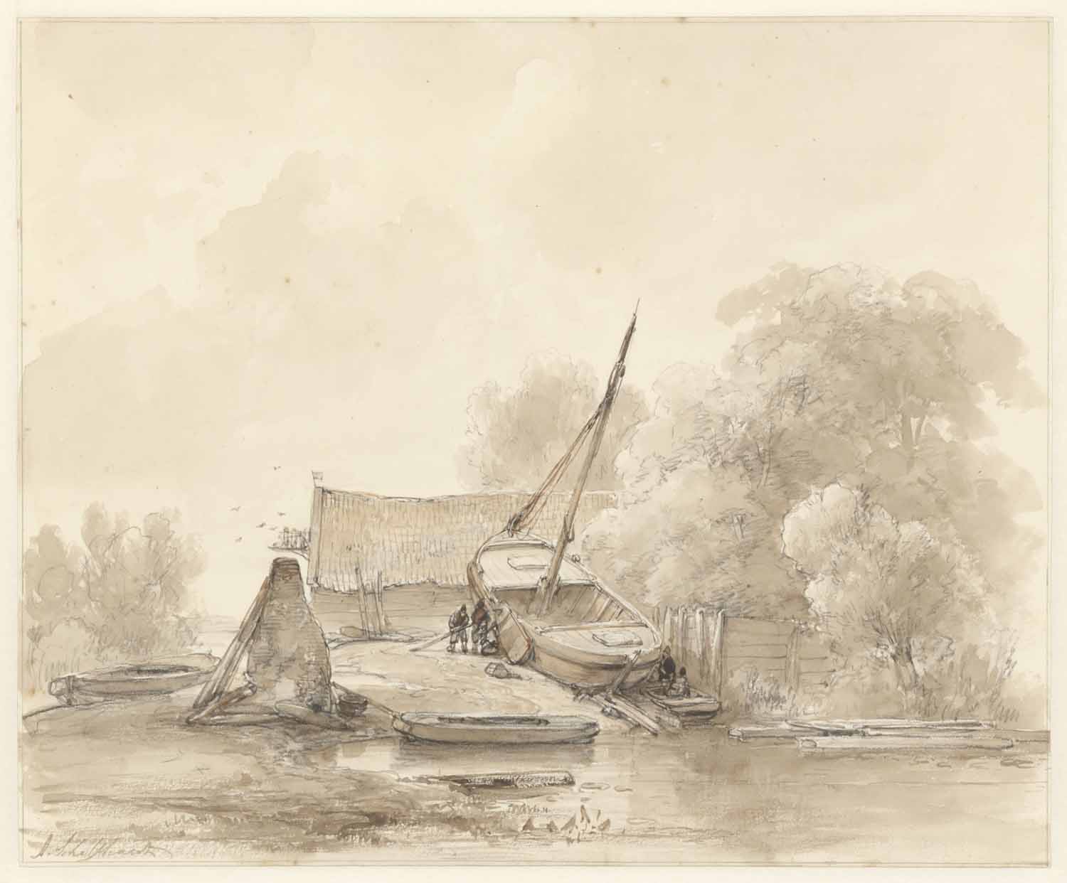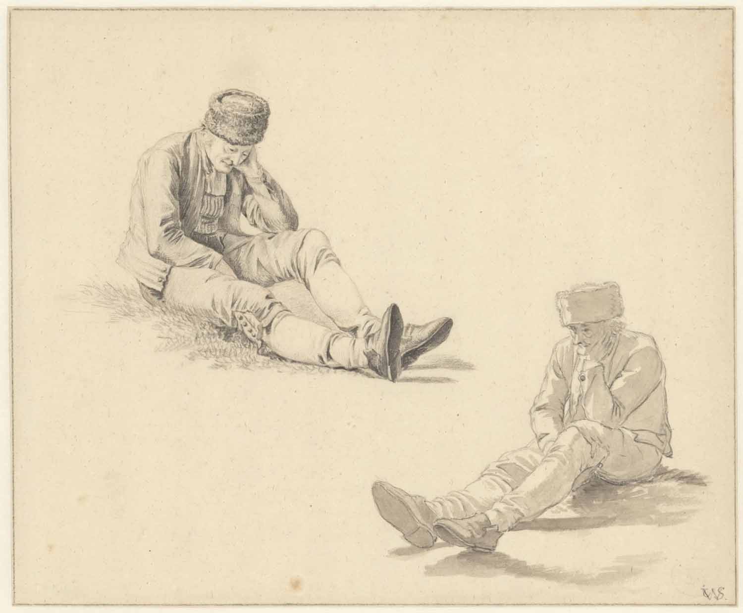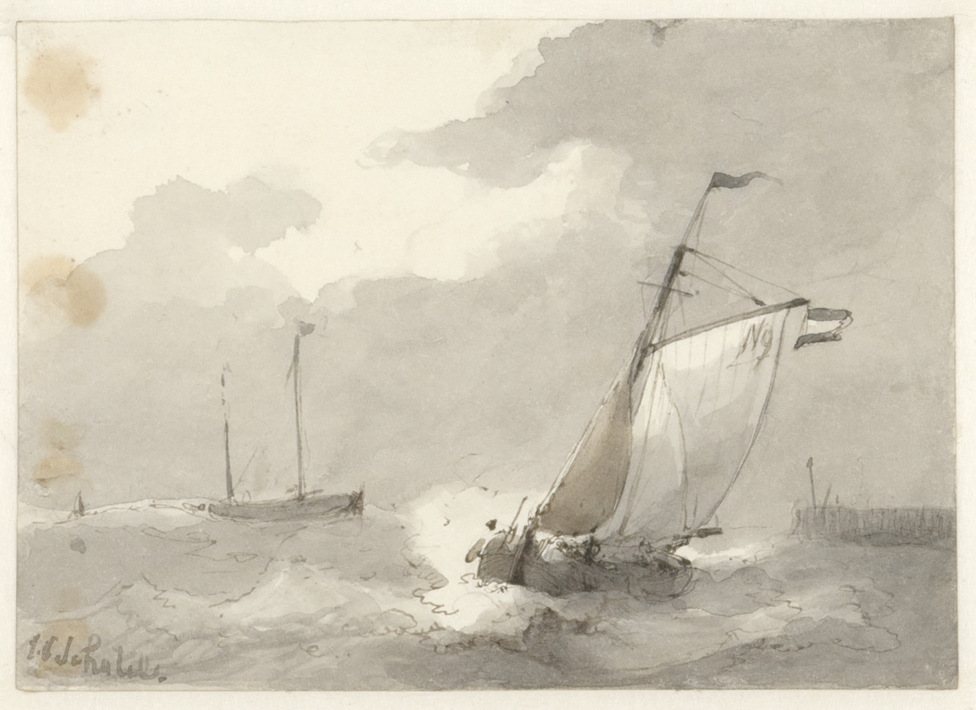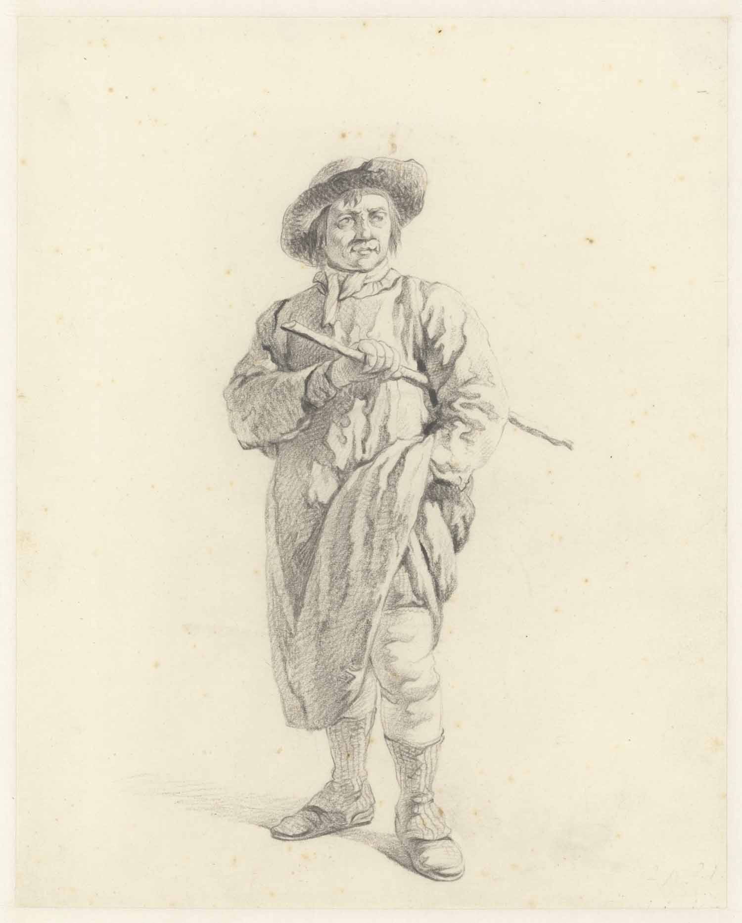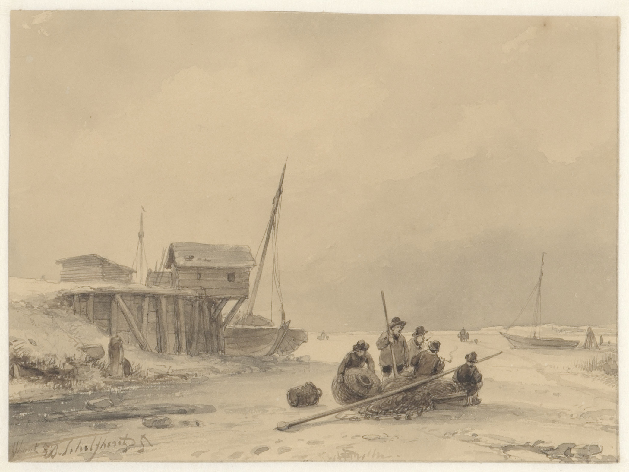 Een jongeling op schaatsen achter eene ijsslede waar...