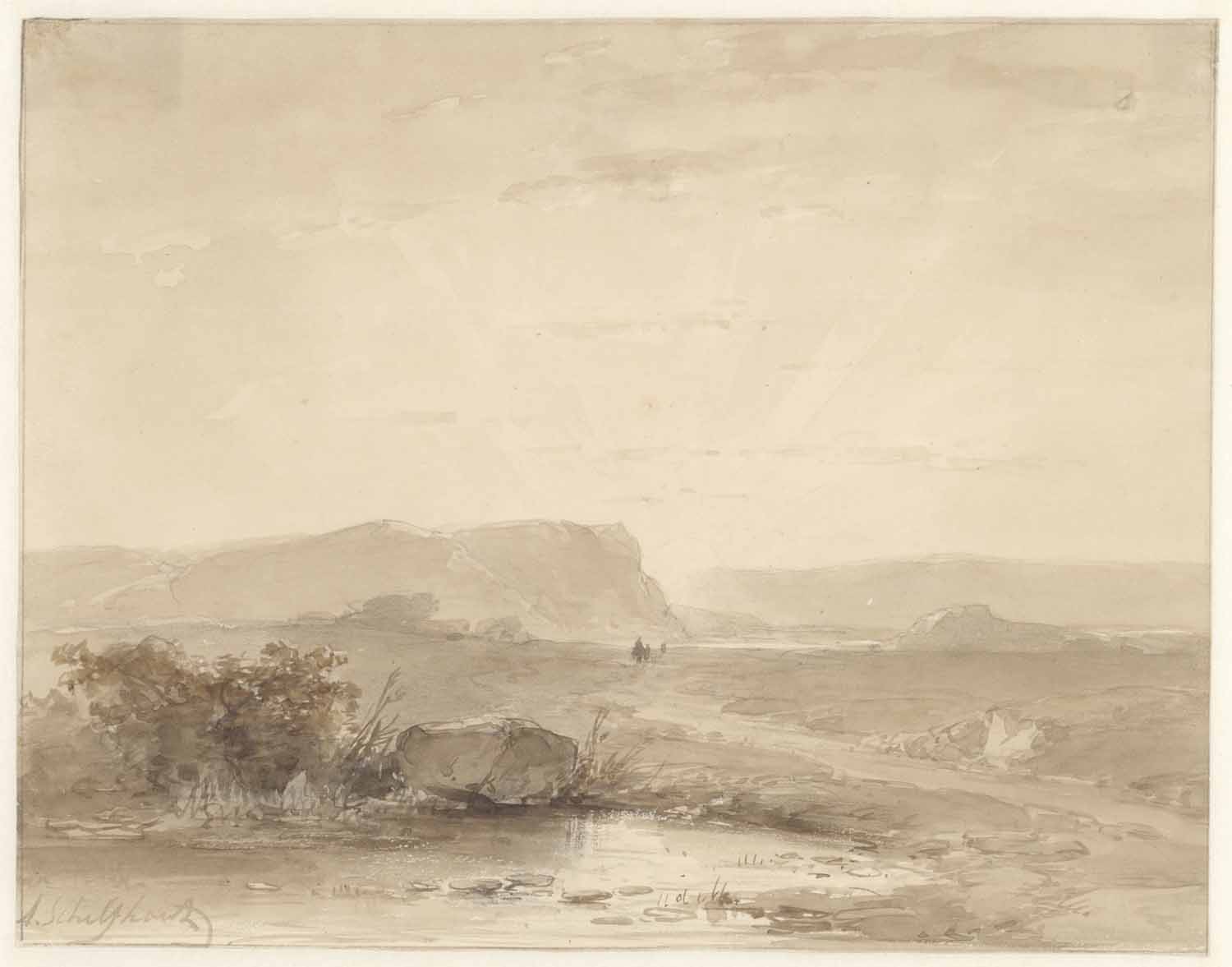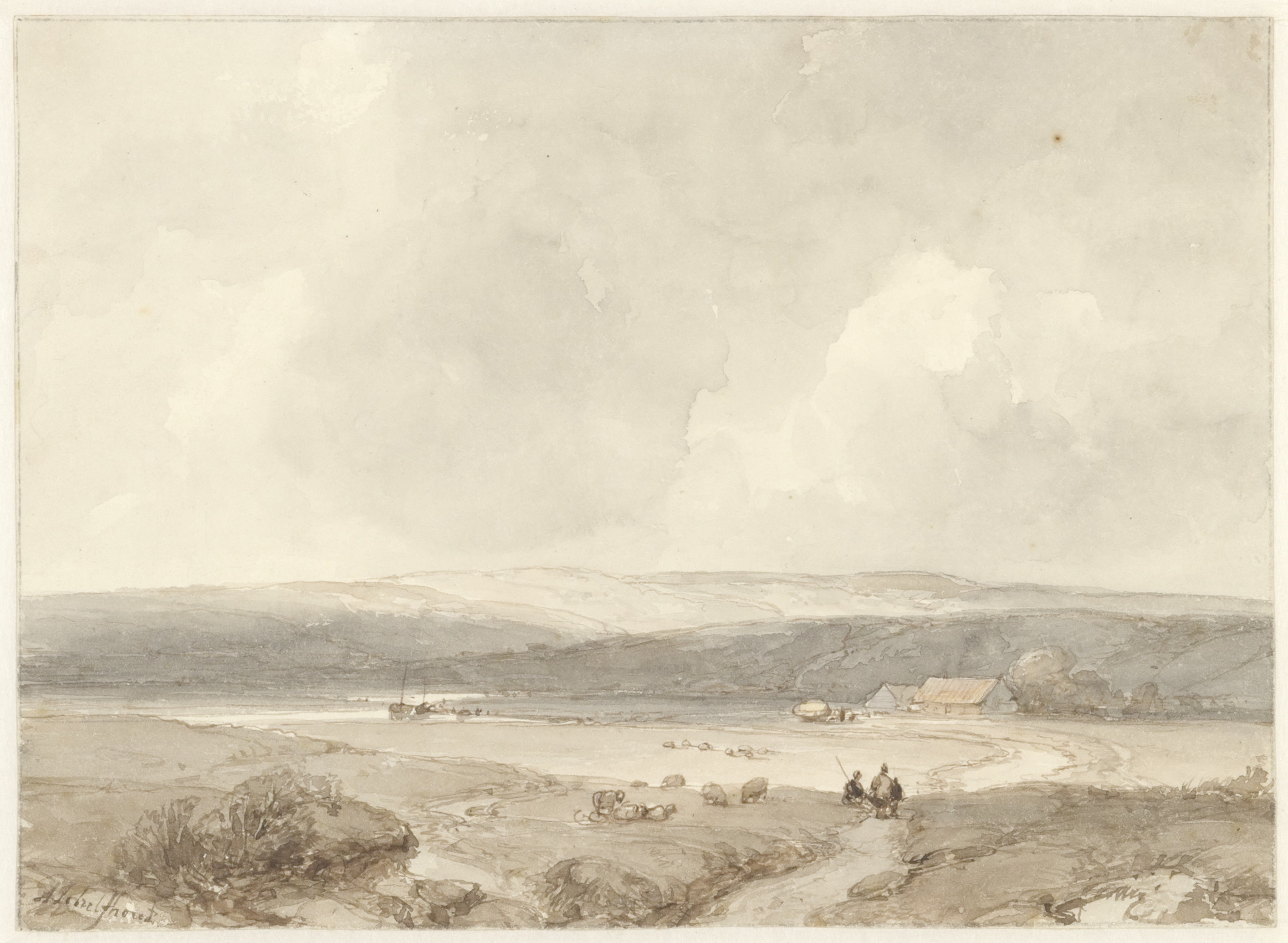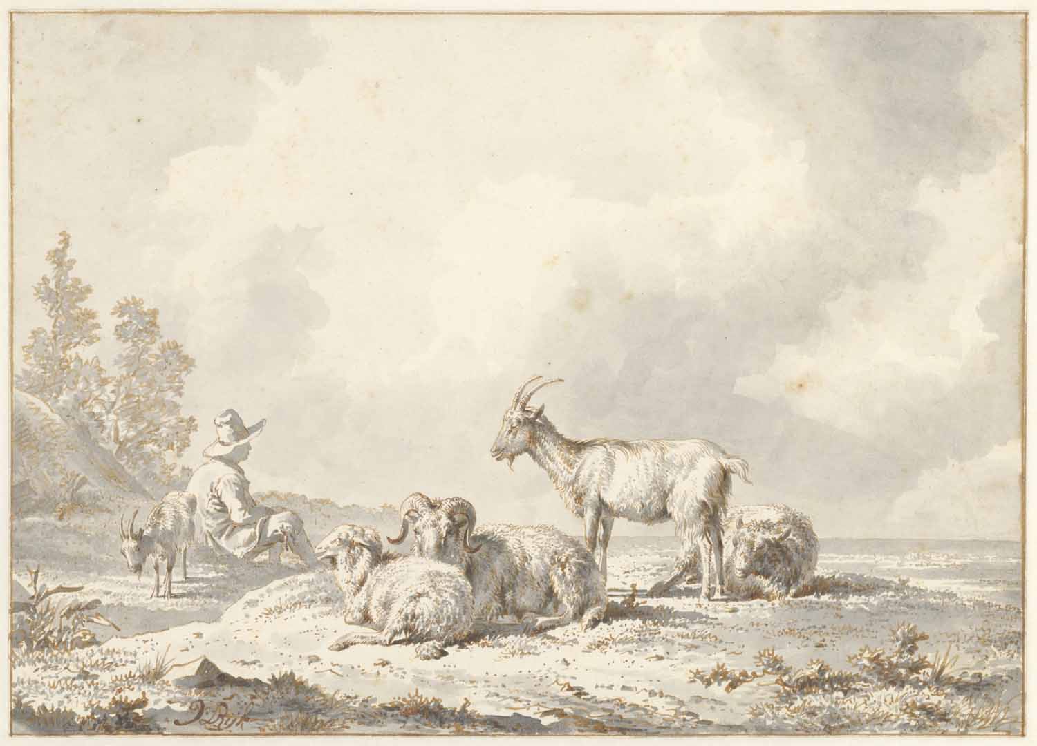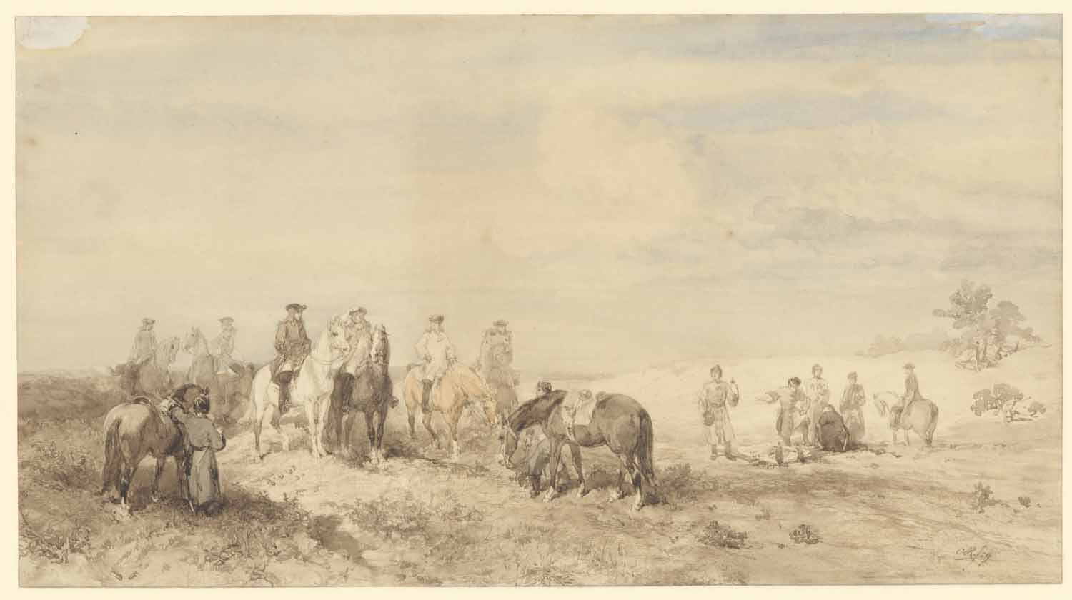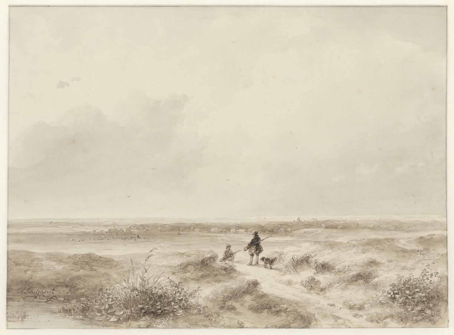 Eene vrouw bij eenen ezel in een duinachtig landschap