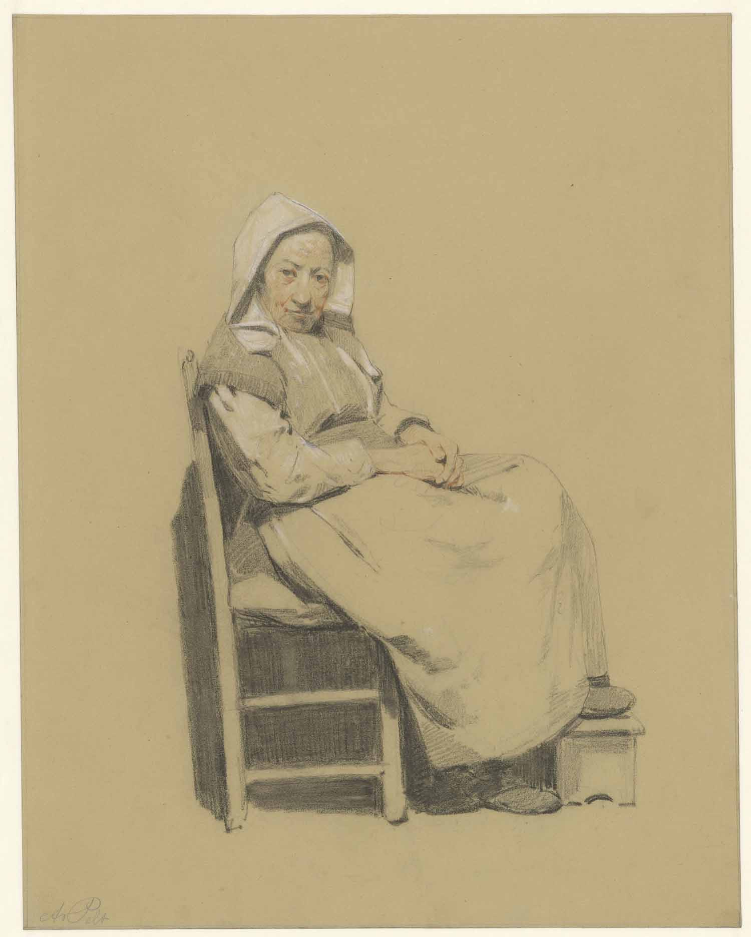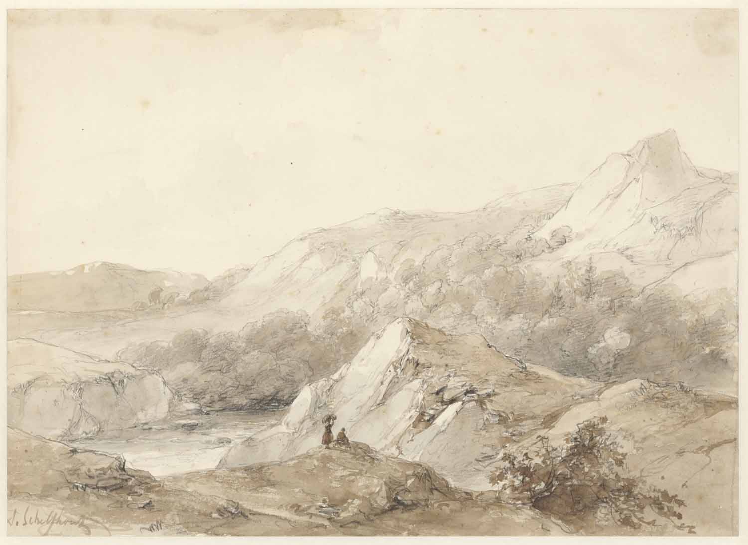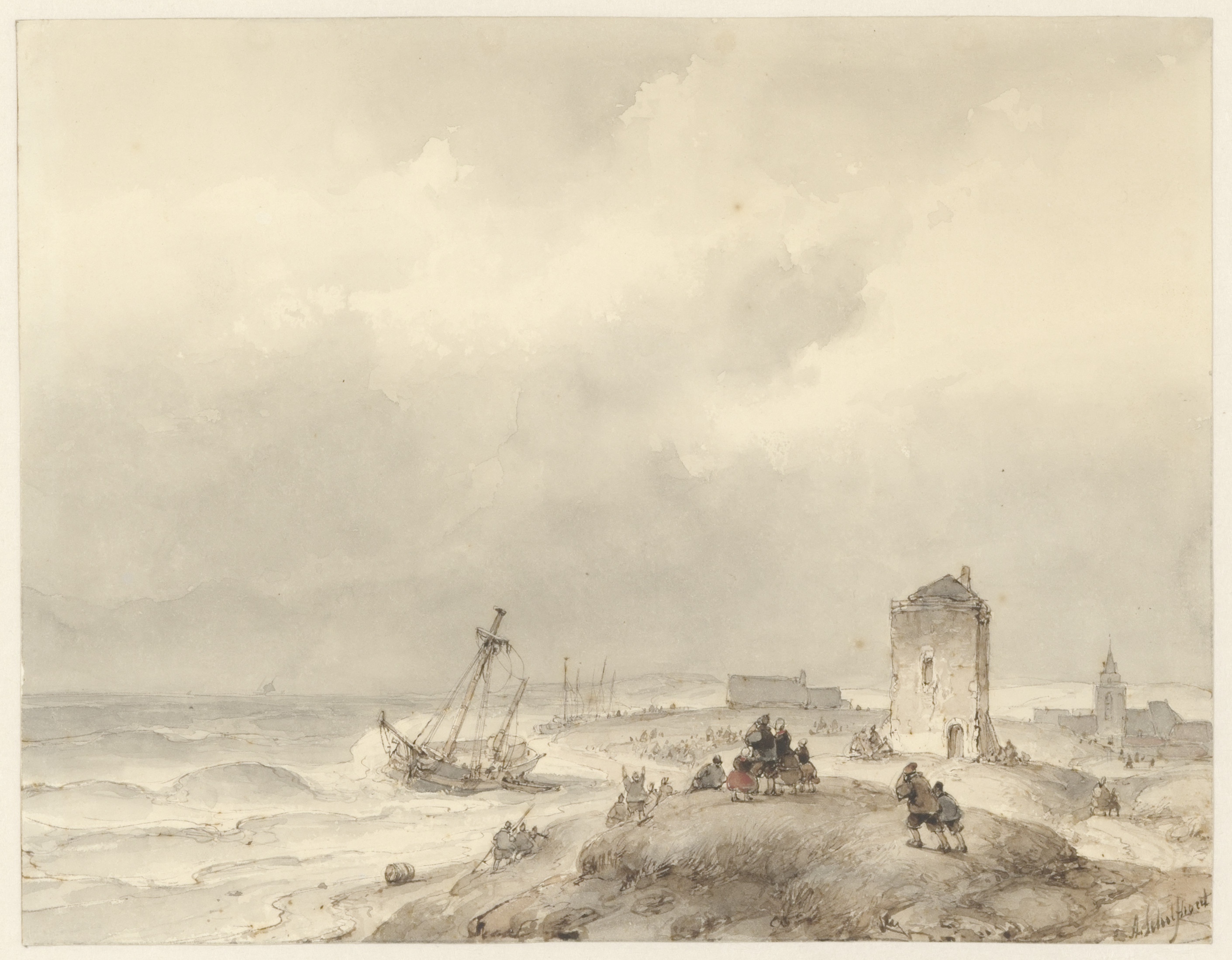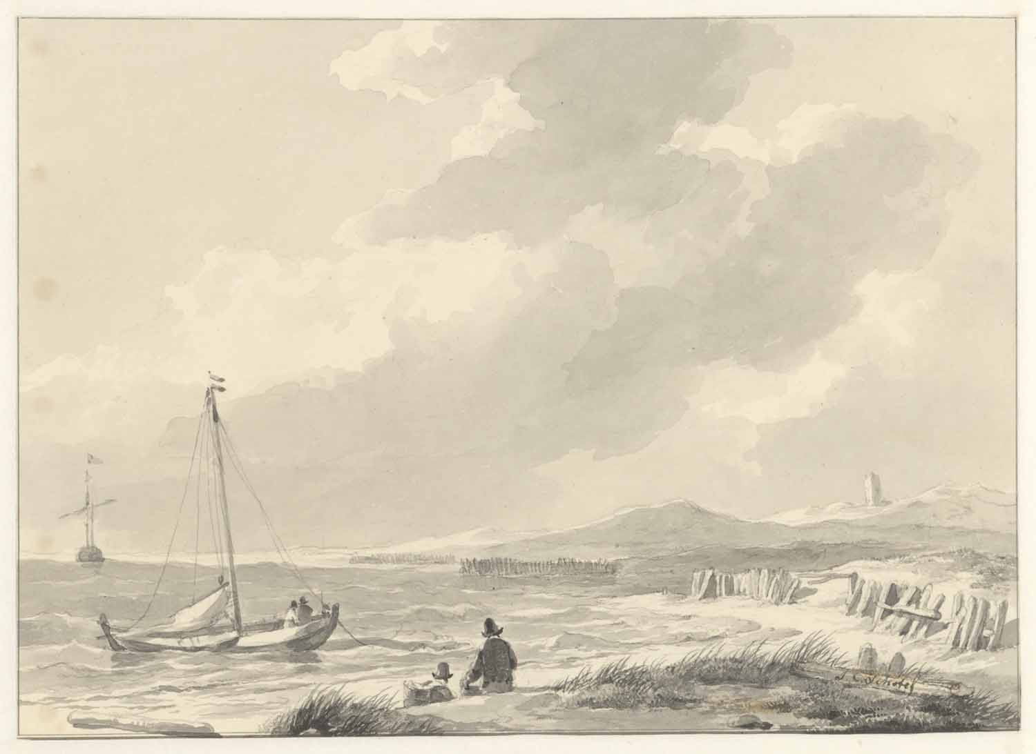 Eene vrouw bij eenen ezel in een duinachtig landschap