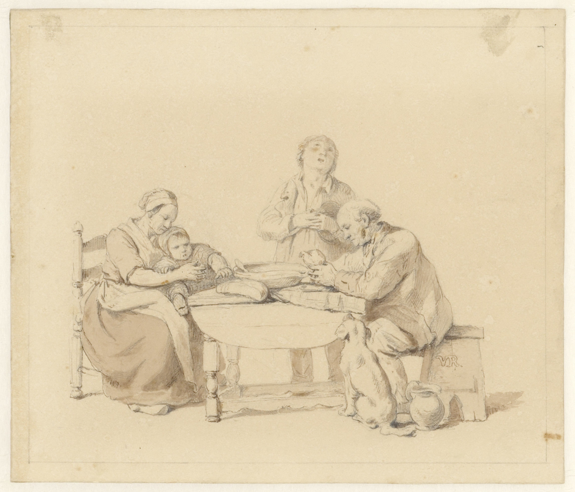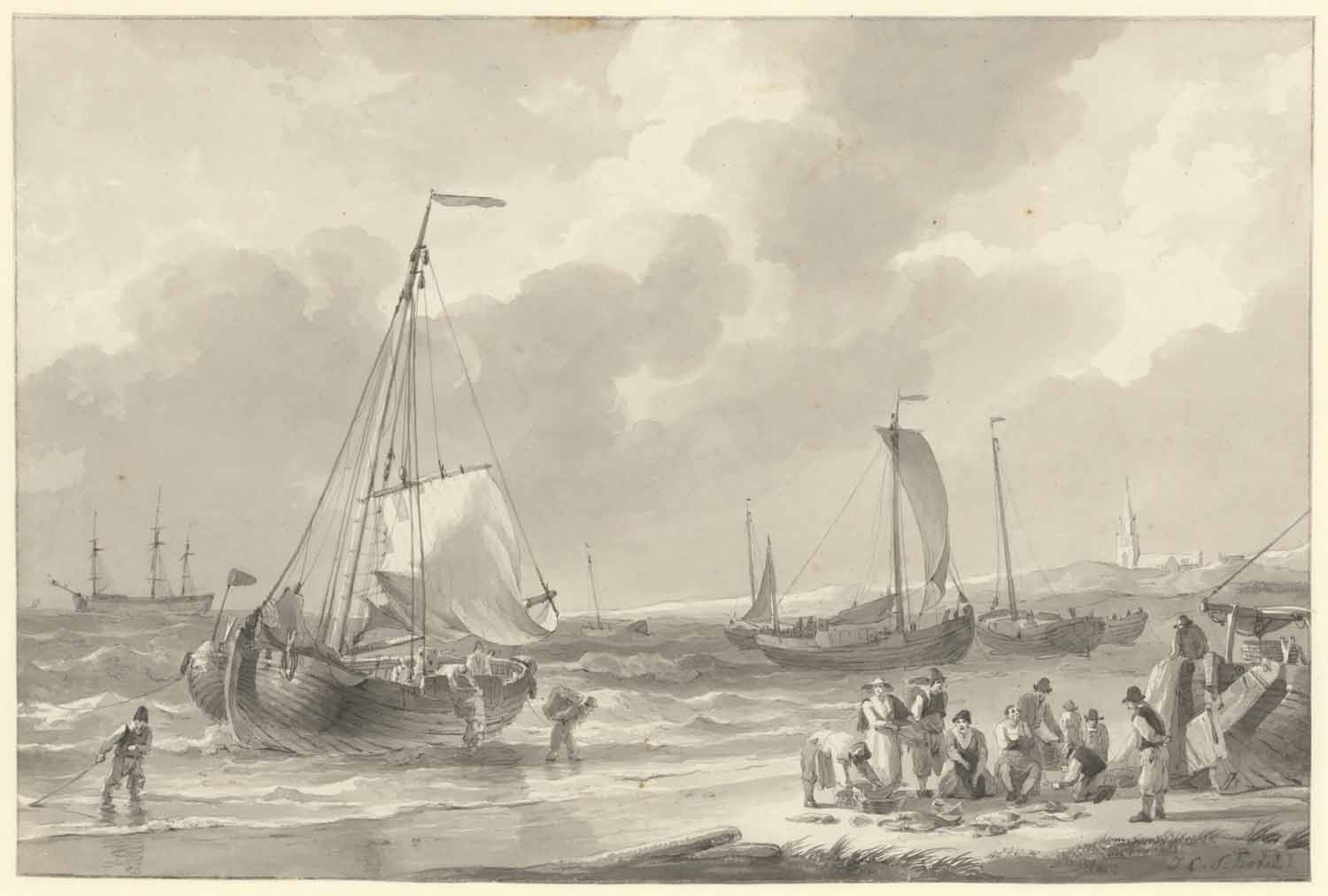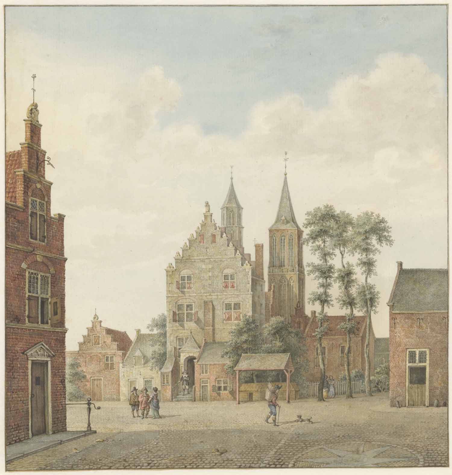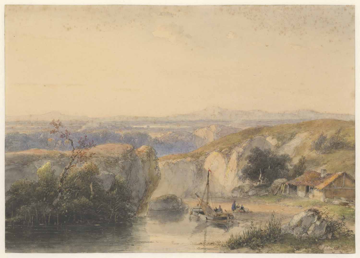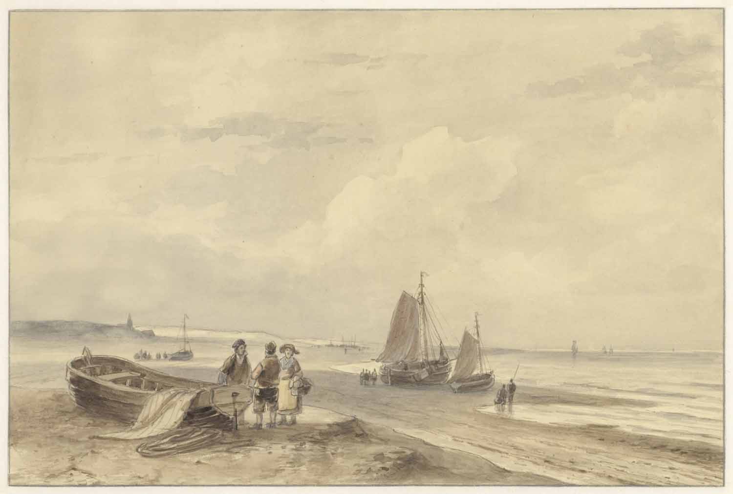 Eene vrouw bij eenen ezel in een duinachtig landschap