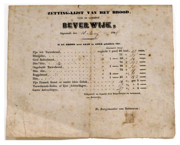 "Zetting-lijst van het brood voor de gemeente Beverw...