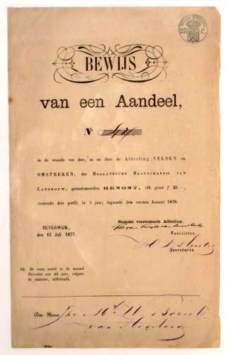 "Bewijs van aandeel t.n.v. Jhr. M.W. Boreel van Hoge...