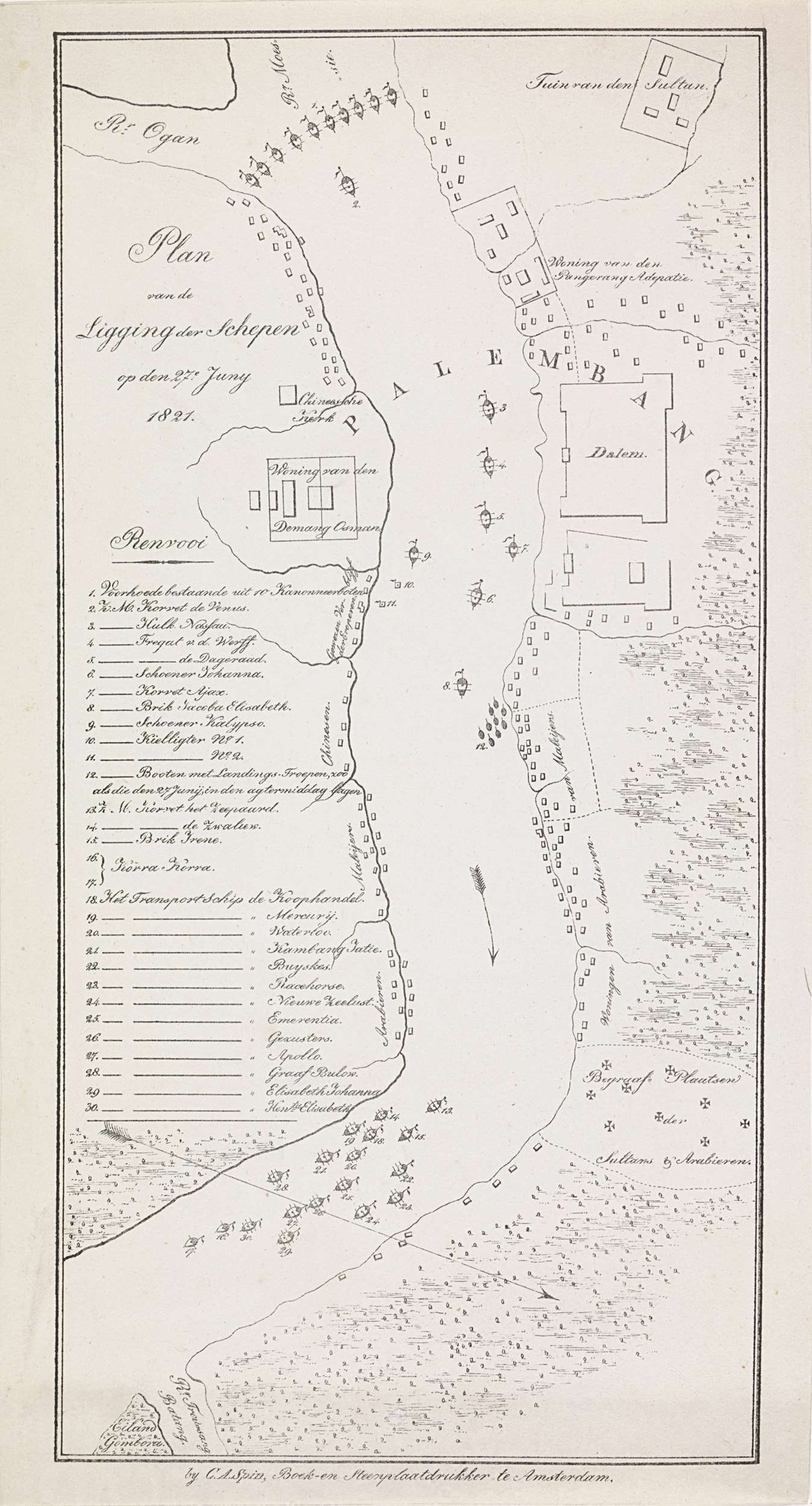 Kaart van de rivier bij Palembang, 1821