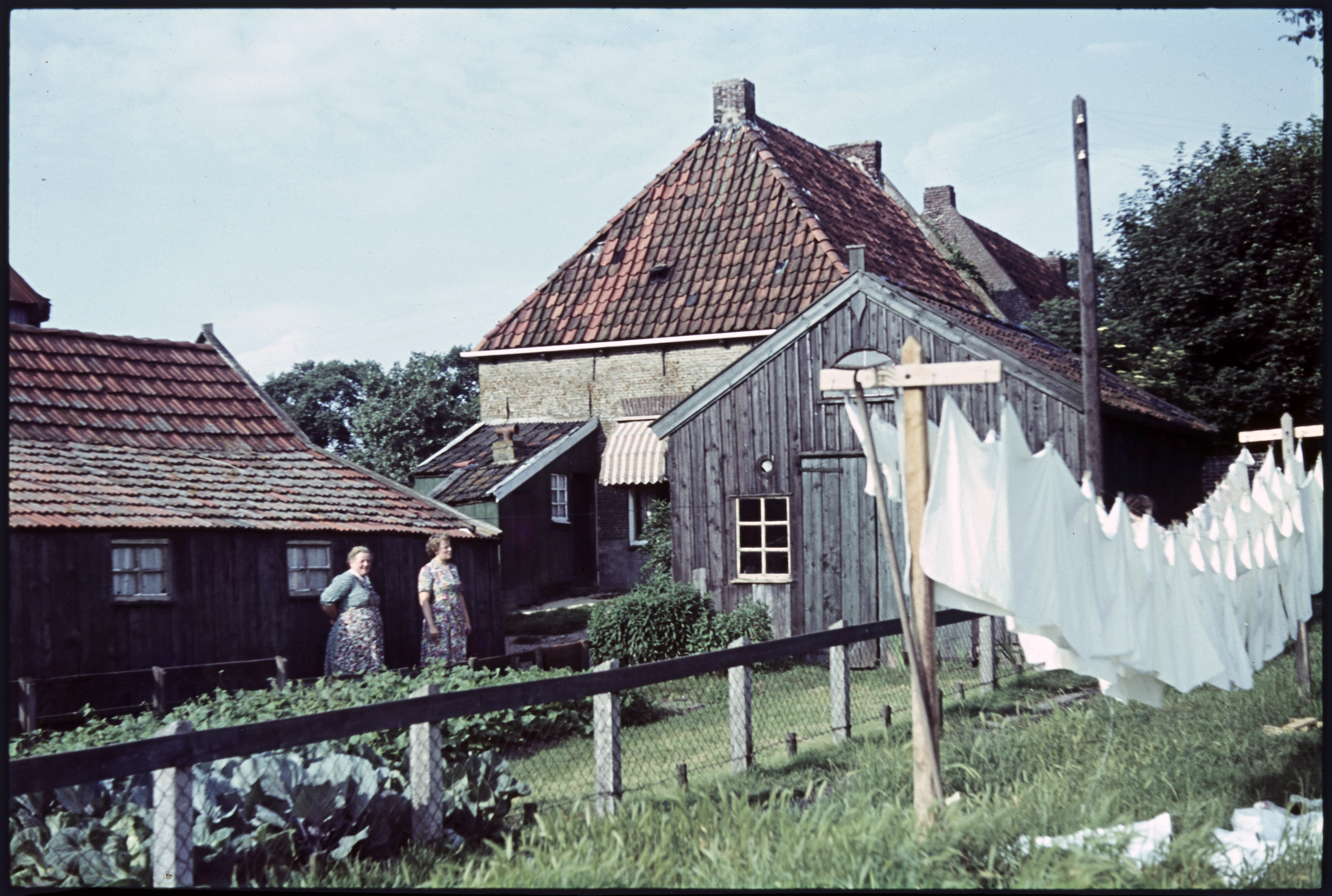 Vrouwen in klederdracht bij schuurtje met geopende h...