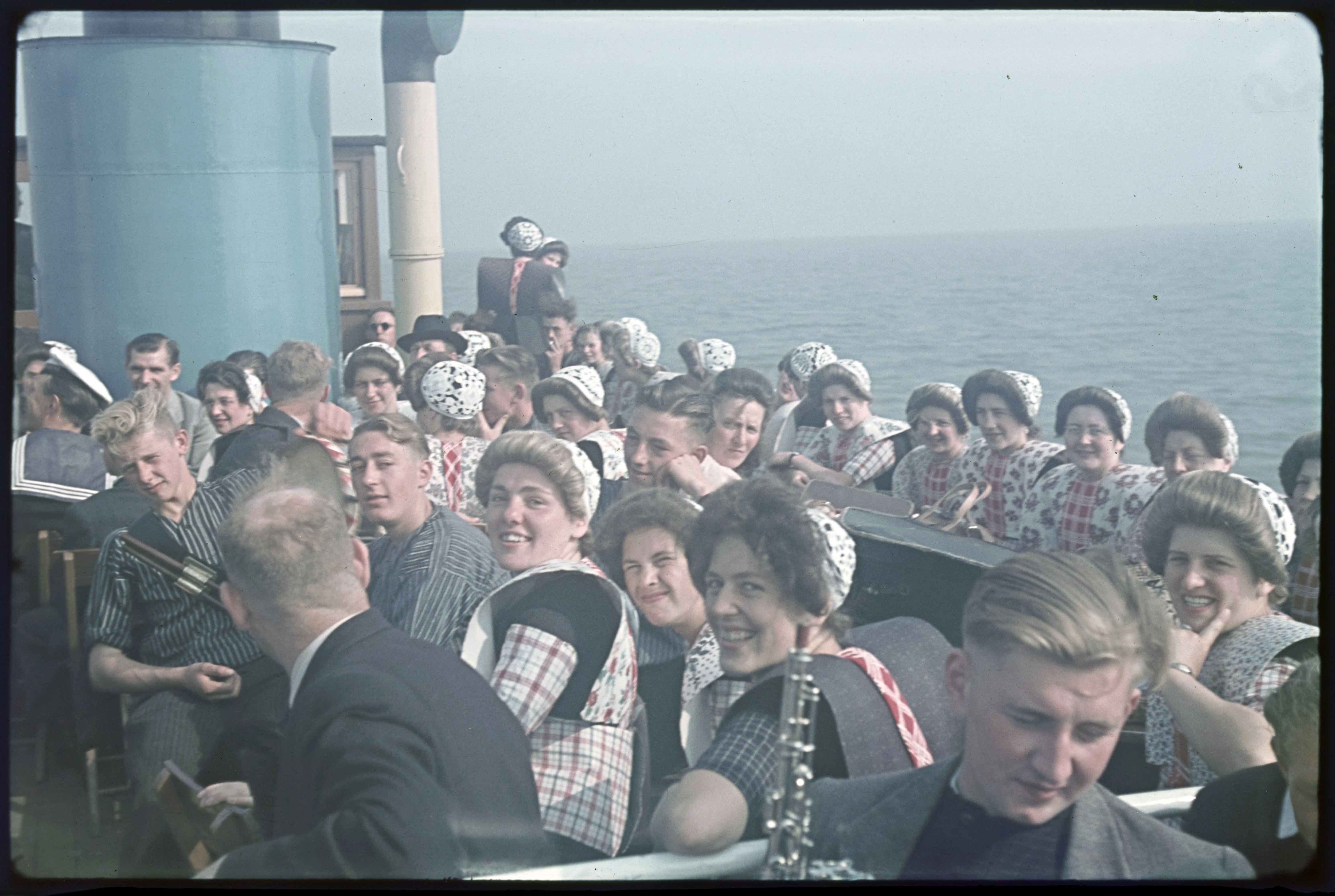 Vrouwen in klederdracht tijdens boottocht.