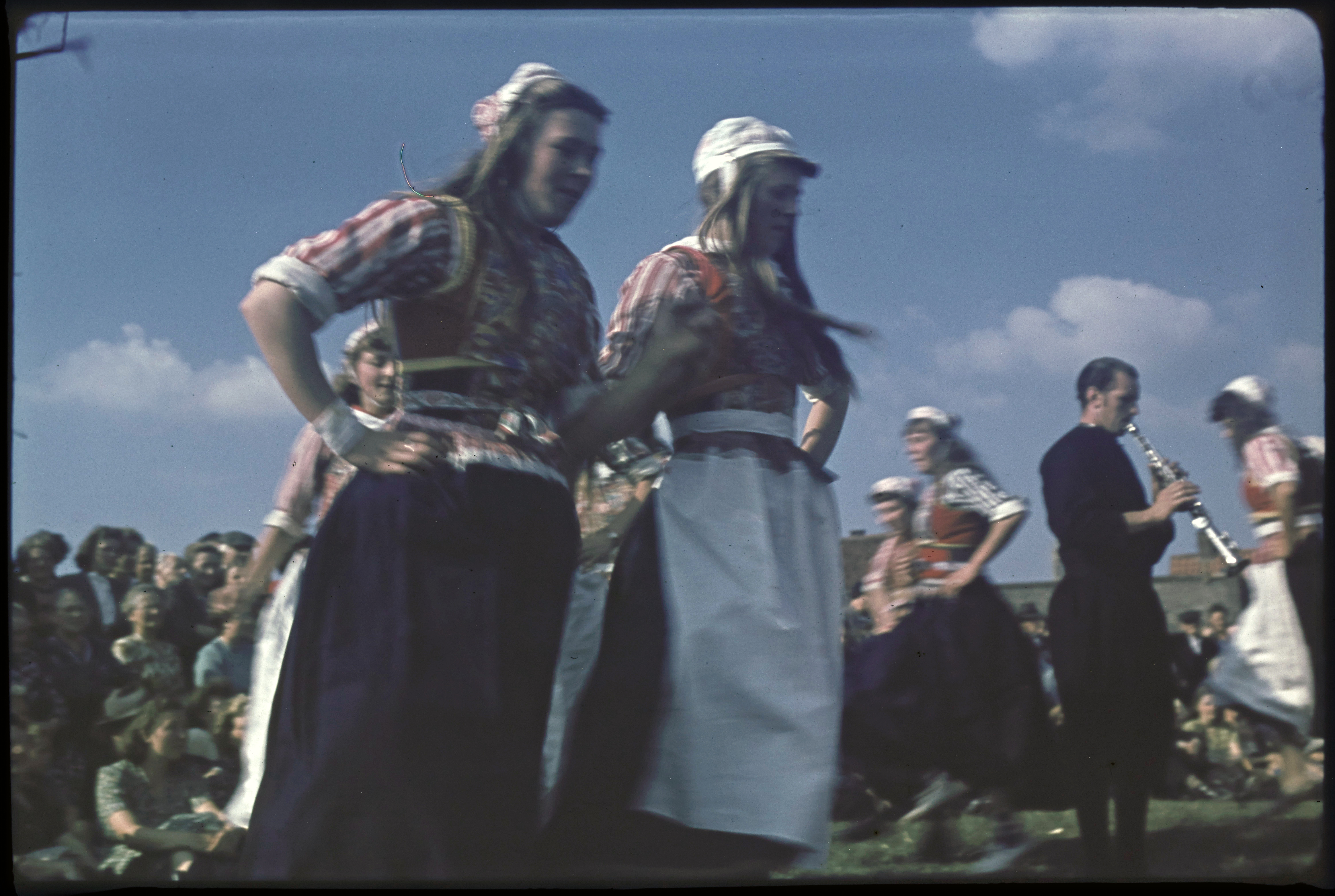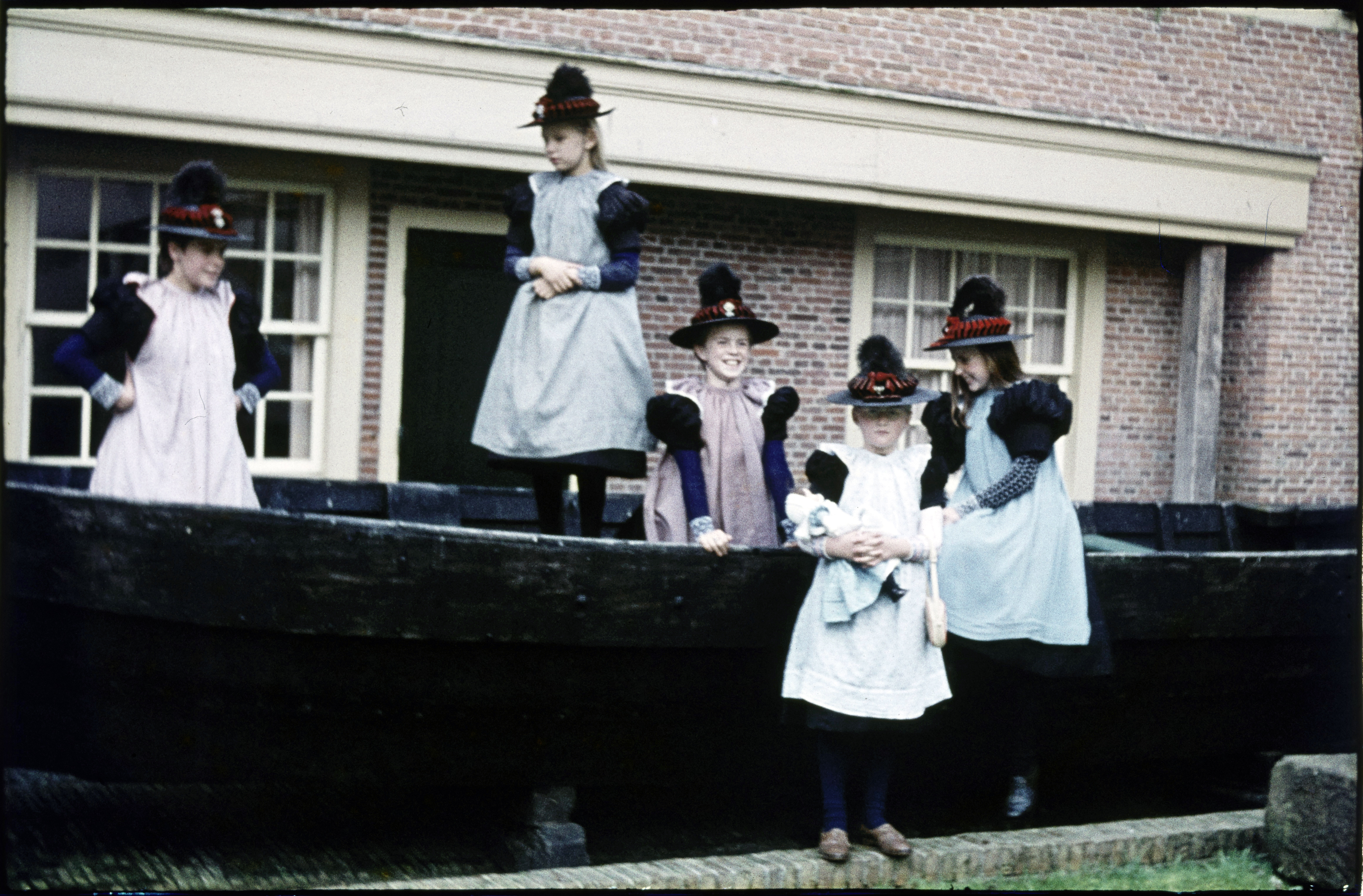 Meisjes in klederdracht met hoeden.