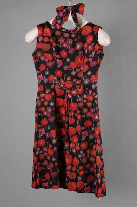 Getailleerde mouwloze zwarte japon, met rode, roze e...