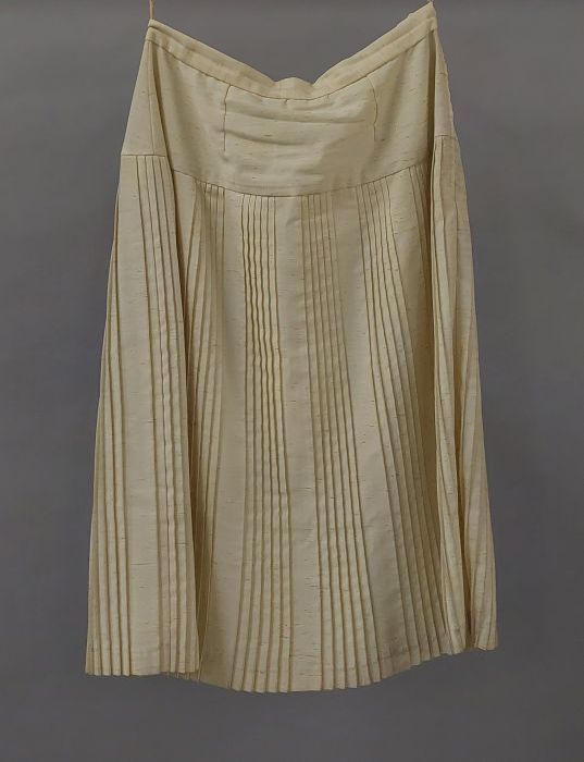 Crèmekleurige deux-pièces, mouwloos lijfje met pliss...