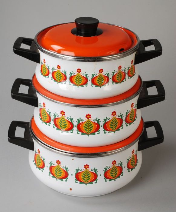 Pan wit met oranje deksel en uivormige decoratie in ...
