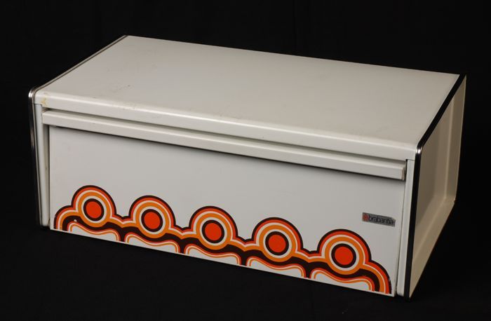 Witte broodtrommel met oranje en bruine decoratie, m...