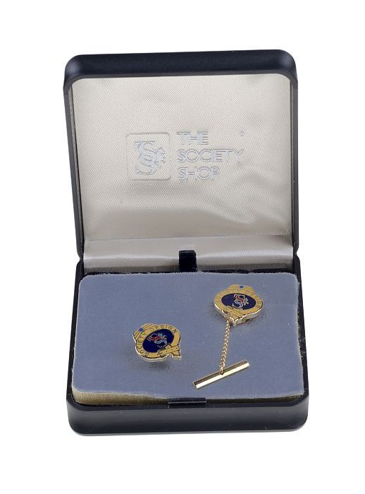 Goudkleurige manchetknoop en bijpassende speld met e...