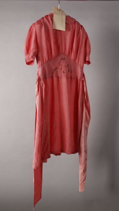 Roze kinderjurk met groen-geel borduursel, korte pof...