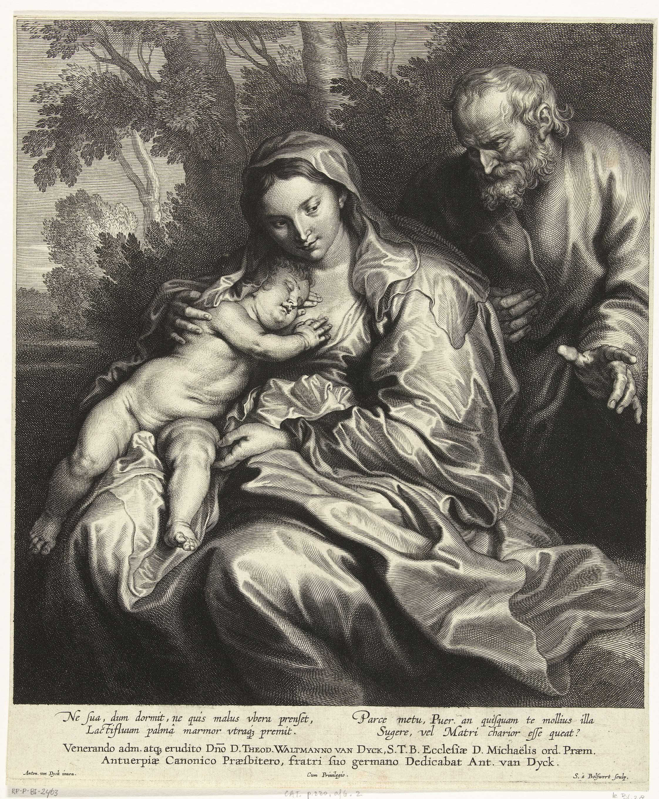 Christuskind loopt tussen Maria en Jozef met boven h...