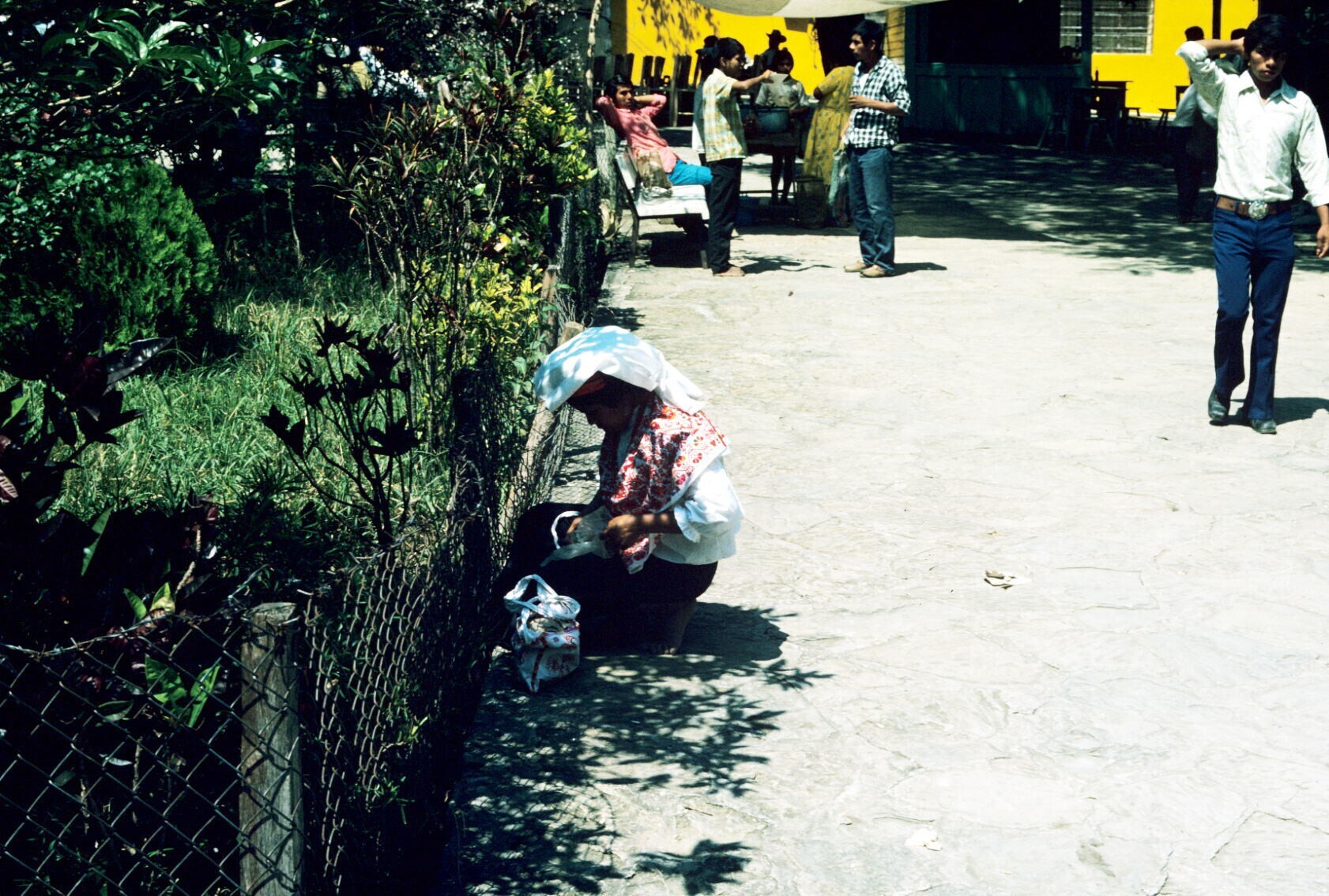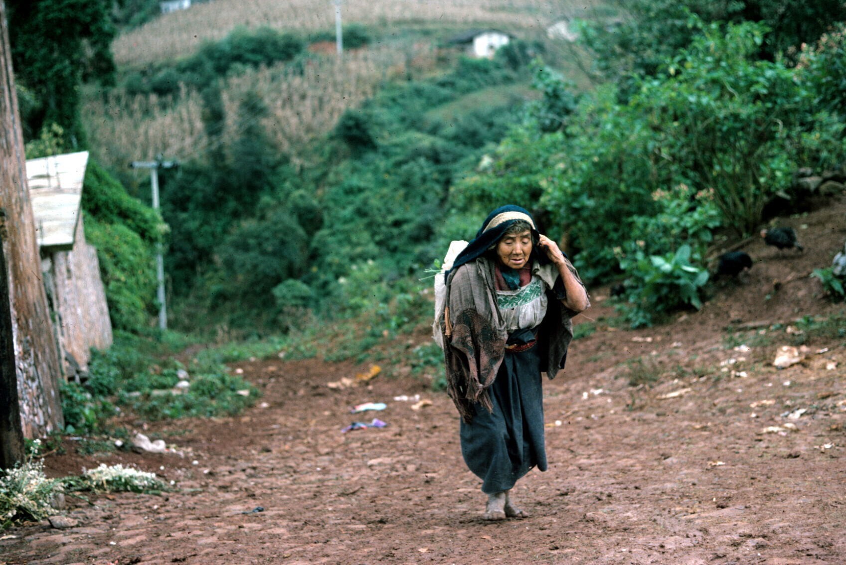 vrouw, last dragend met tumpline, bij milpa (akker)