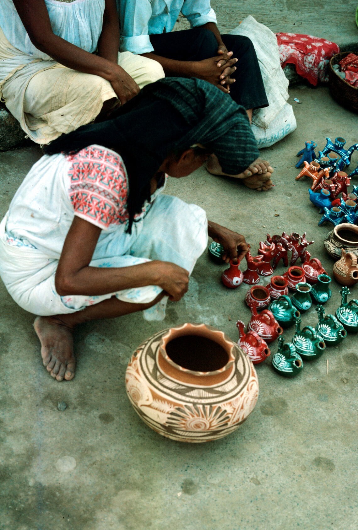 koopvrouwen met aardewerk, o.a. uit Chililico, op markt