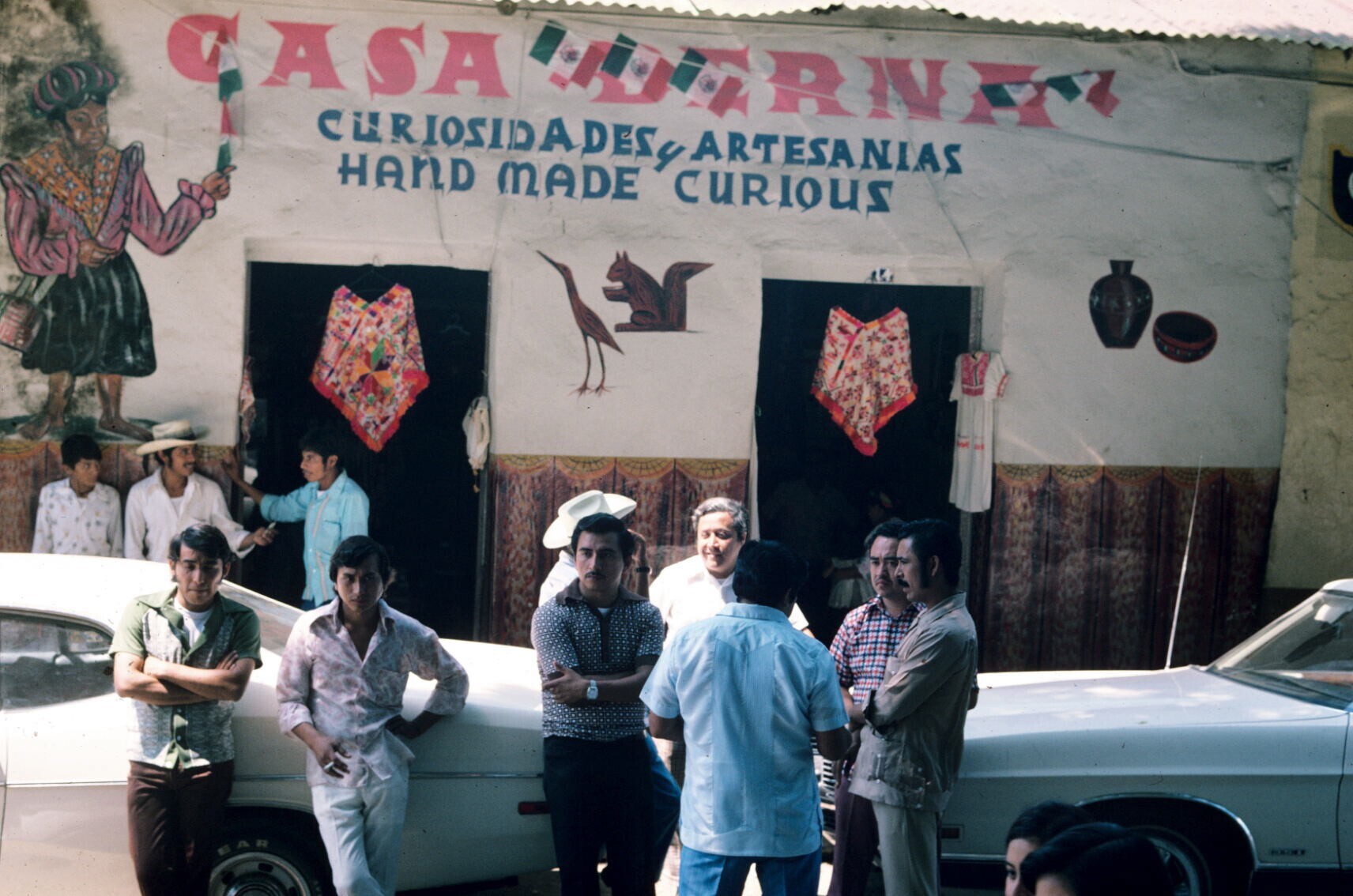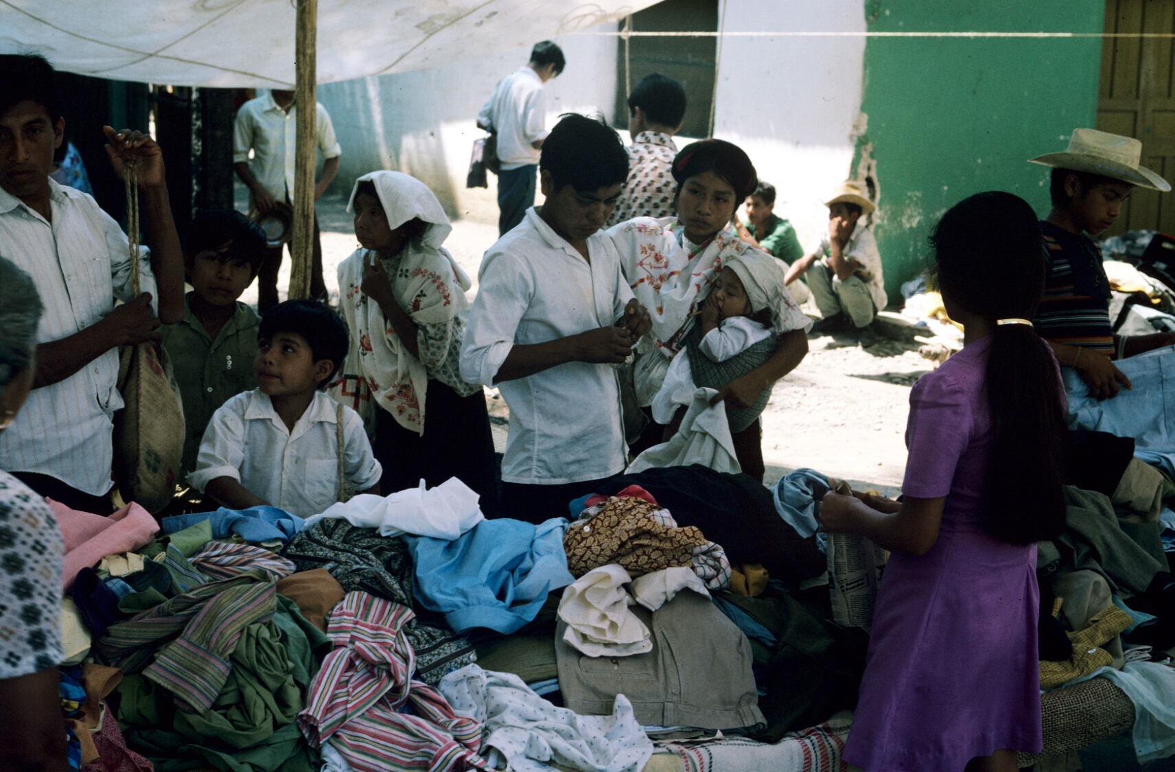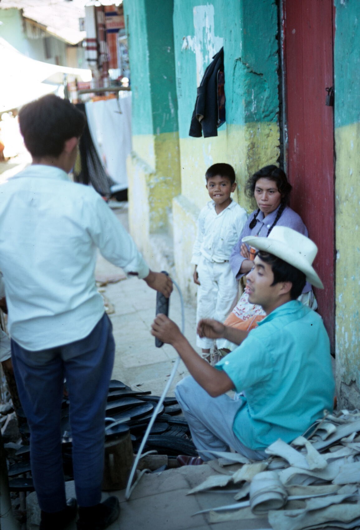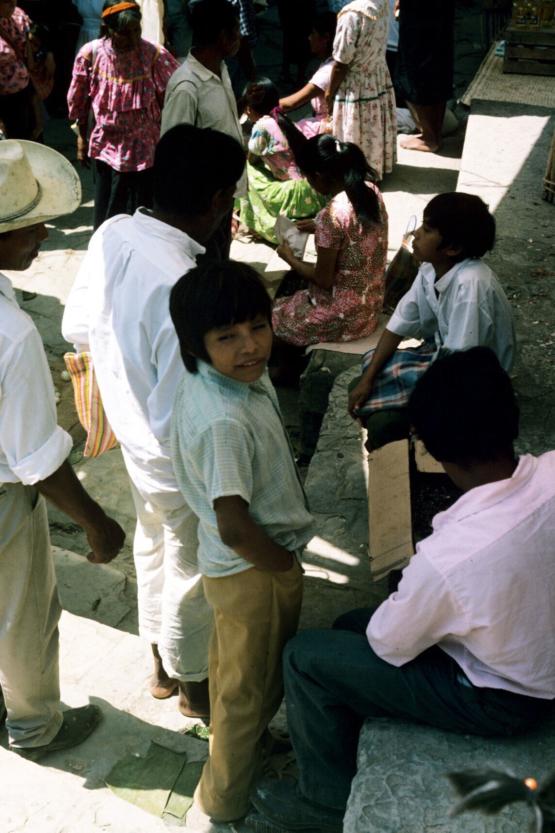 mannen in traje indio op markt; op voorgrond: aardewerk