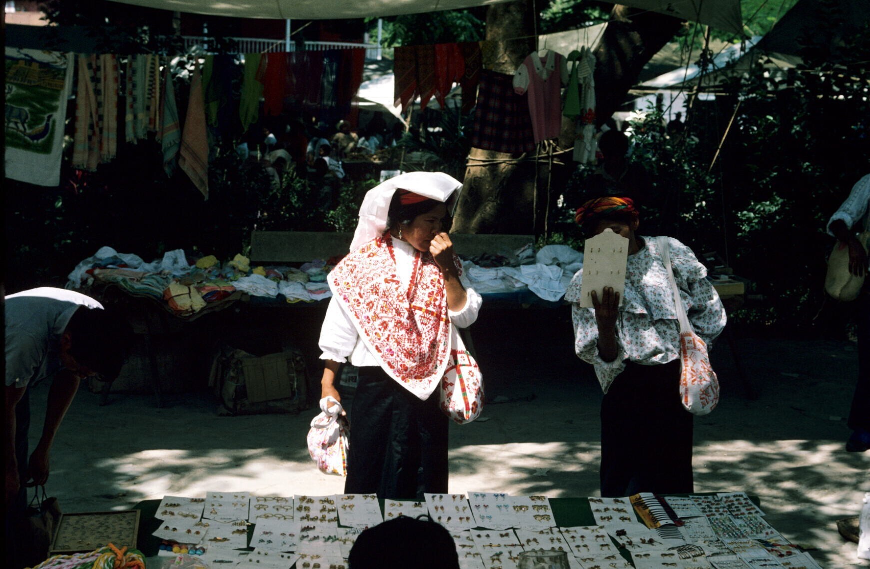 vrouwen op markt; op voorgrond o.a. "paltel"-(tasjes...
