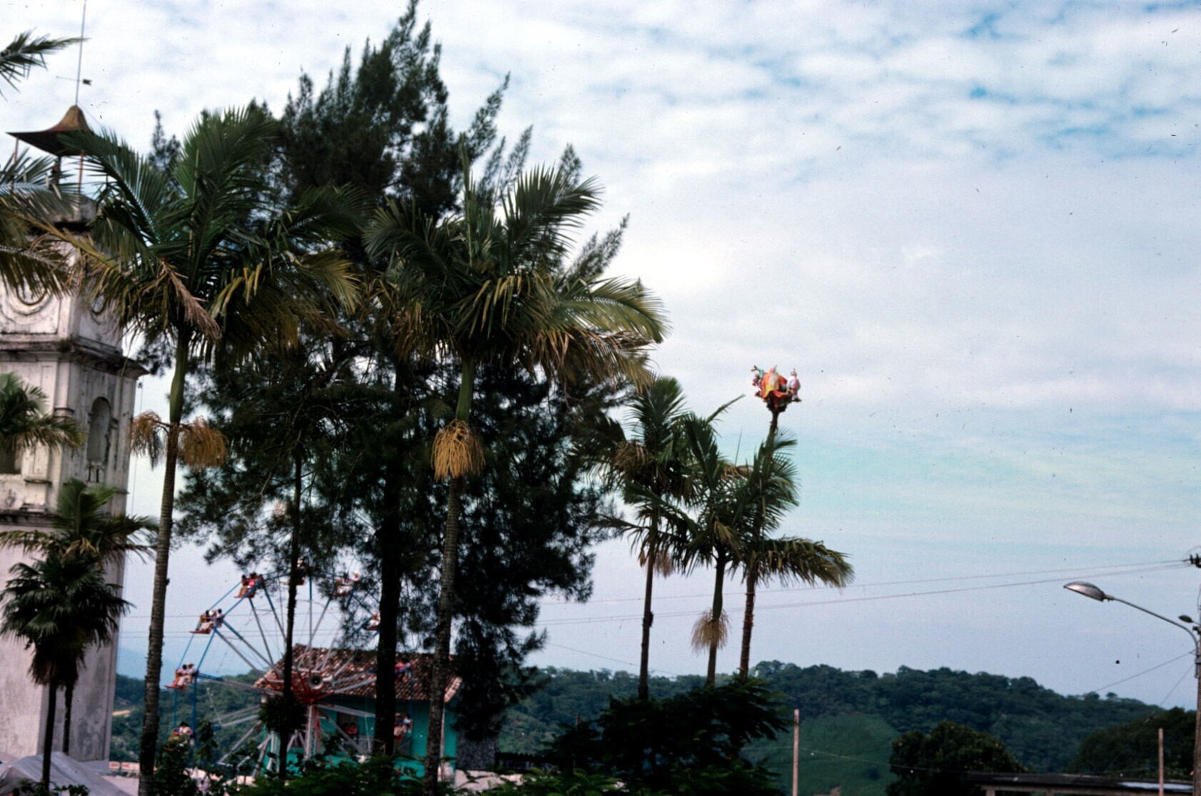 gezicht op plein, met kerk en 'palo de voladores'