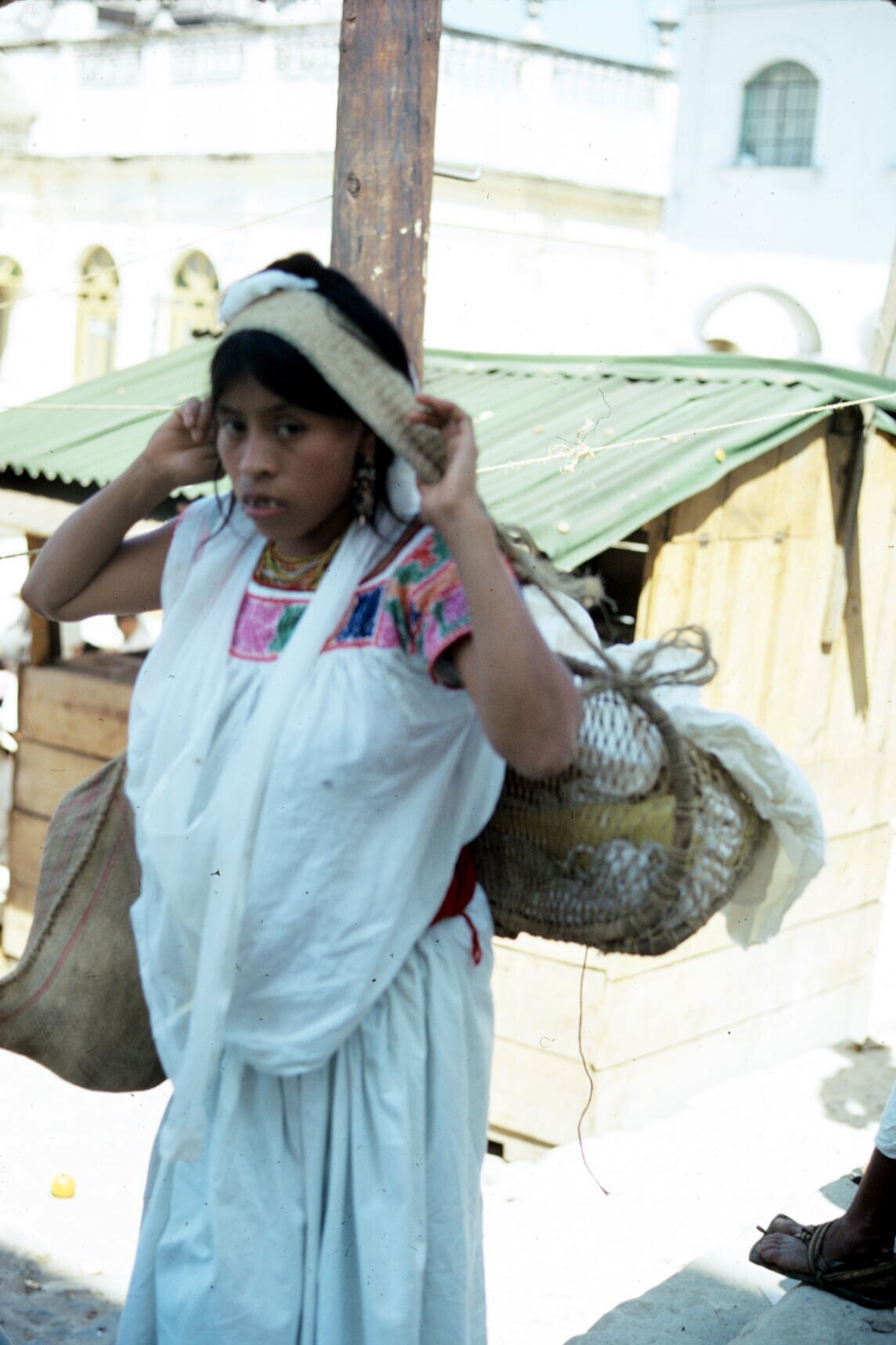 vrouw, last dragend met tumpline, op markt