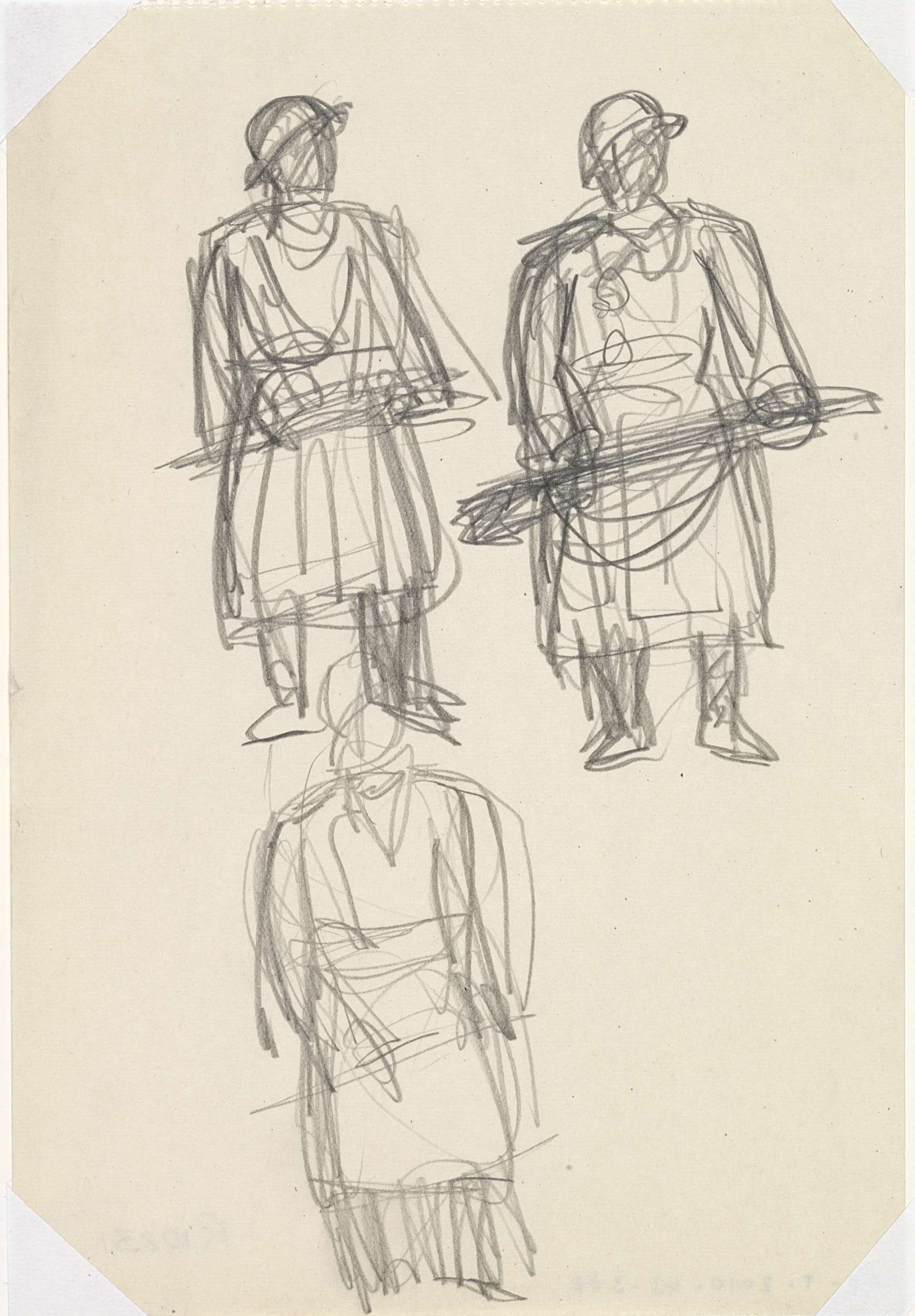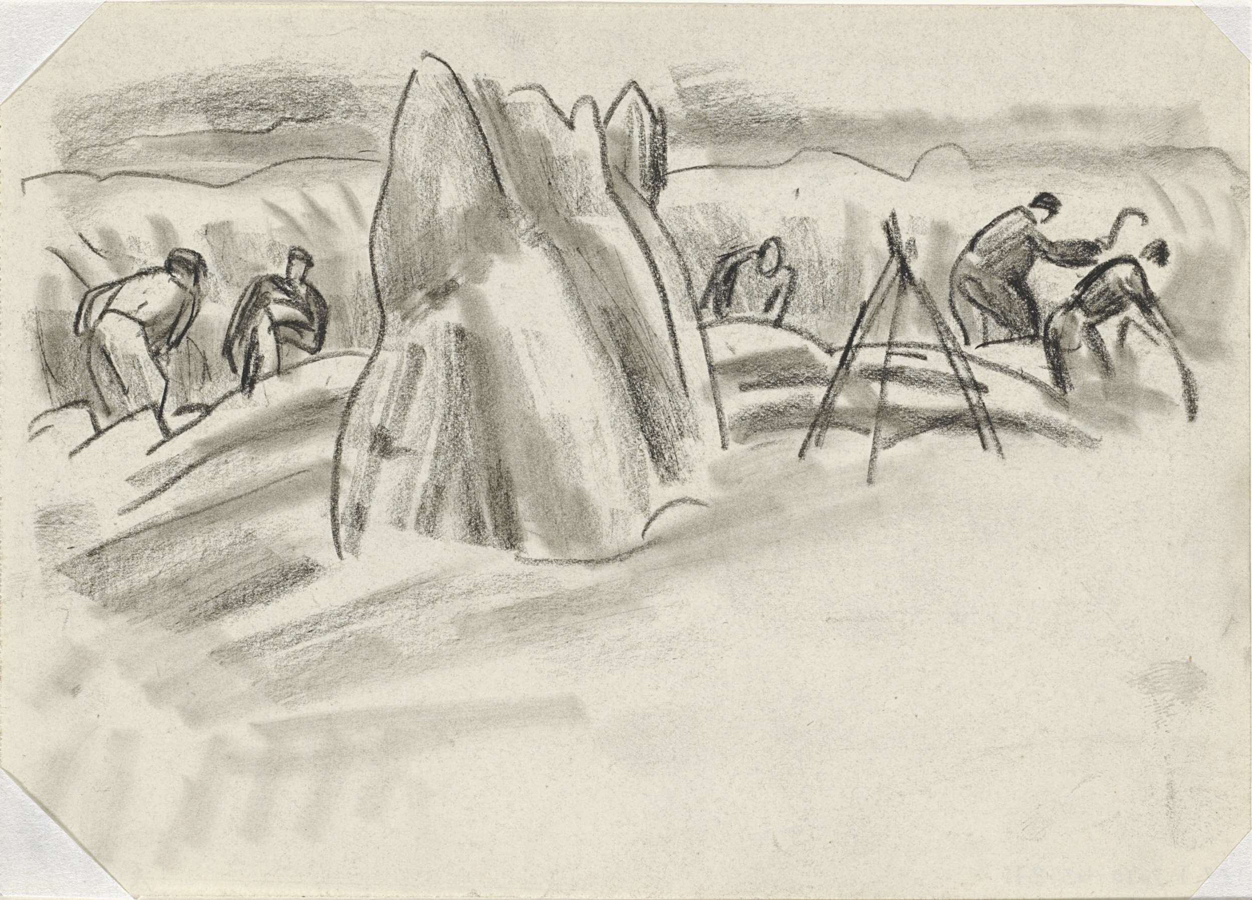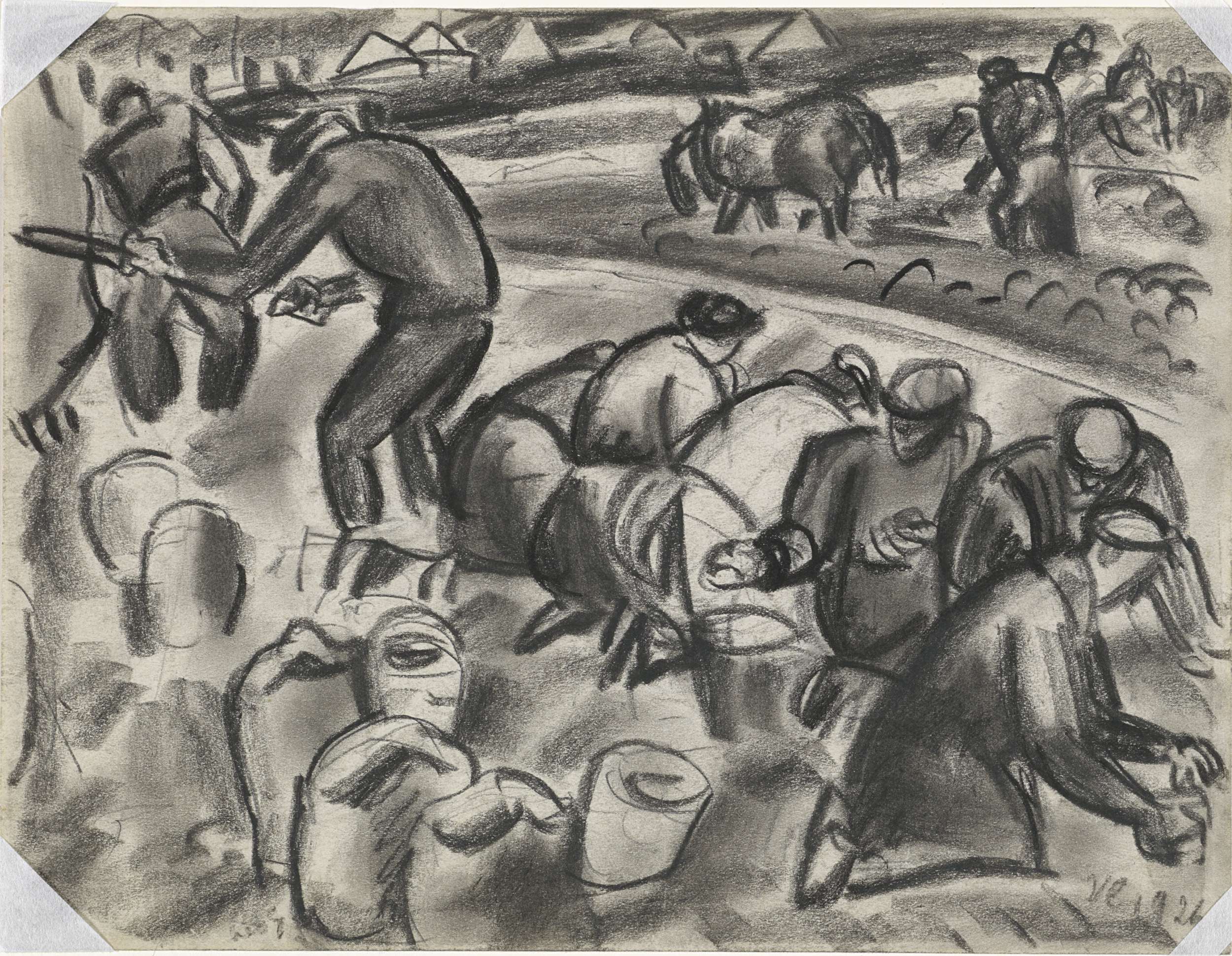 Studieblad met 6 schetsjes van knielende aardappelro...