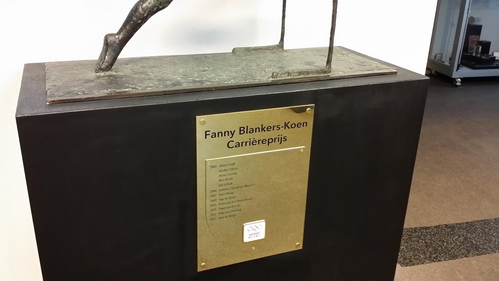 Beeld hordeloopster Fanny Blankers-Koen met namenpla...